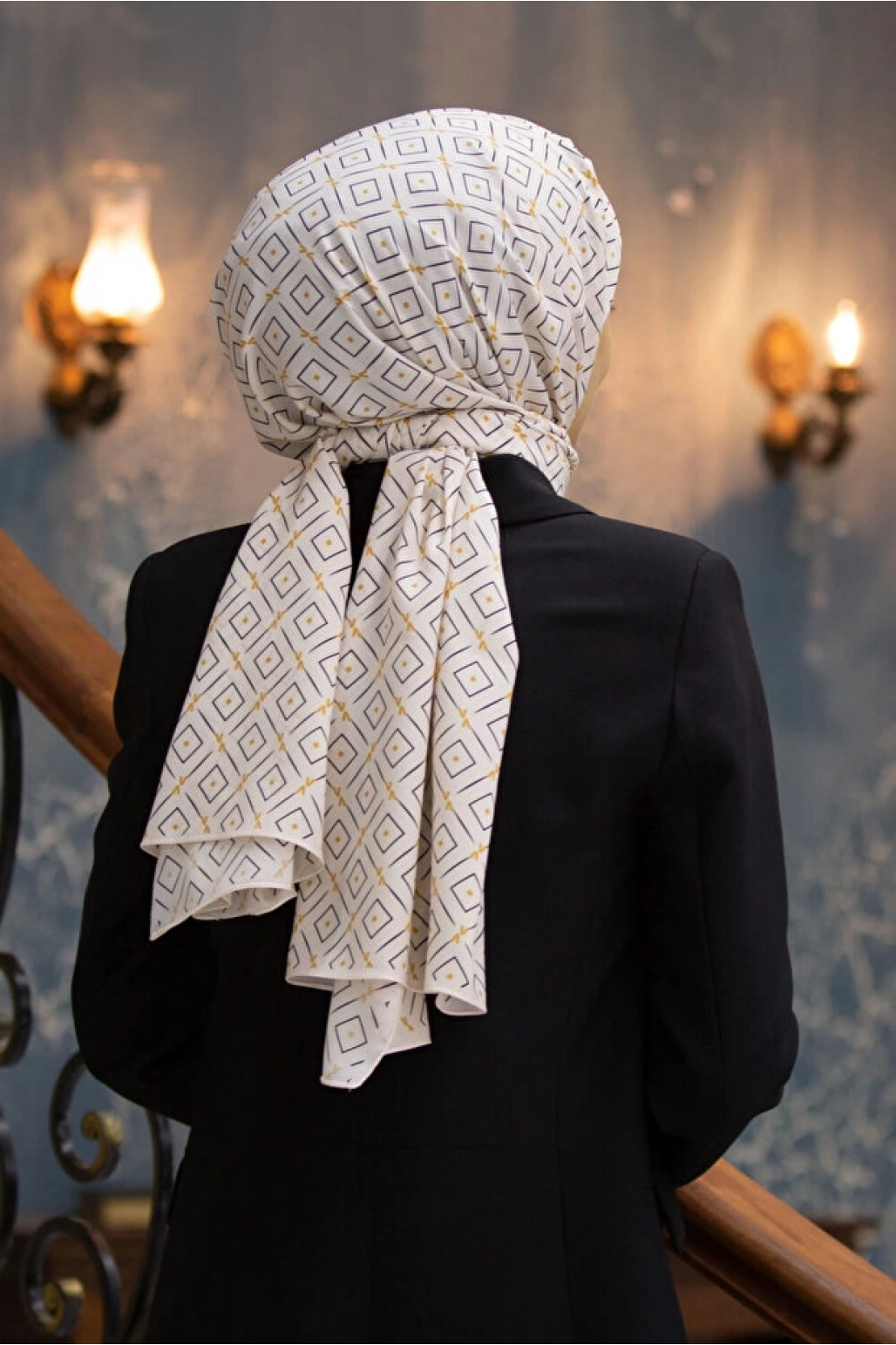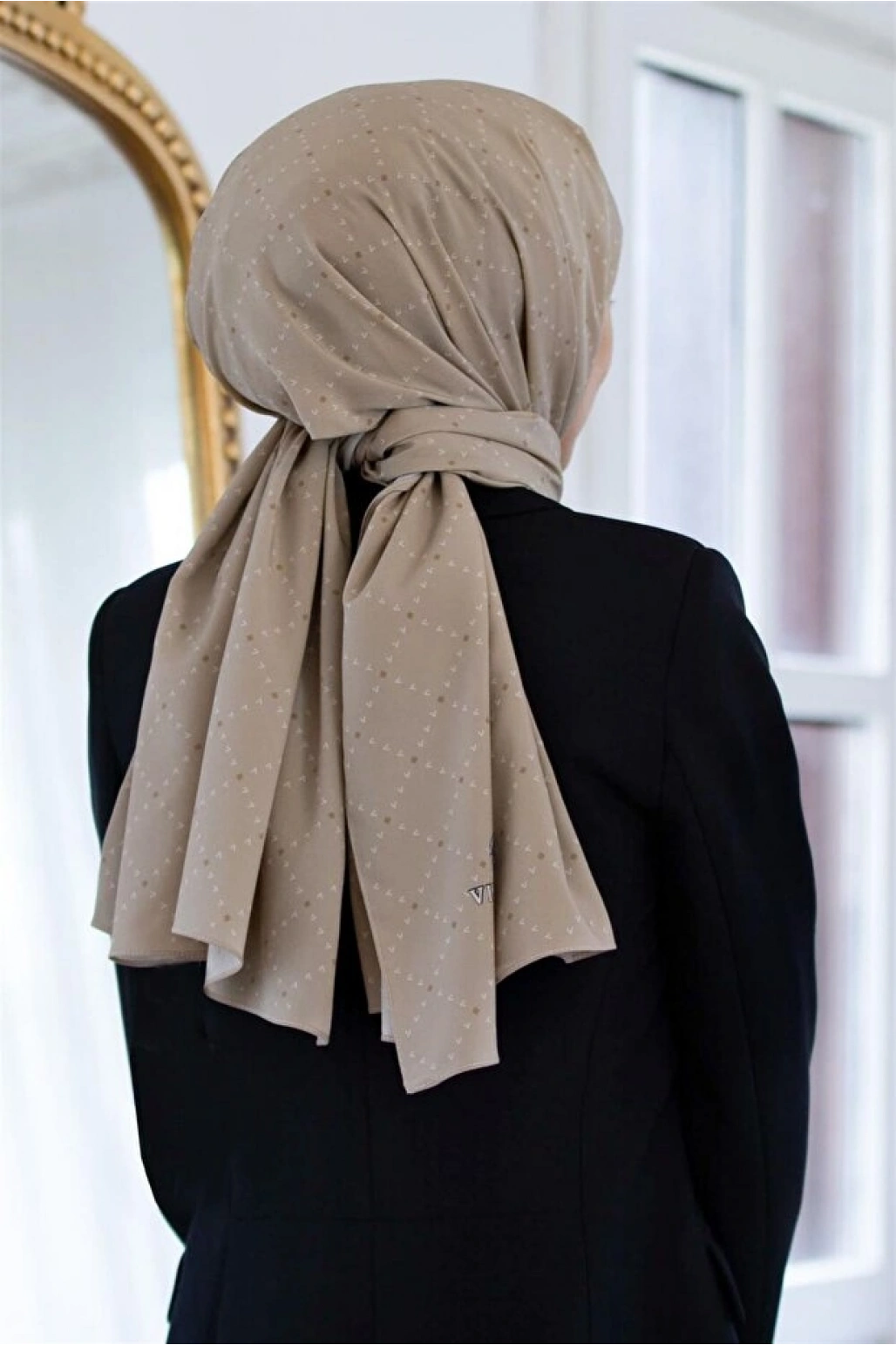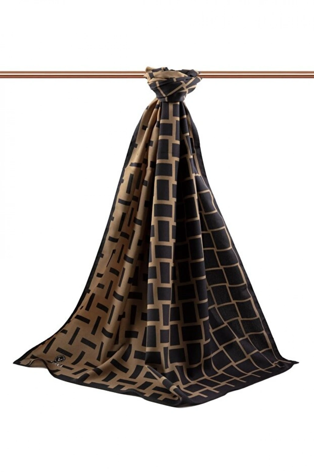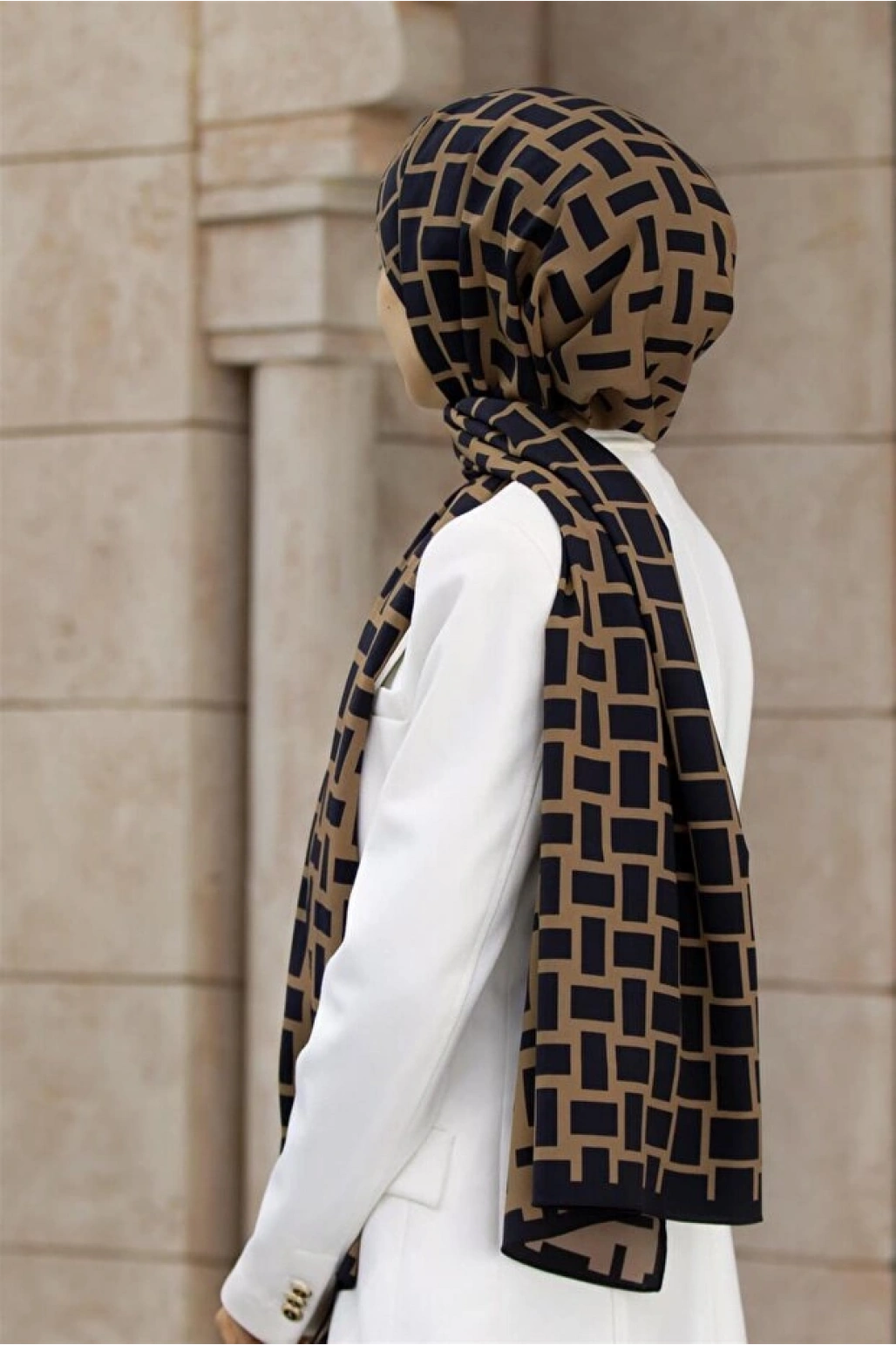 Vissona LÜKS MEDİNE İPEĞİ GEOMETRİK DESENLİ BEJ RENKLİ 75X195 KIRIŞMAZ ŞAL MOSS KREP DİKİŞ TİPİ İTALYAN DİKİ