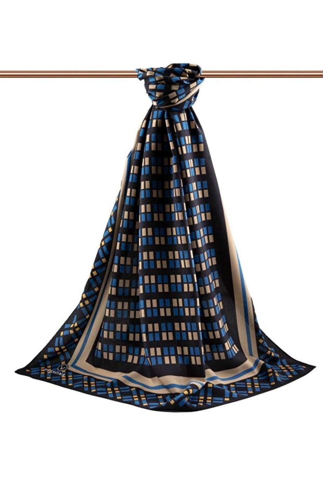 Vissona LÜKS MEDİNE İPEĞİ KARE DESENLİ İNDİGO RENKLİ 75X195 KIRIŞMAZ ŞAL MOSS KREP DİKİŞ TİPİ İTALYAN DİKİŞ