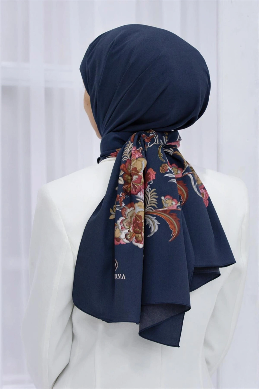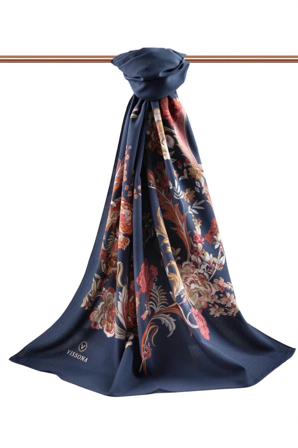 Vissona LÜKS MEDİNE İPEĞİ NAKIŞ ÇİÇEK DESENLİ LACİVERT RENKLİ 75X195 KIRIŞMAZ ŞAL MOSS KREP DİKİŞ TİPİ İTALY