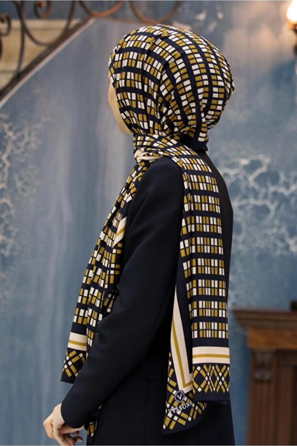 Vissona LÜKS MEDİNE İPEĞİ V DESENLİ LACİVERT RENKLİ 75X195 KIRIŞMAZ ŞAL MOSS KREP DİKİŞ TİPİ İTALYAN DİKİŞLİ