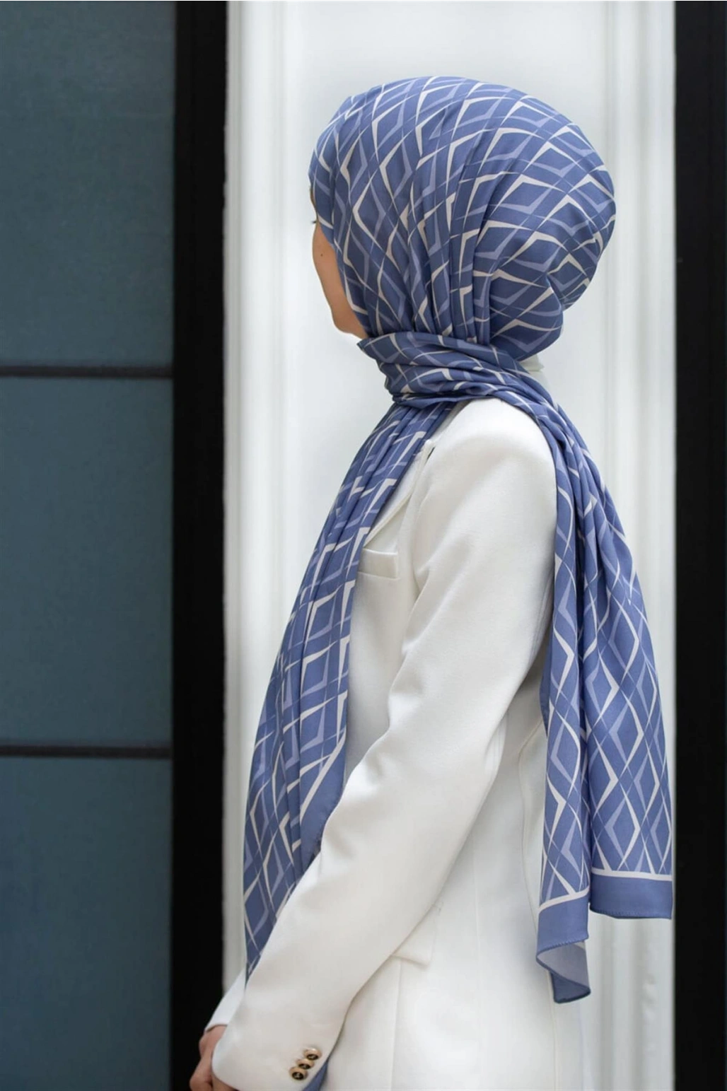 Vissona LÜKS MEDİNE İPEĞİ GEOMETRİK DESENLİ BEBE MAVİSİ RENKLİ 75X195 KIRIŞMAZ ŞAL MOSS KREP DİKİŞ TİPİ İTAL