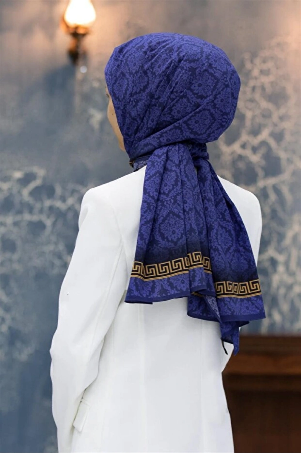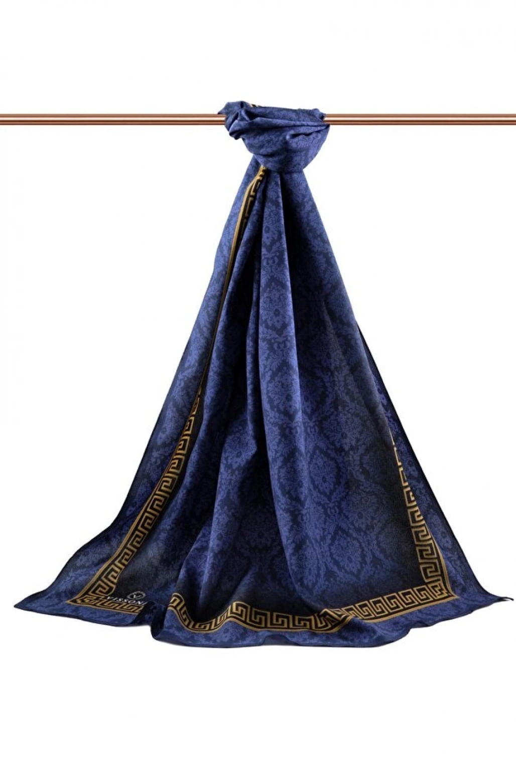 Vissona LÜKS MEDİNE İPEĞİ GOLD DETAYLI BAROK DESENLİ LACİVERT RENKLİ 75X195 KIRIŞMAZ ŞAL MOSS KREP DİKİŞ TİP