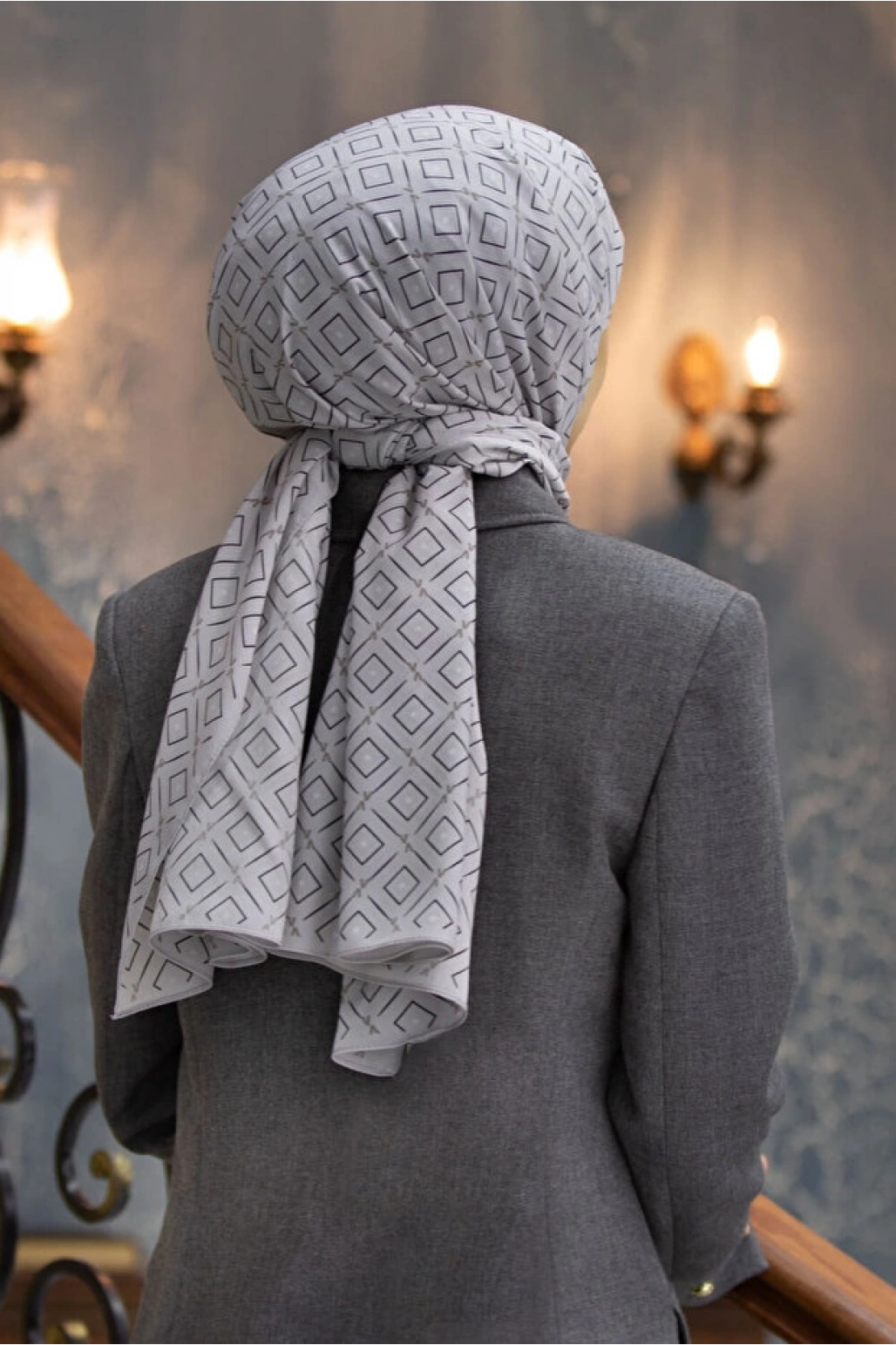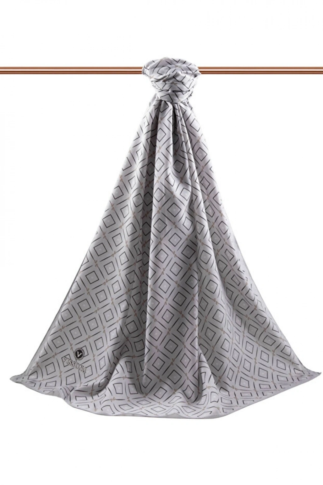 Vissona LÜKS MEDİNE İPEĞİ GEOMETRİK DESENLİ GÜMÜŞ RENKLİ 75X195 KIRIŞMAZ ŞAL MOSS KREP DİKİŞ TİPİ İTALYAN
