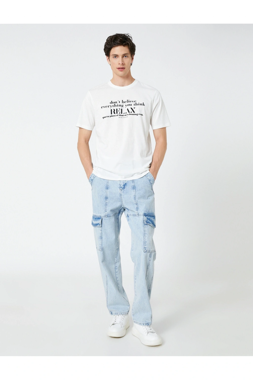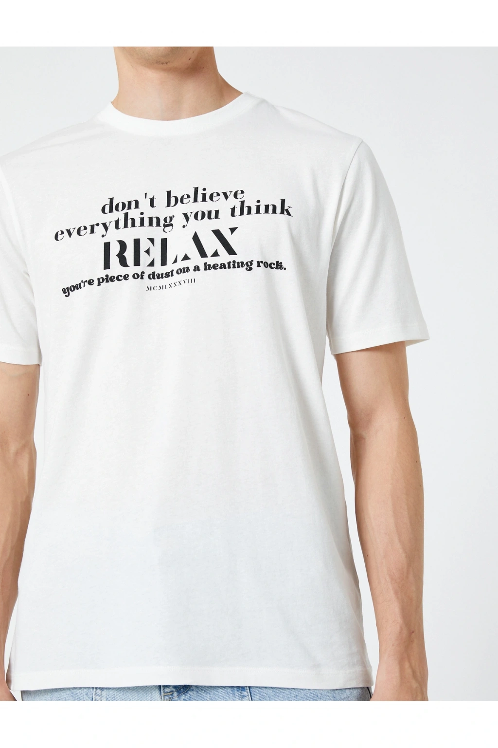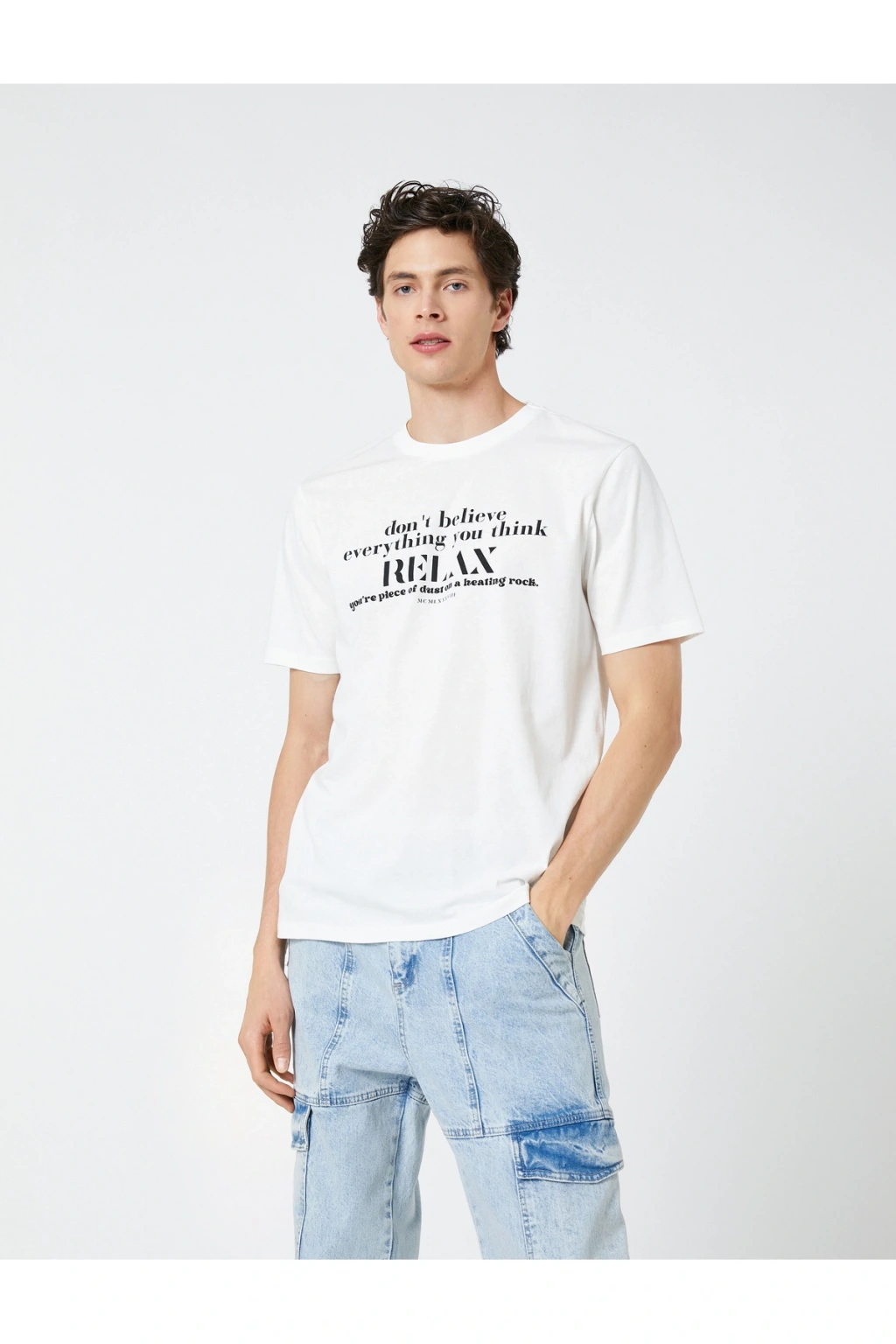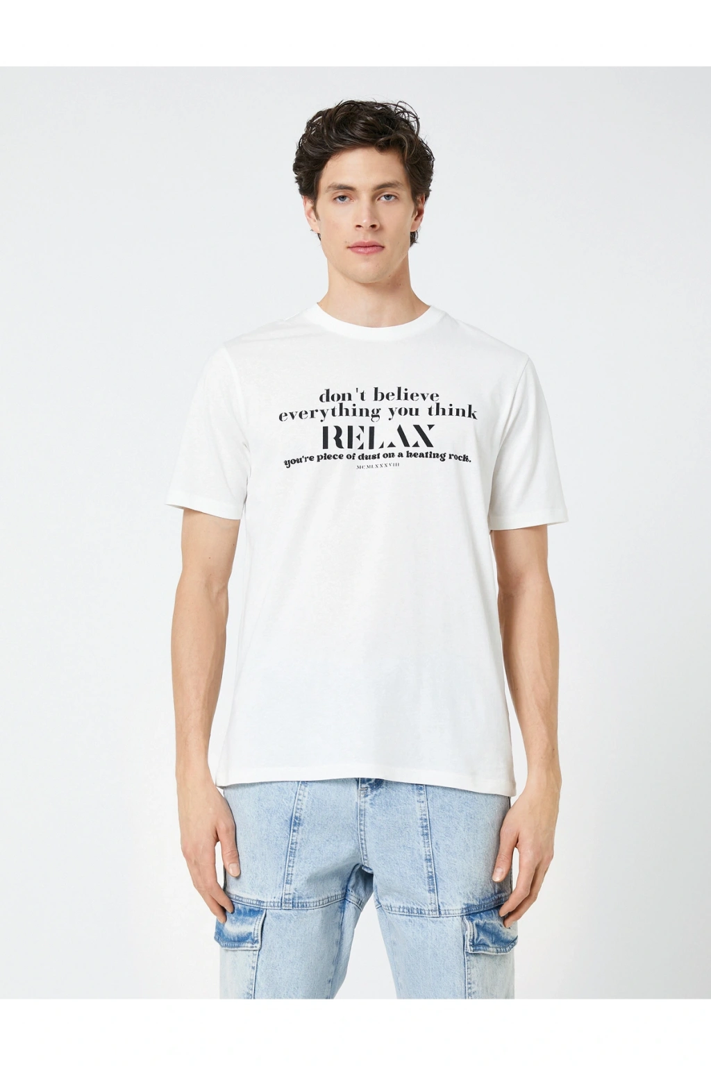 Tişörtleriniz aracılığı ile sesinizi duyurmaya ne dersiniz? Slogan baskılı, bisiklet yaka, kısa kollu tişört Koton'un eğlenceli, slogan baskılı erkek tişört modelleri içinde en sevilen parçalar arasında.; | Model Boy: 189 | Model Kalça: 95 | Model Üst: 78 | Model Bel: L | Model Göğüs: 91 | Model Jean: 30/32