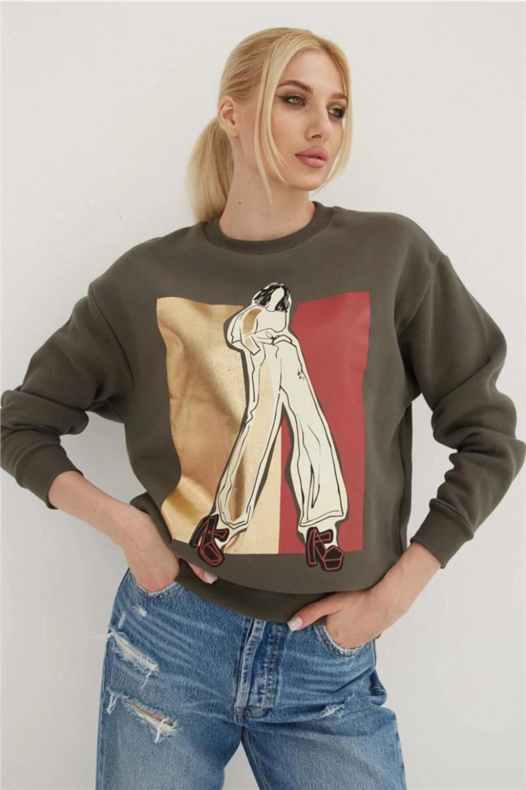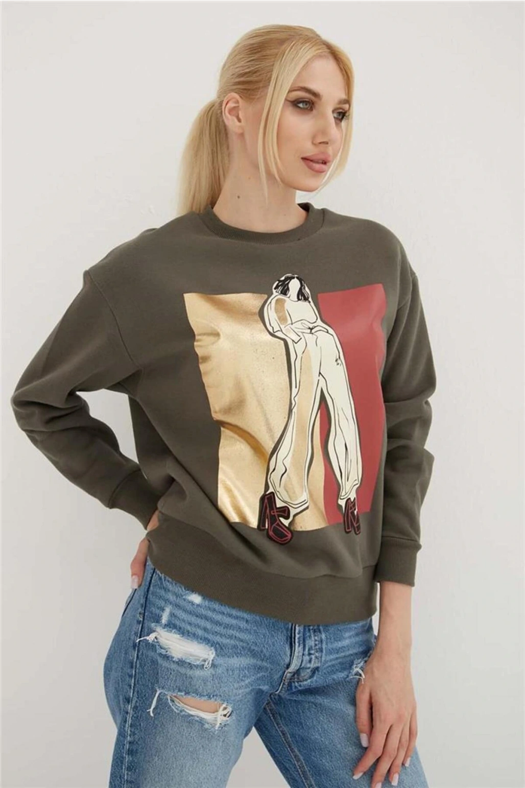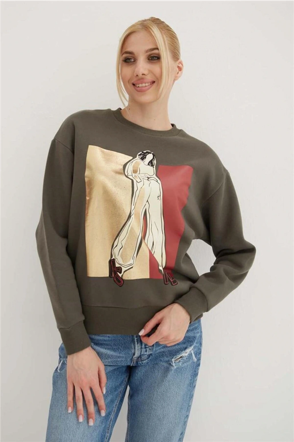 Baskılı Sweatshirt Uzun Kollu Bisiklet Yaka