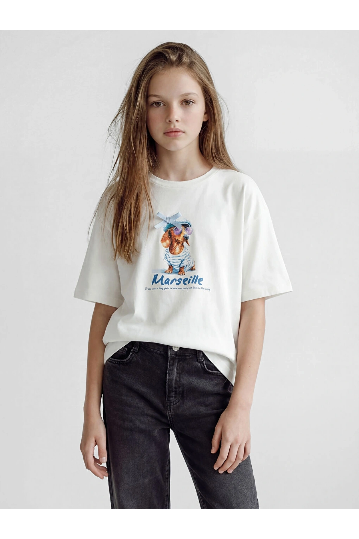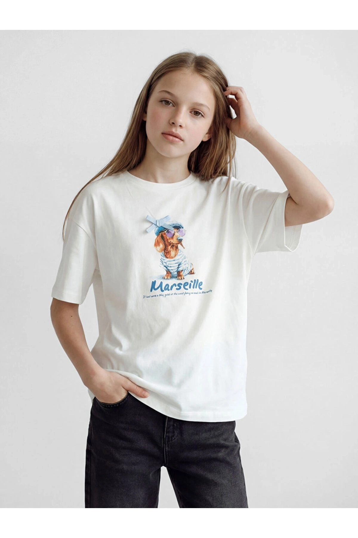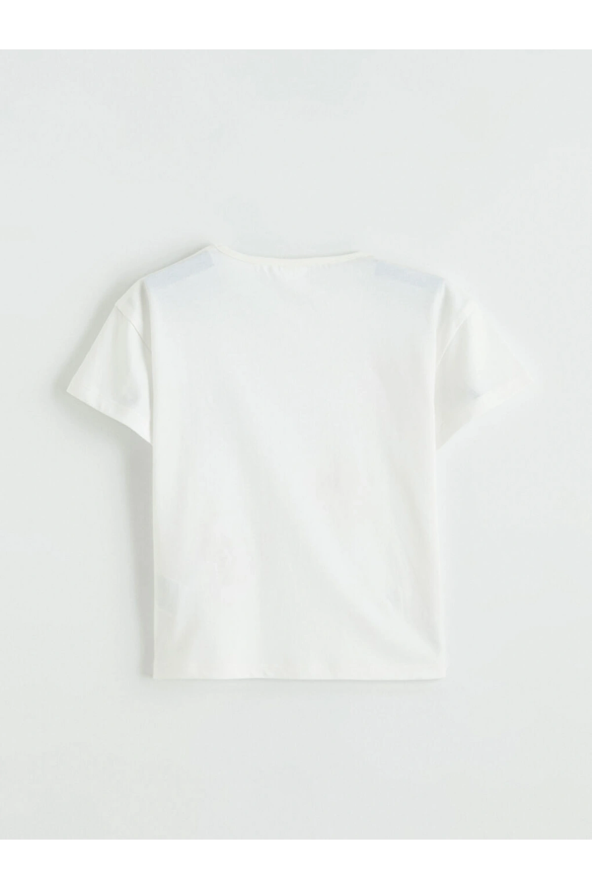 LCW Kids Beyaz Bisiklet Yaka Baskılı Kız Çocuk Tişört