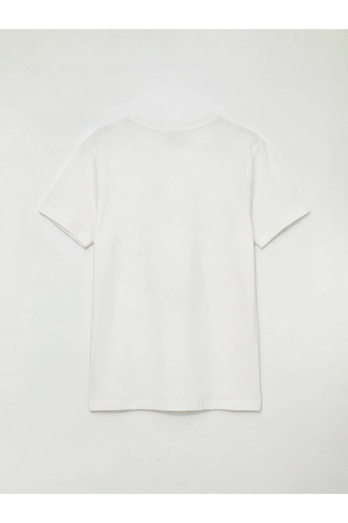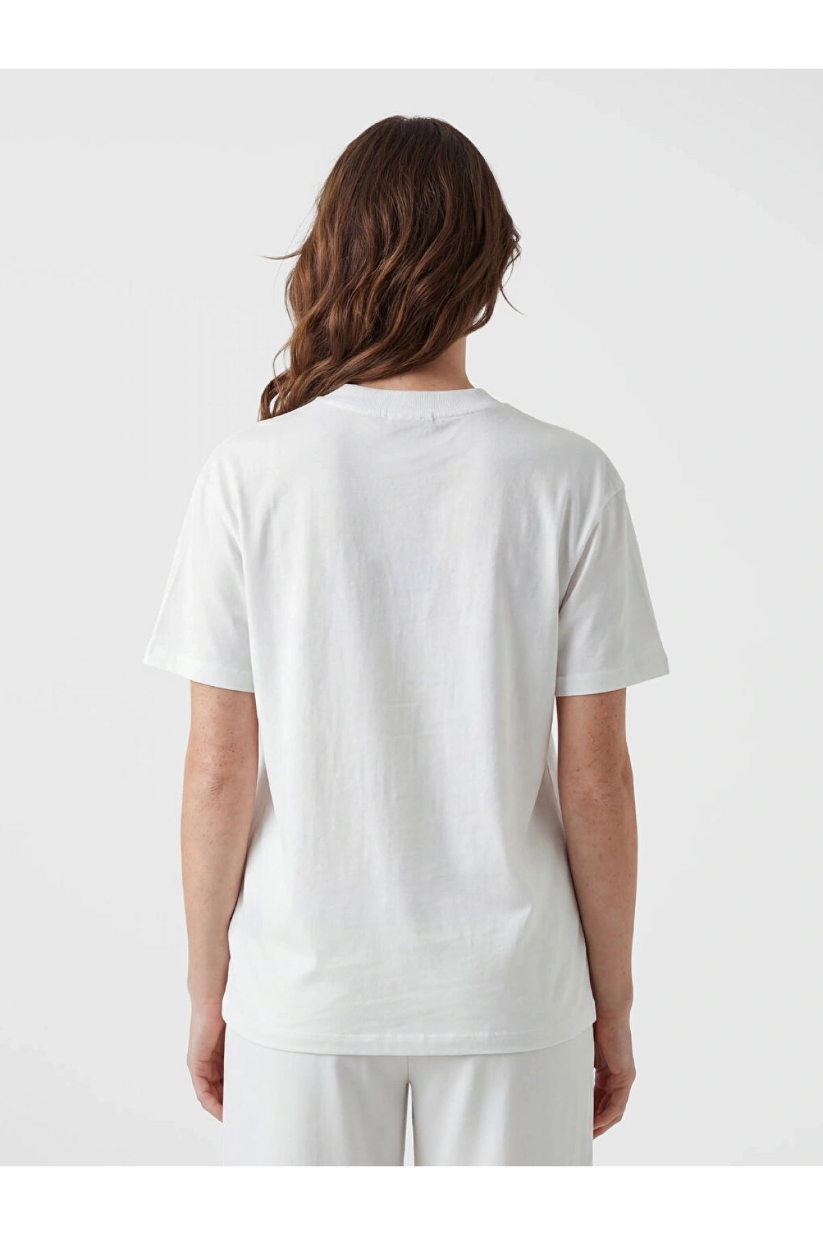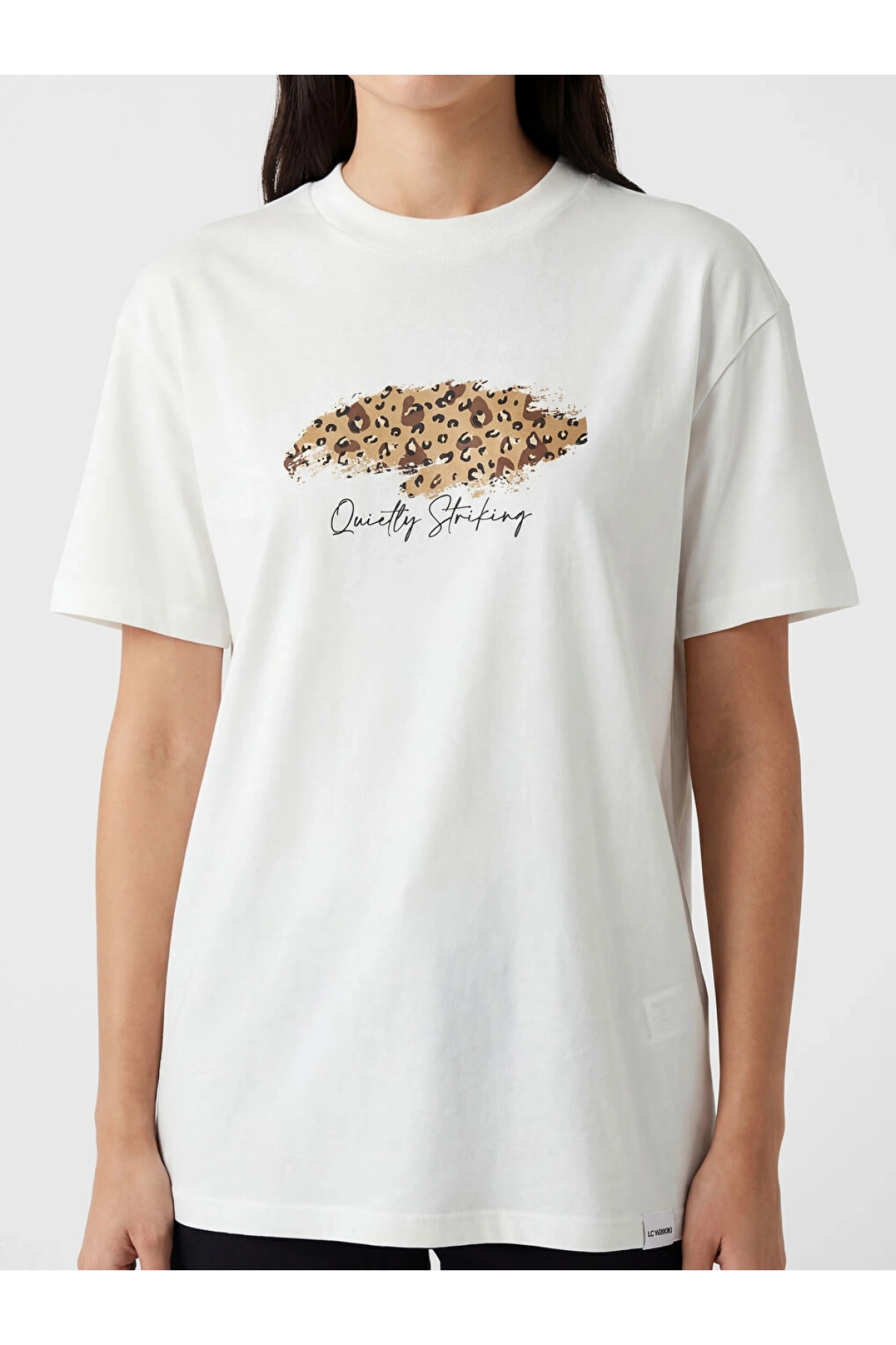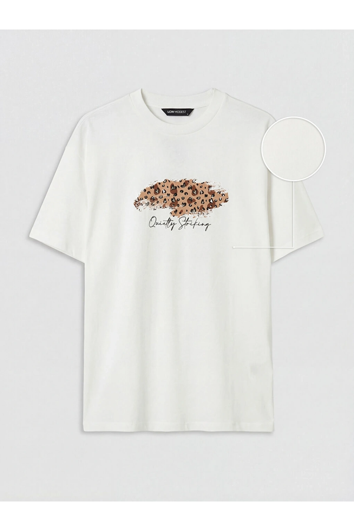 LCW Modest Ekru Bisiklet Yaka Baskılı Kadın Tişört