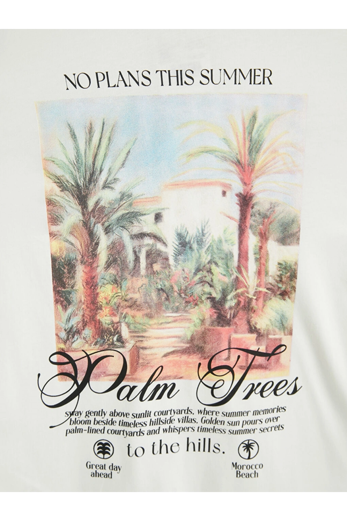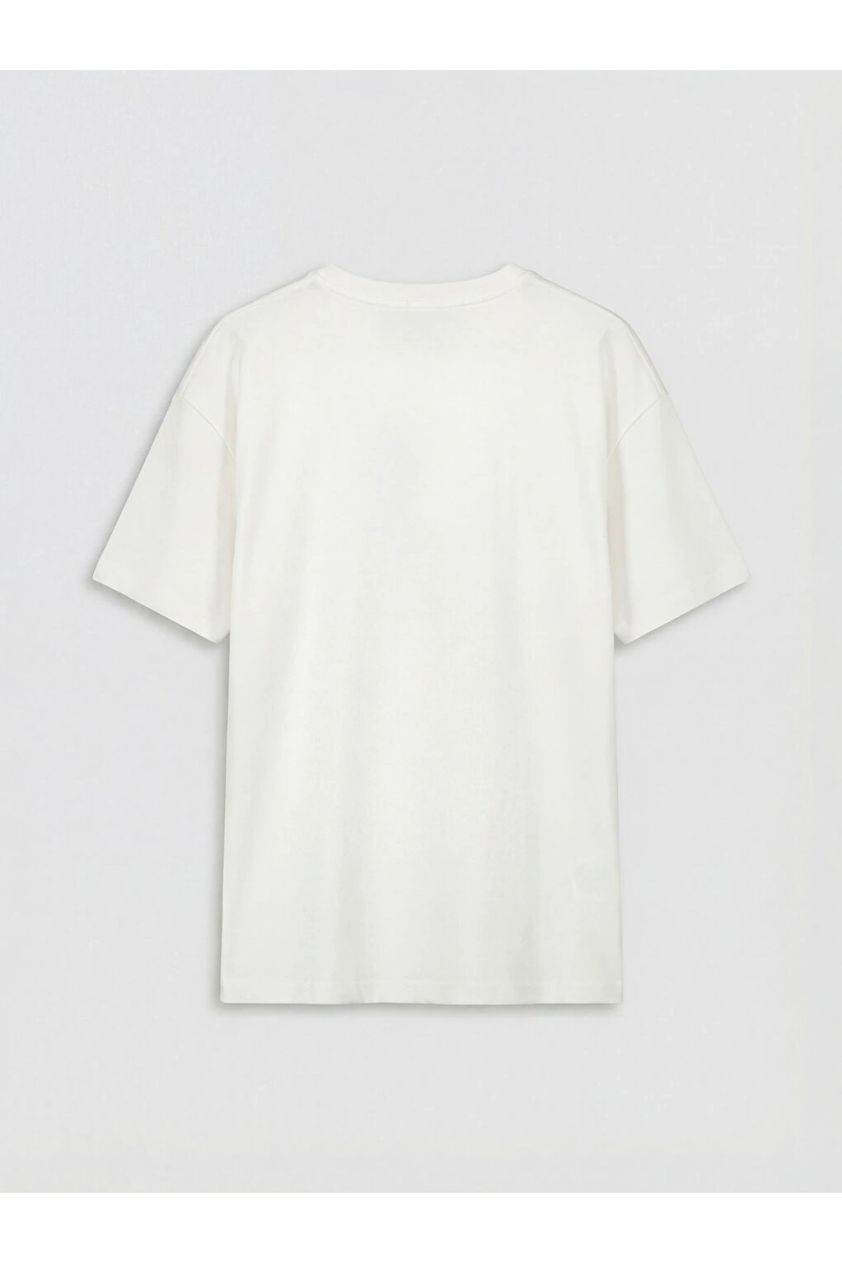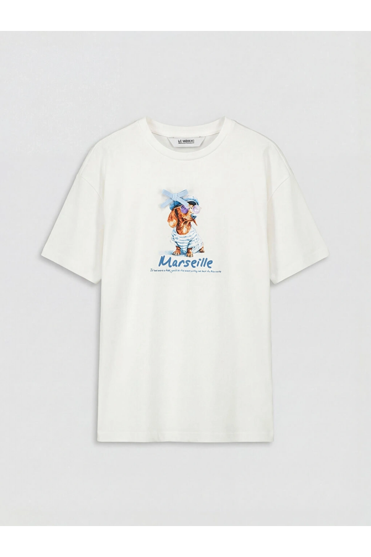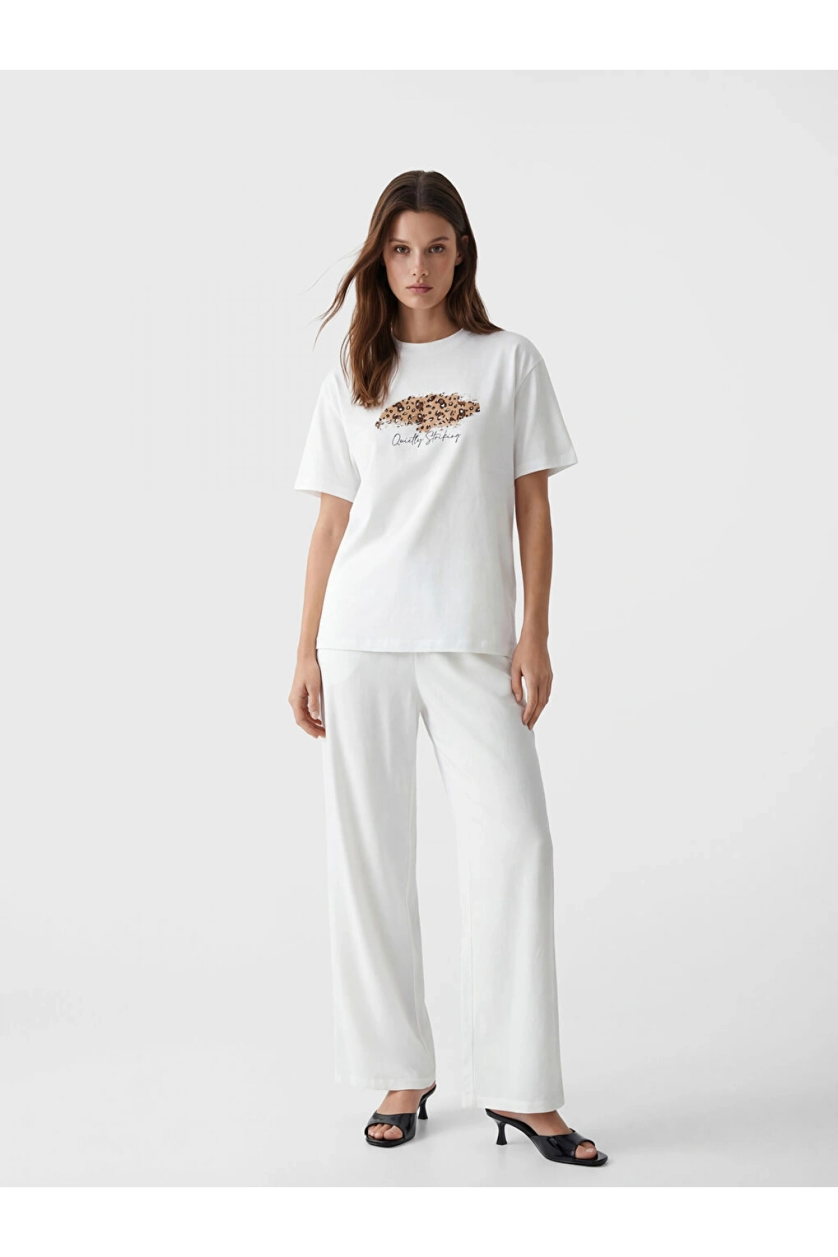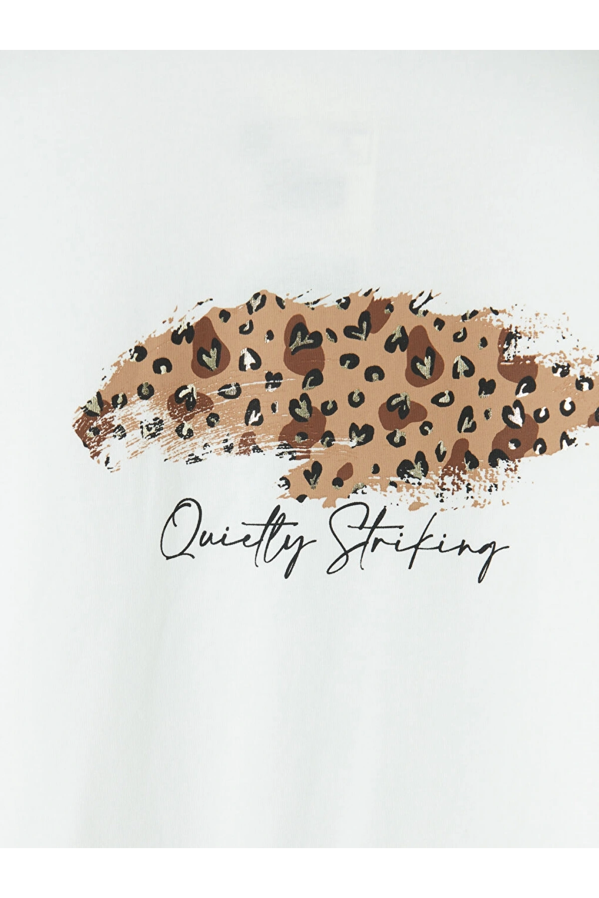 LCW Modest Ekru Bisiklet Yaka Baskılı Kadın Tişört