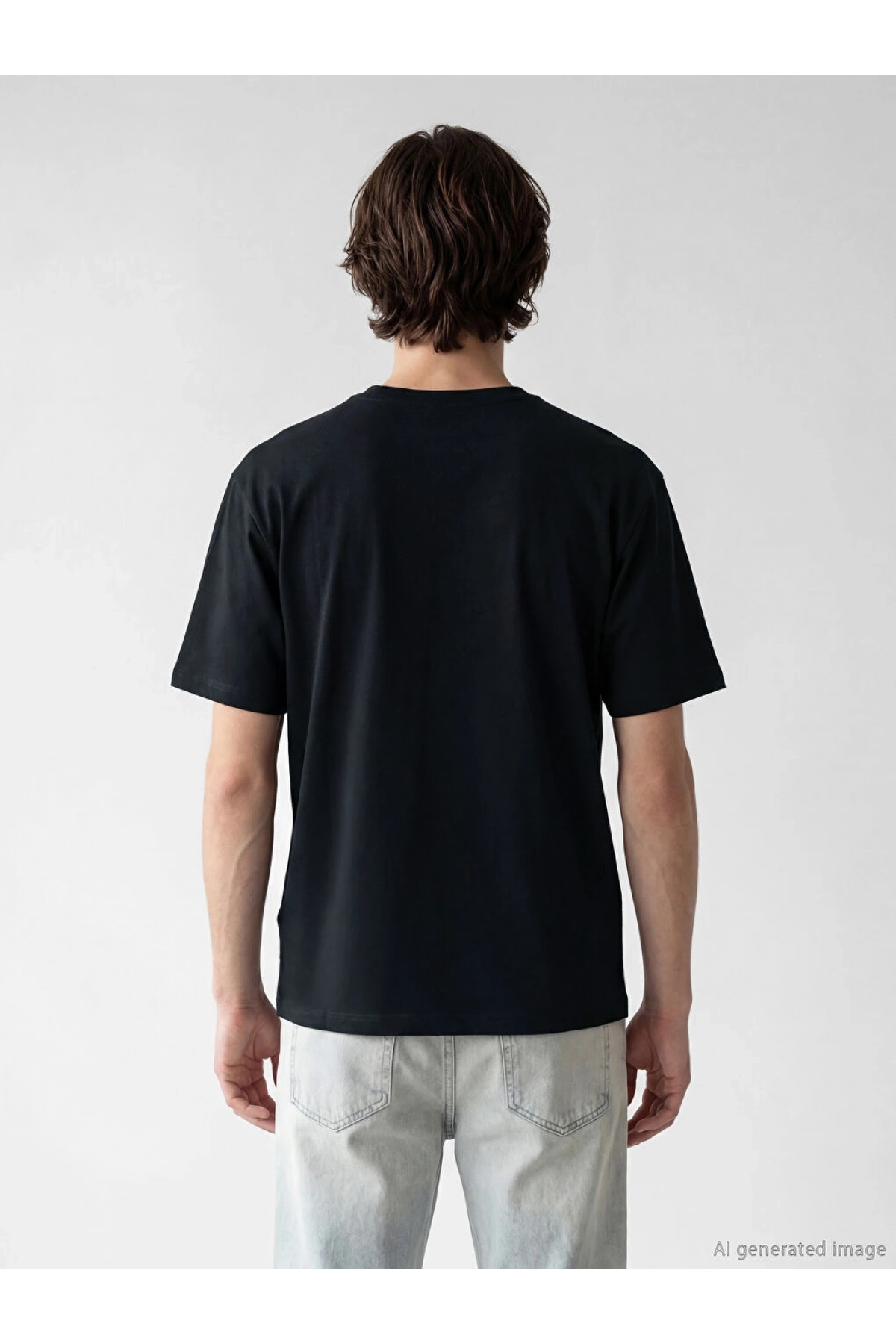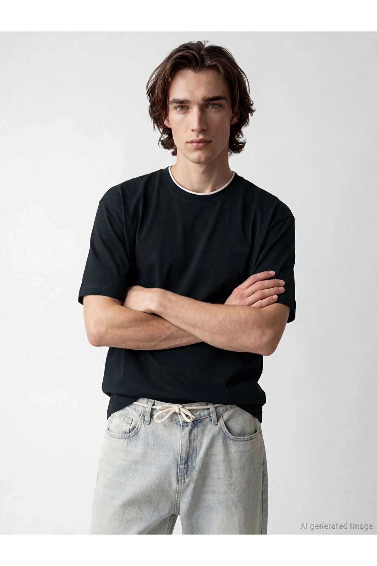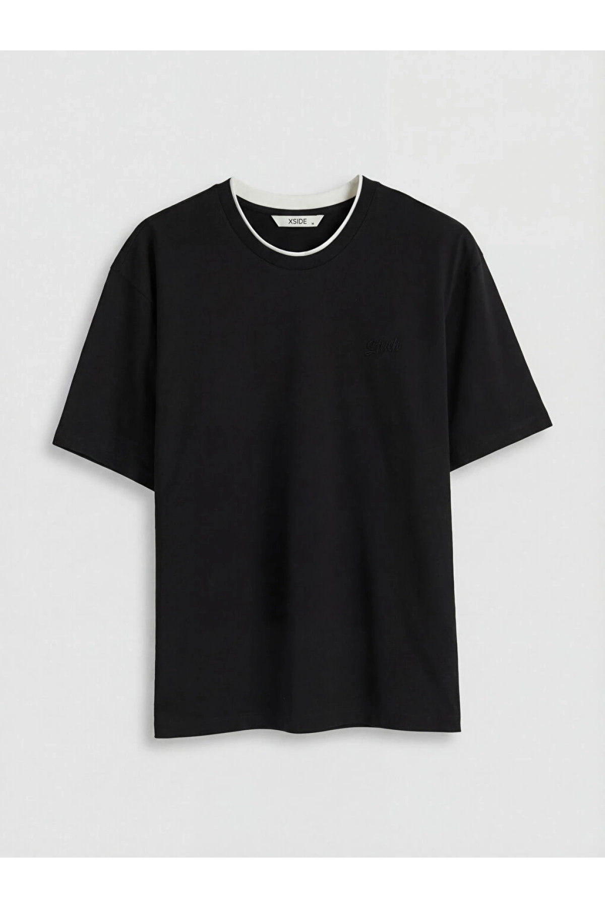XSIDE Siyah Bisiklet Yaka Nakışlı Erkek Tişört