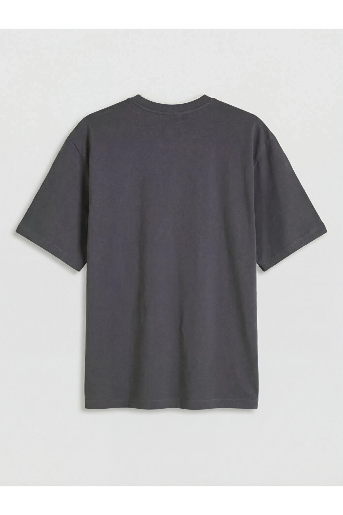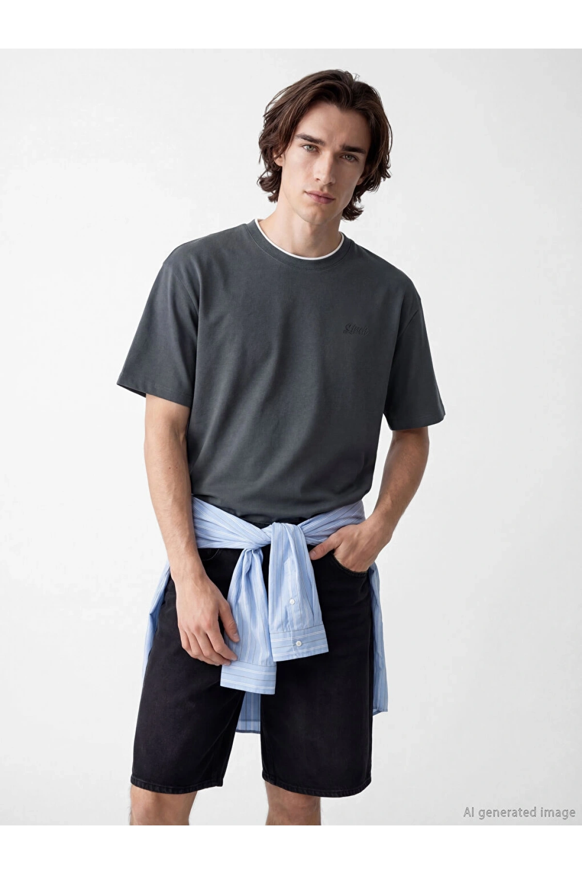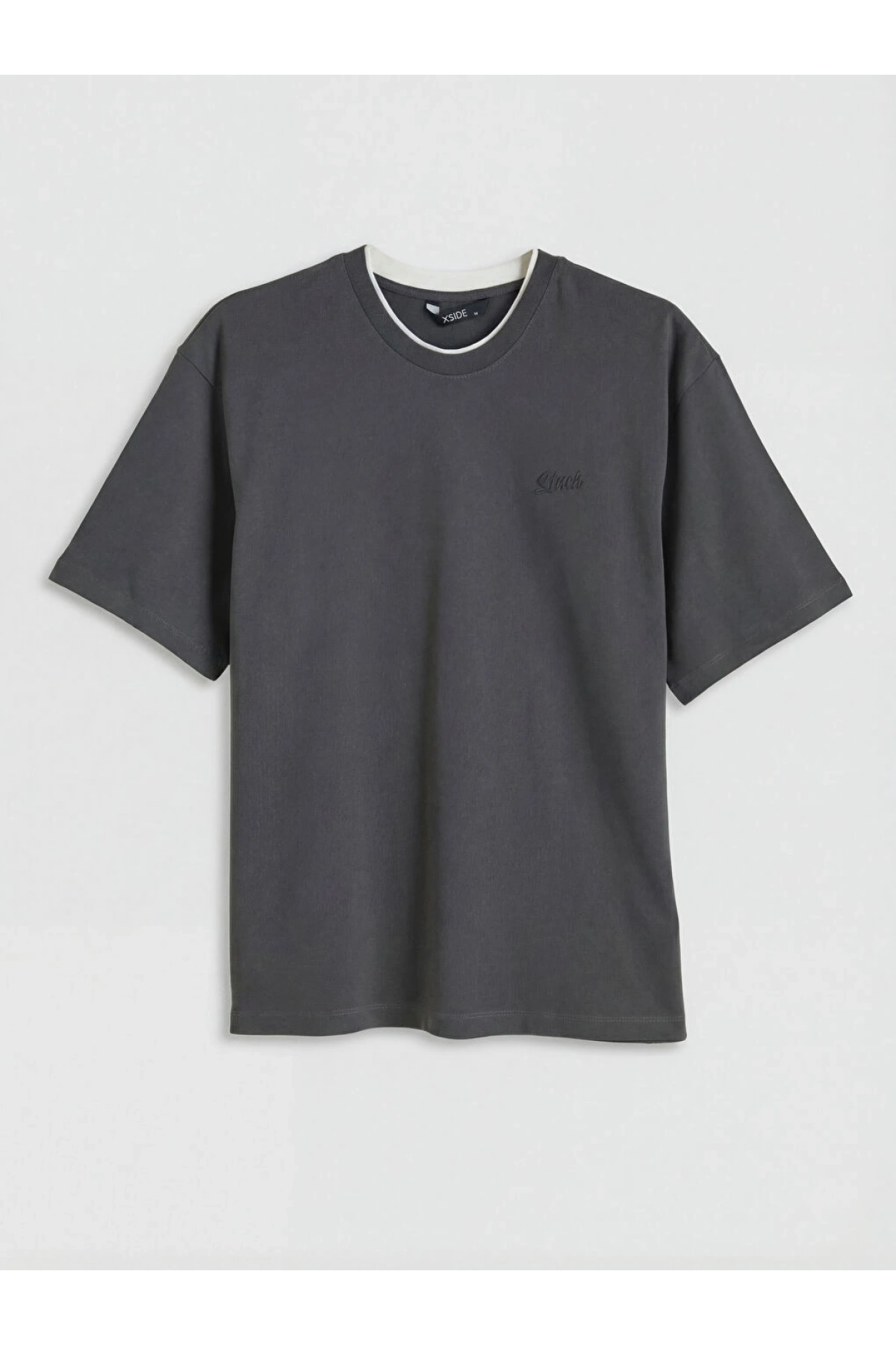 XSIDE Antrasit Bisiklet Yaka Nakışlı Erkek Tişört