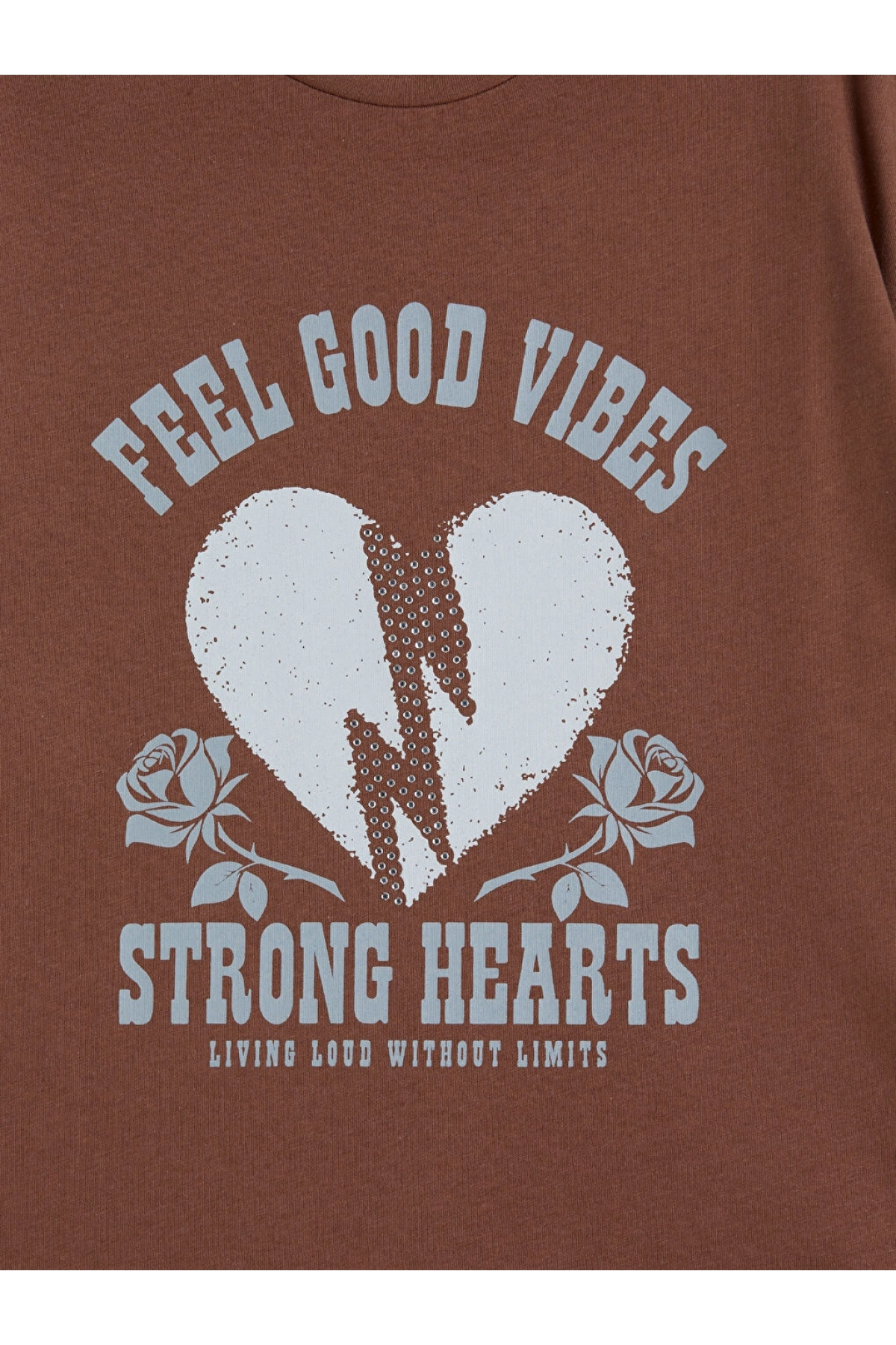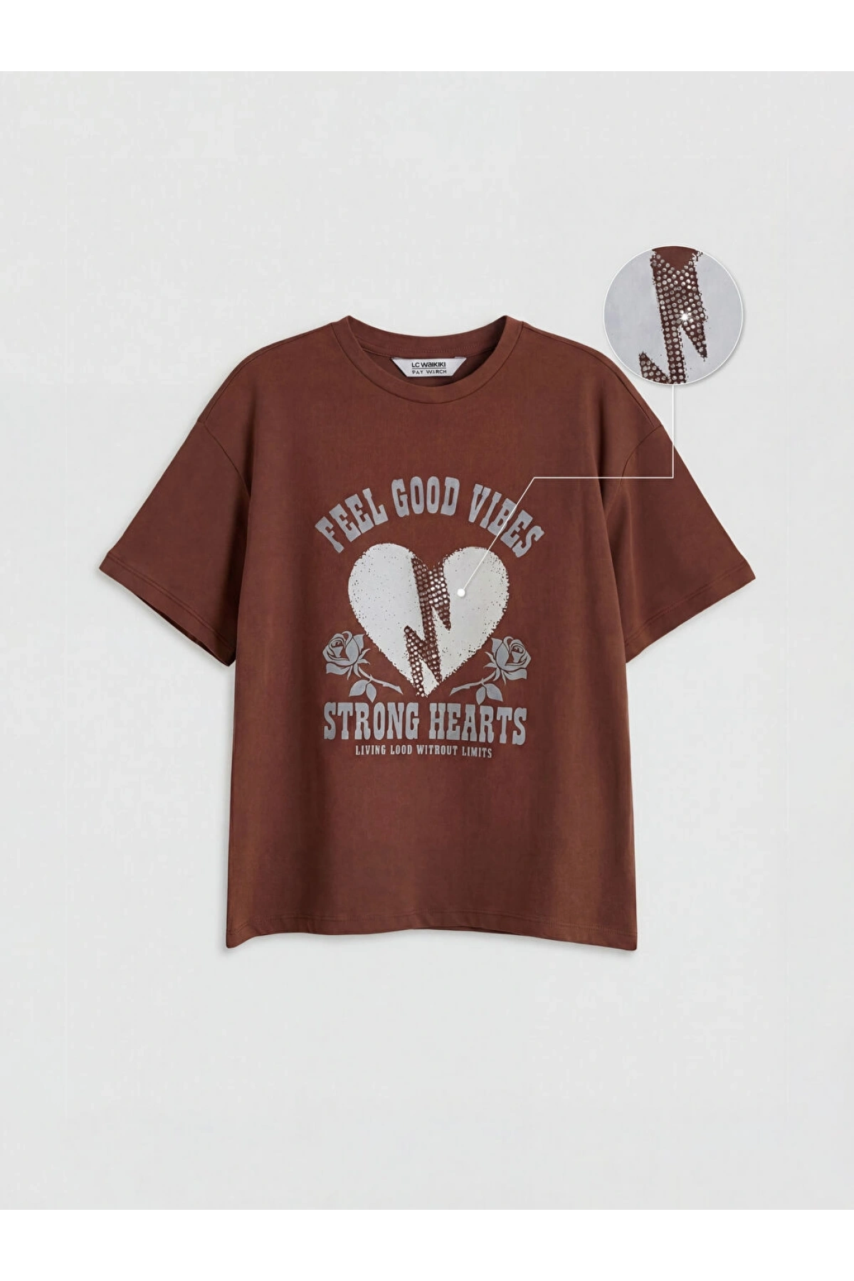 LCW Kids Kahverengi Baskılı Taş Detaylı Kız Çocuk Tişört