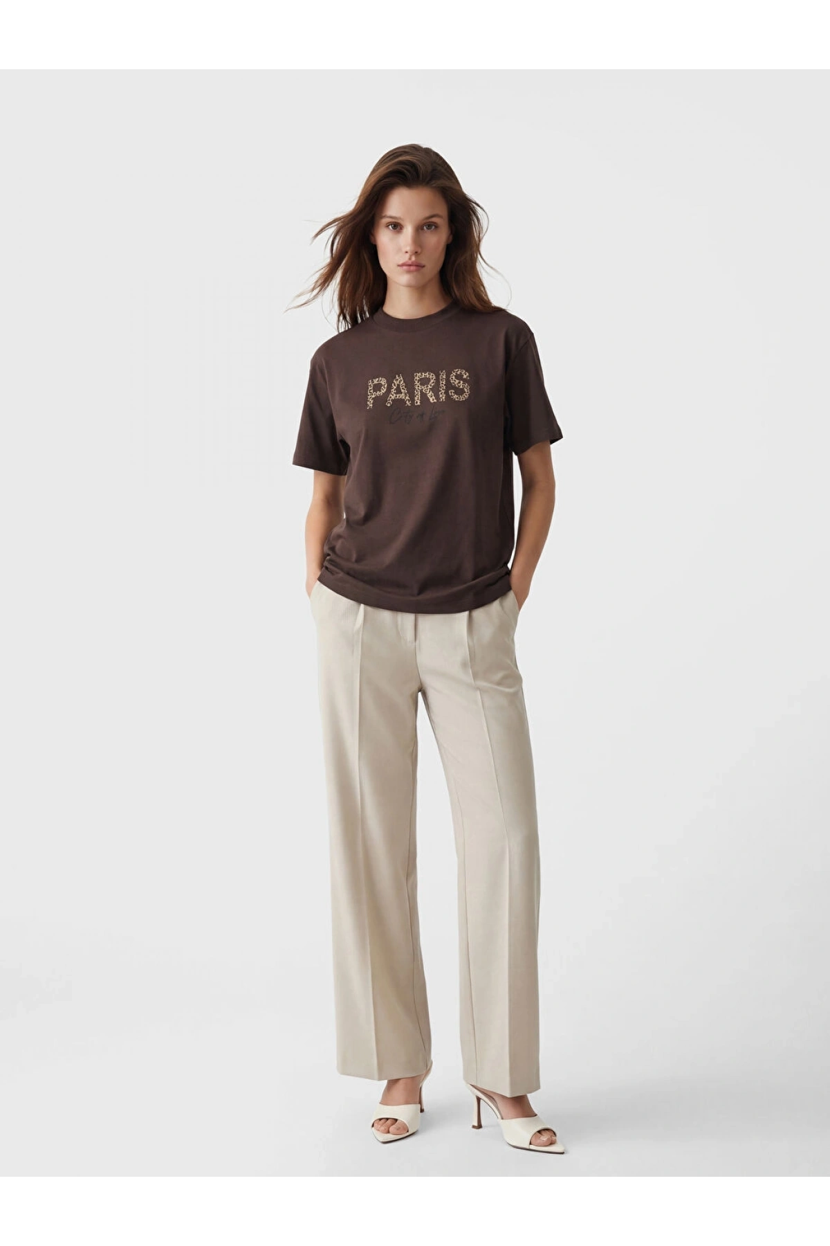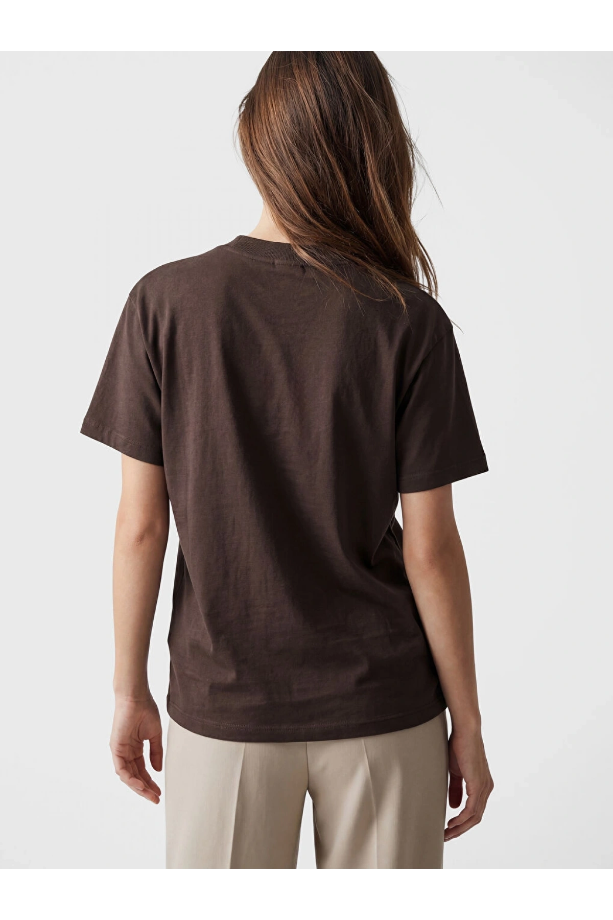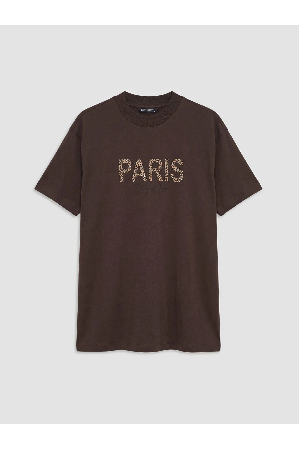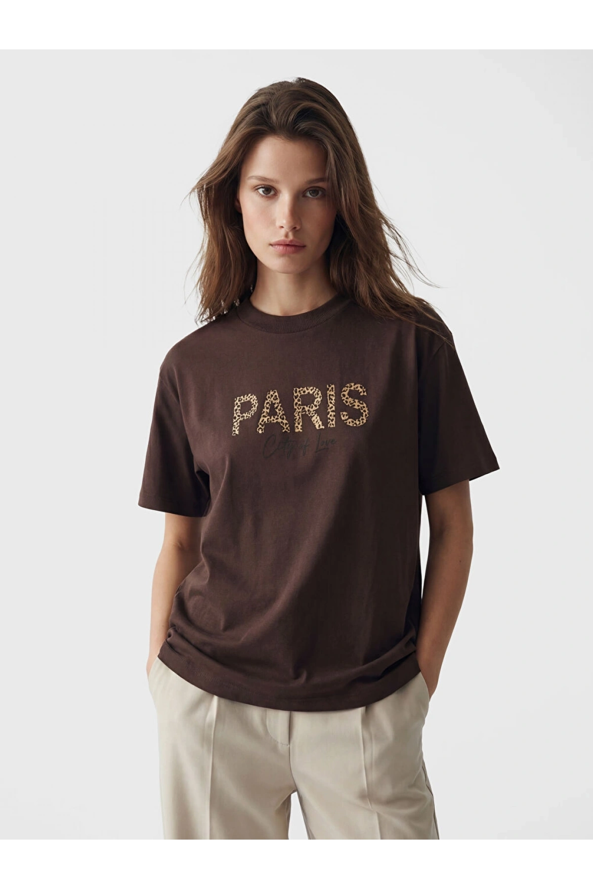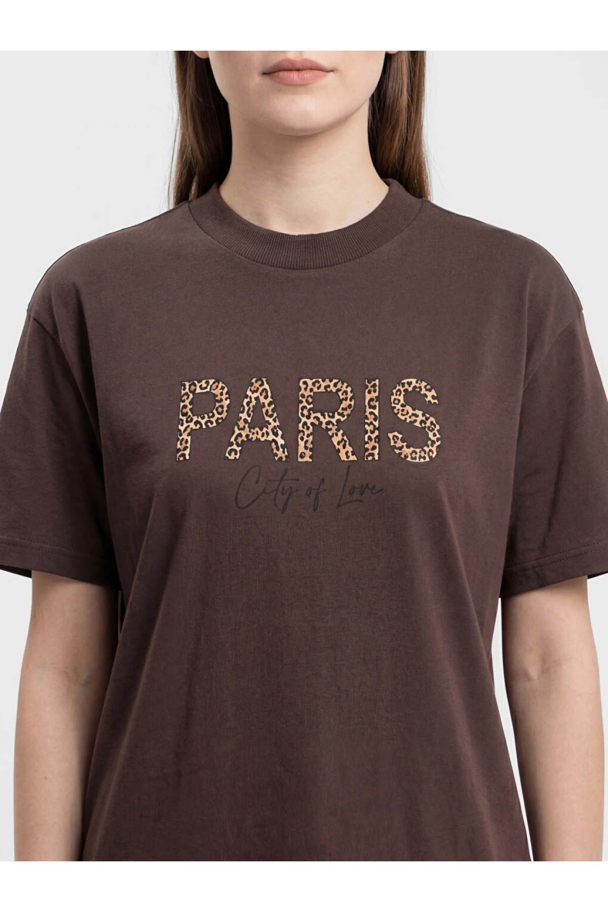 LCW Modest Kahverengi Bisiklet Yaka Paris Baskılı Kadın Tişört