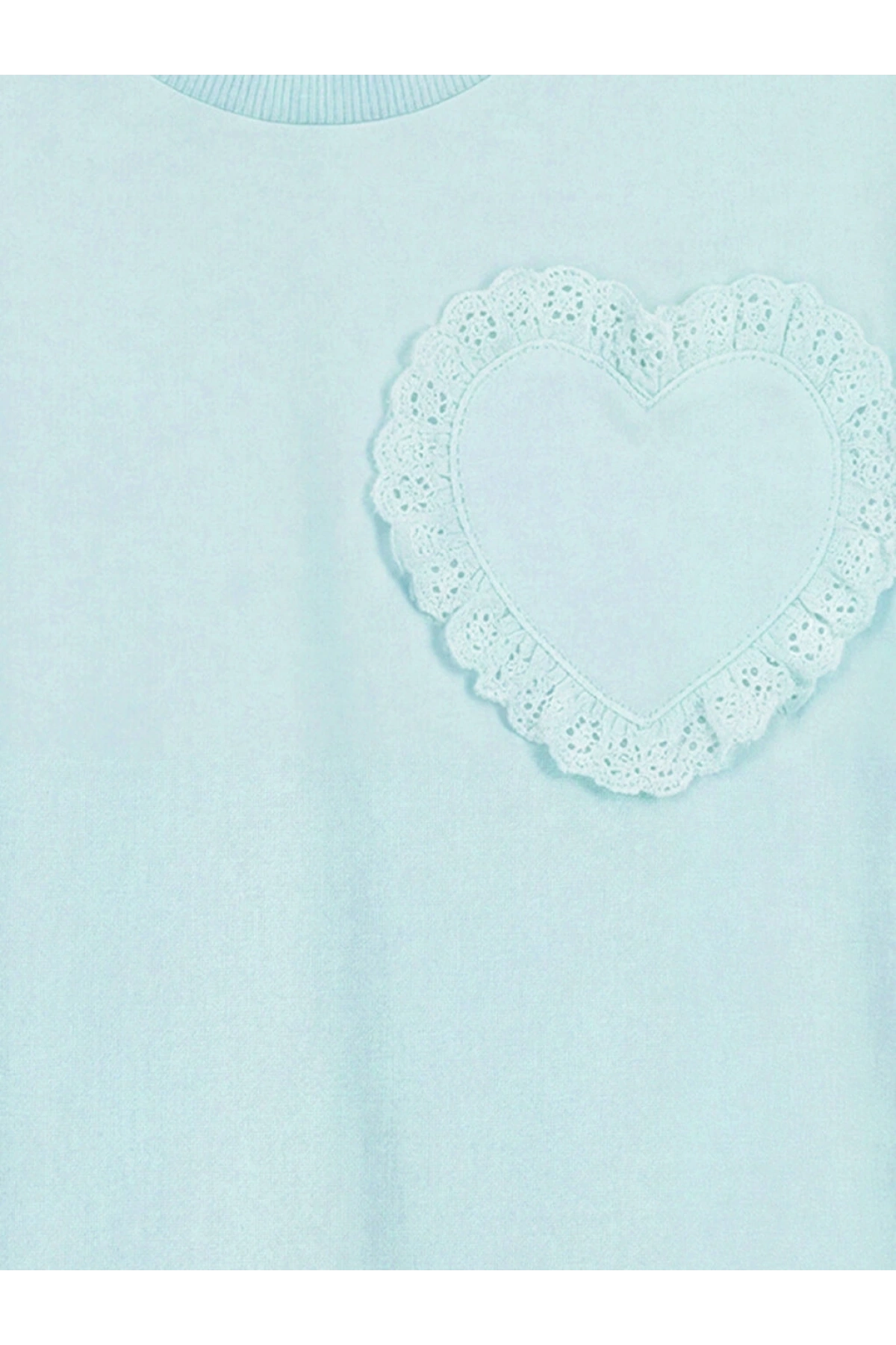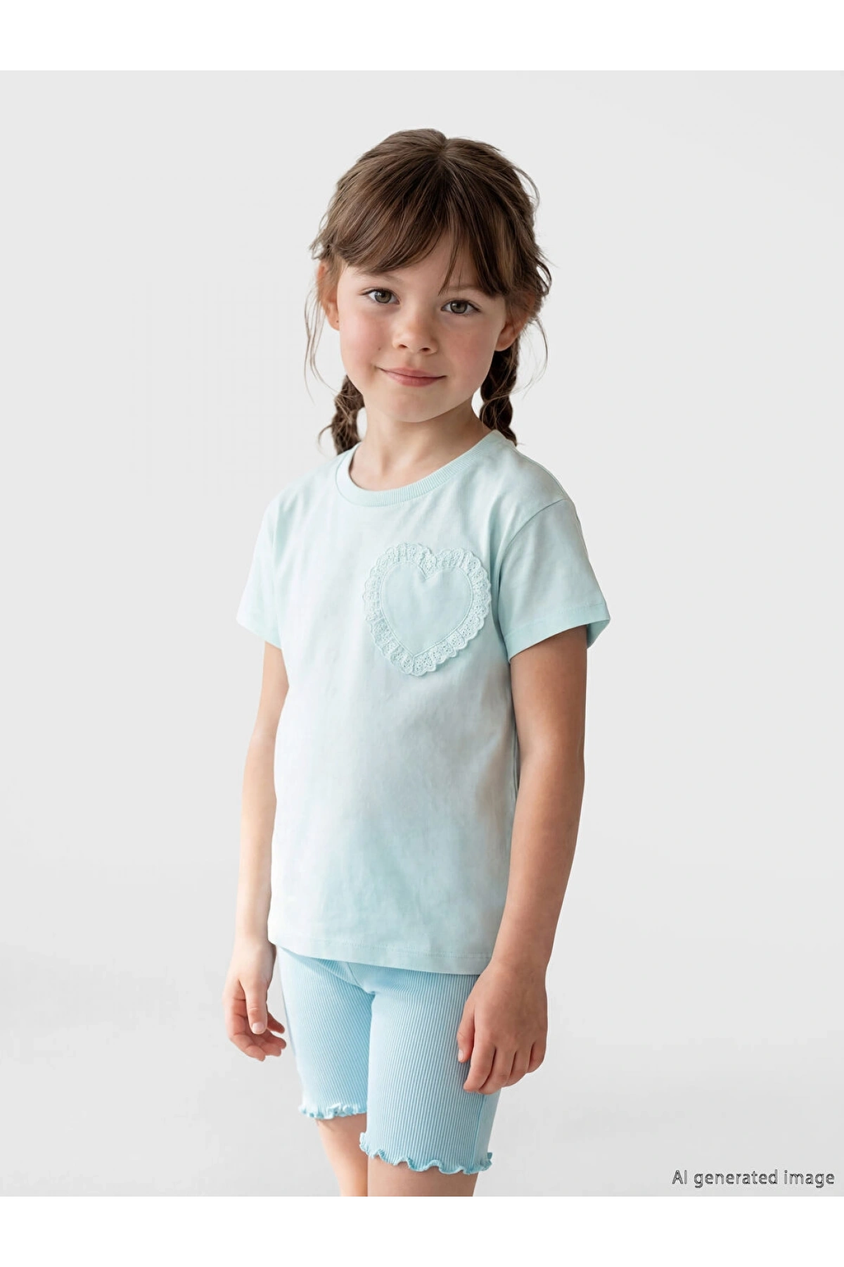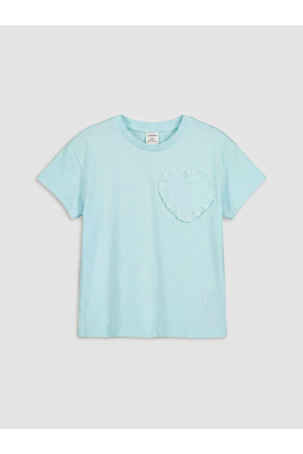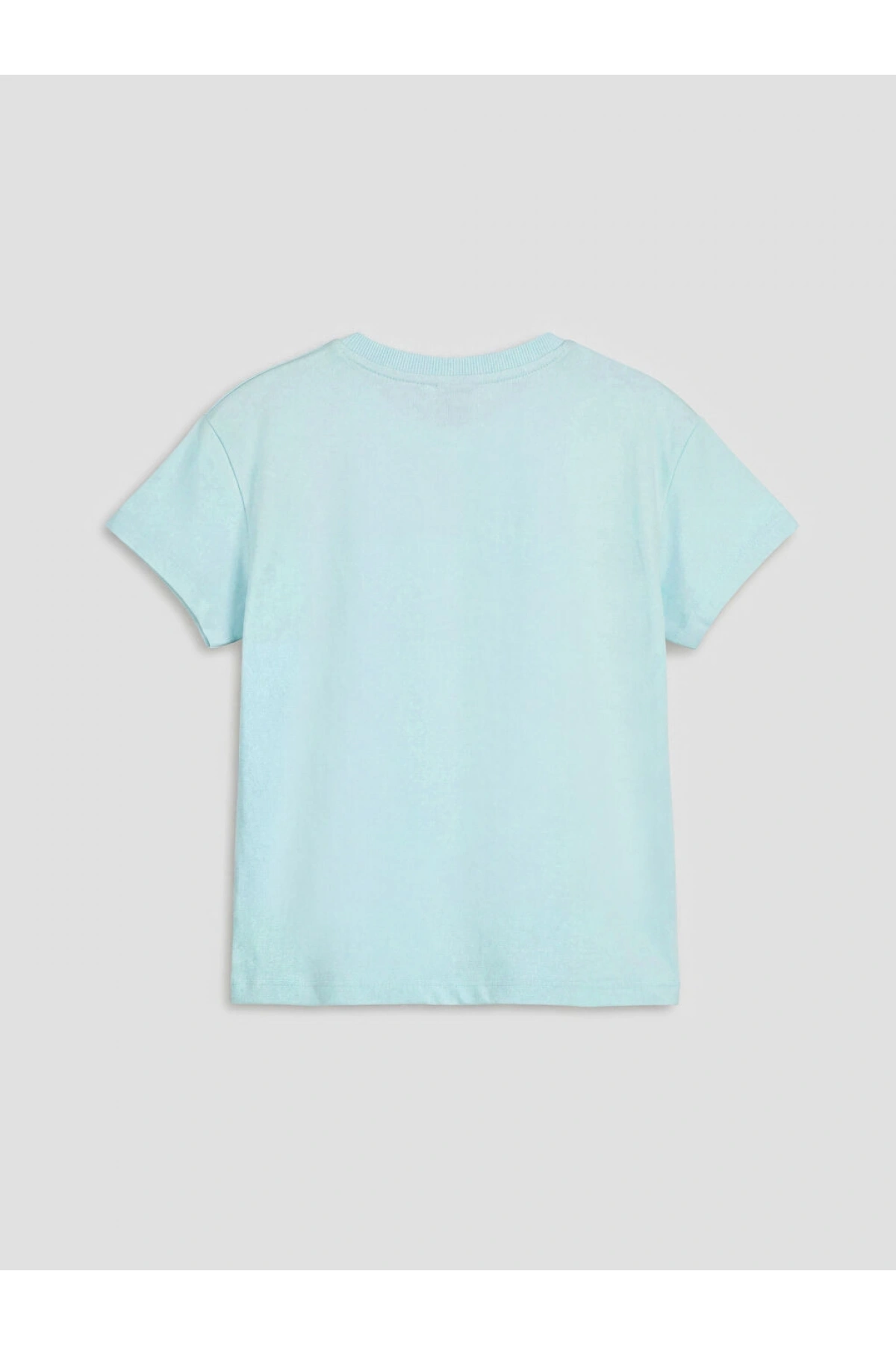 LCW Kids Turkuaz Bisiklet Yaka Nakışlı Kız Çocuk Tişört