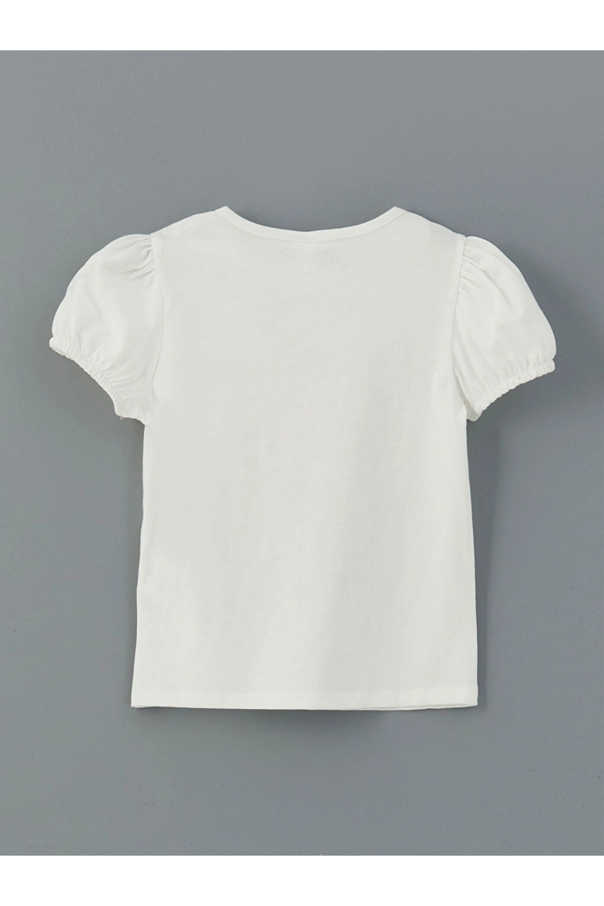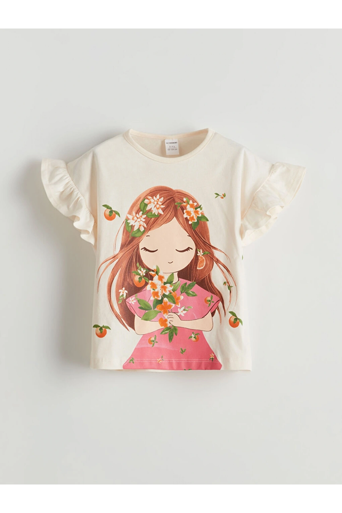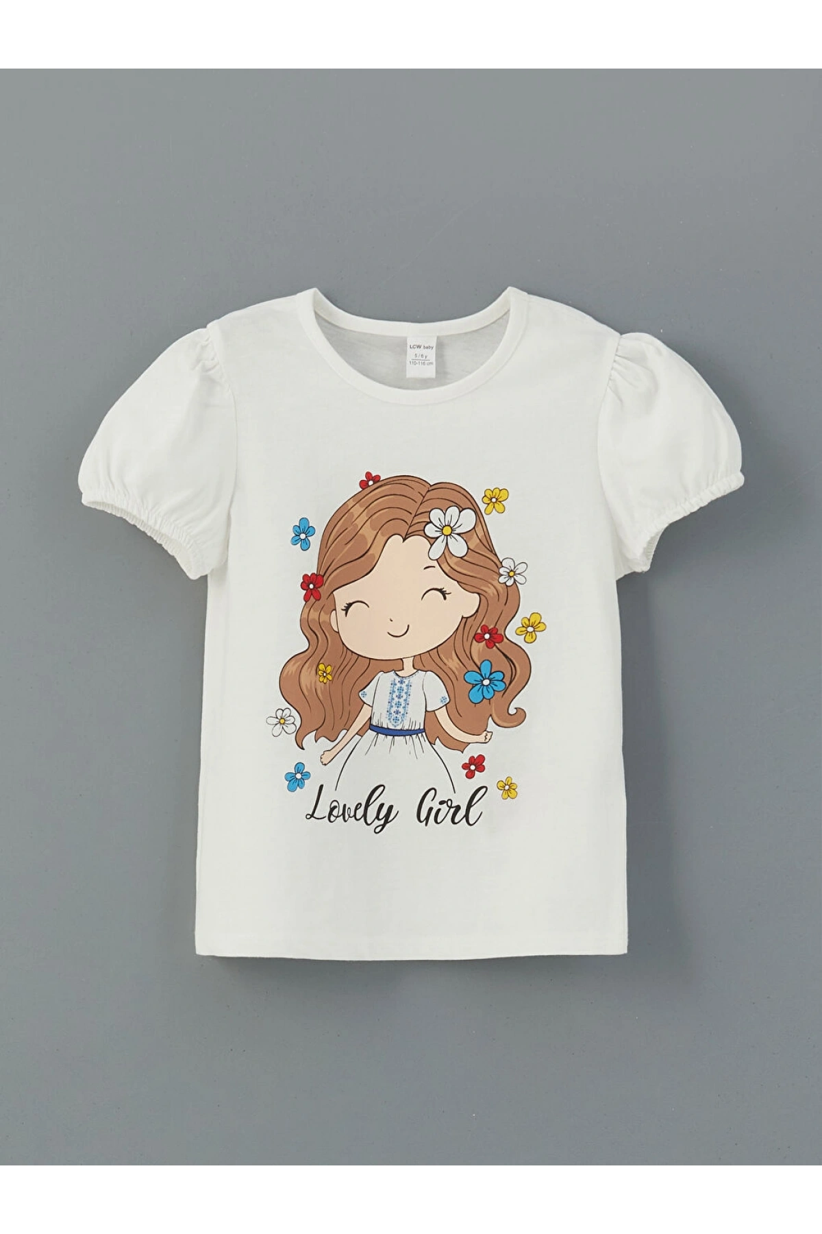 LCW Kids Ekru Bisiklet Yaka Baskılı Kız Çocuk Tişört
