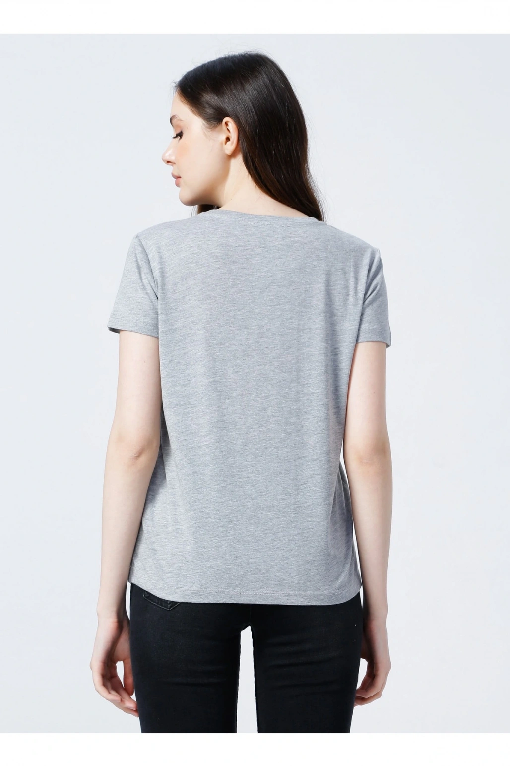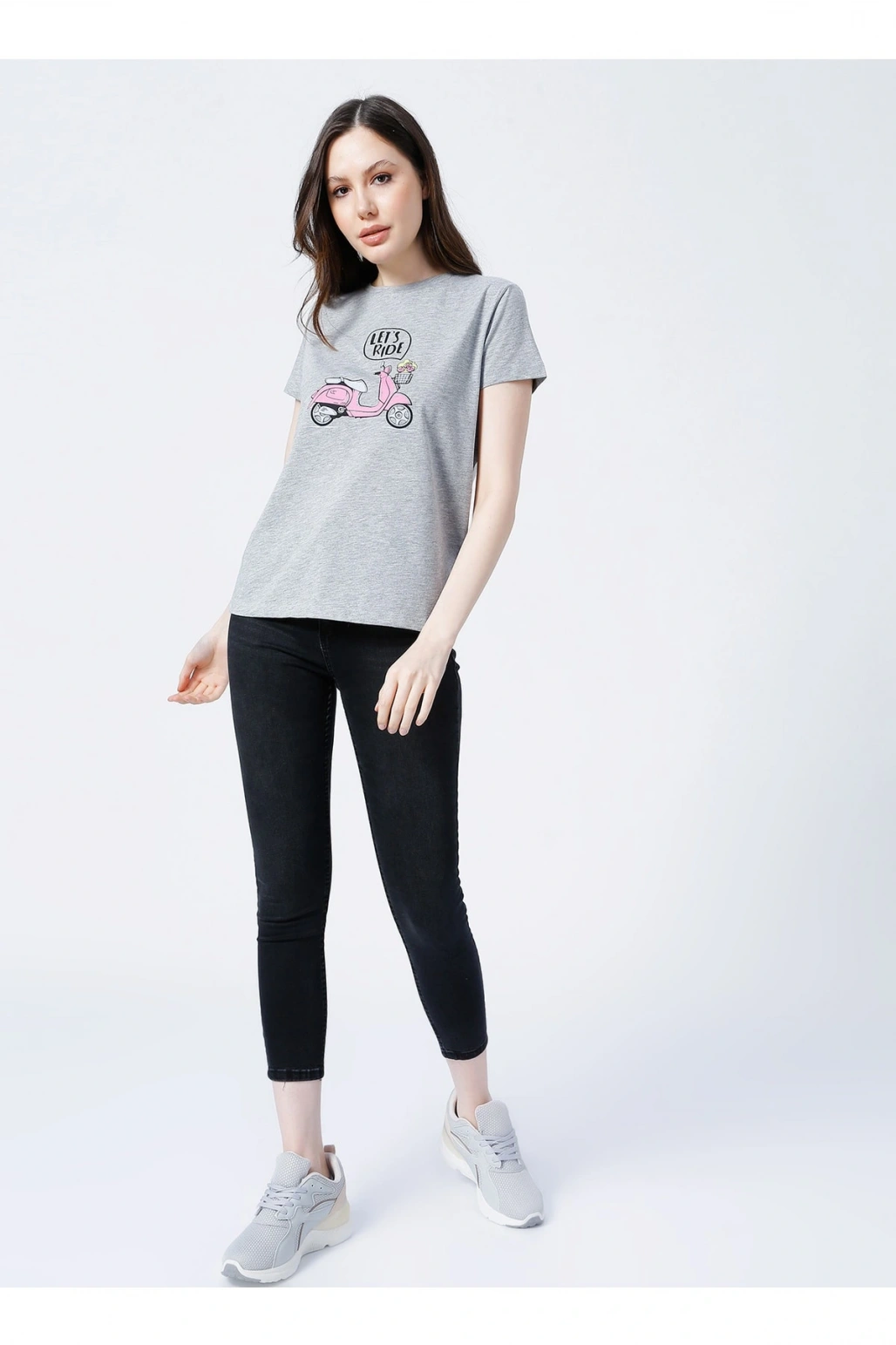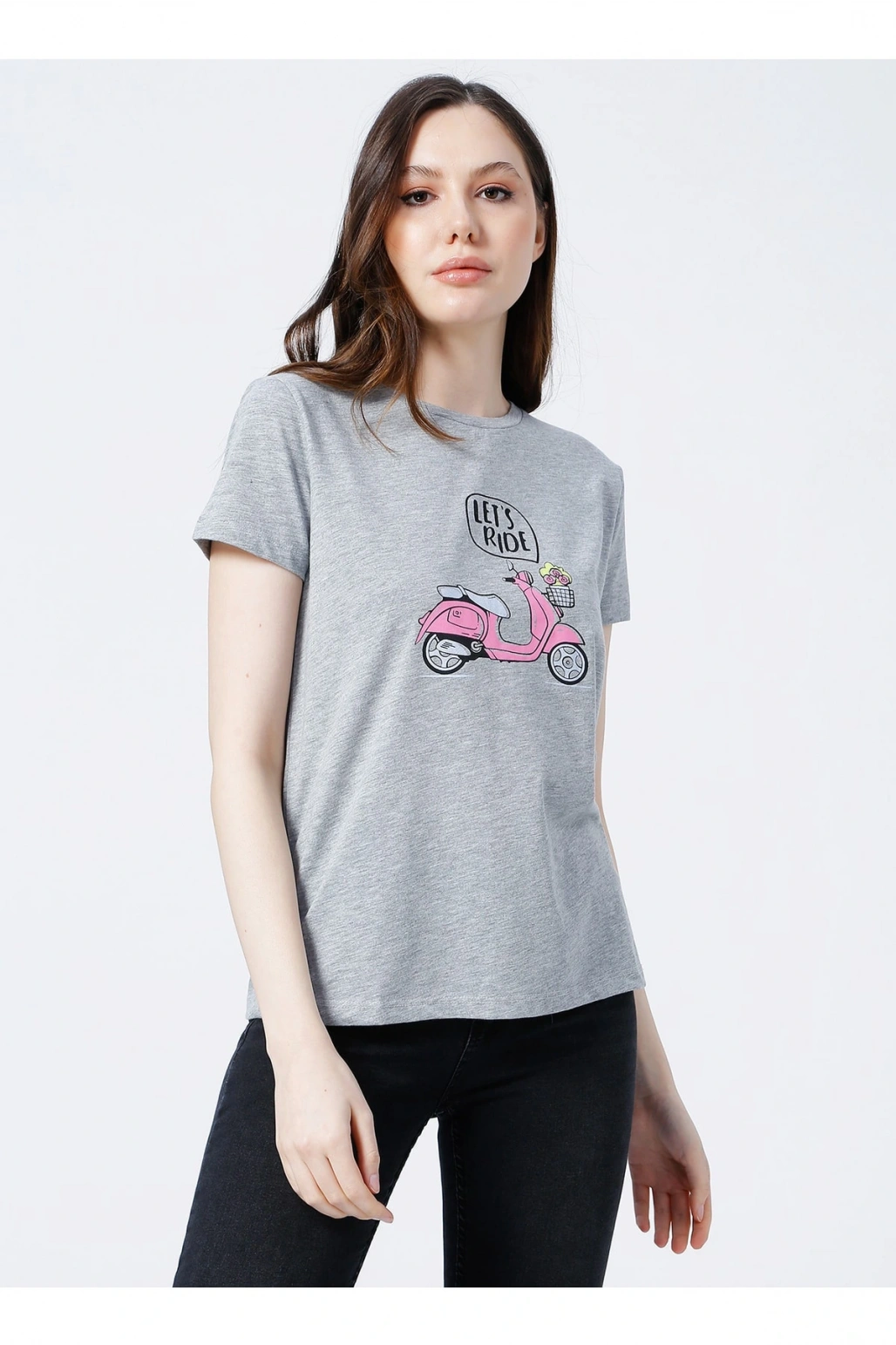 22y0103k1 Bisiklet Yakakısa Kollu Normal Kalıp Baskılı Gri Melanj Kadın T-shirt