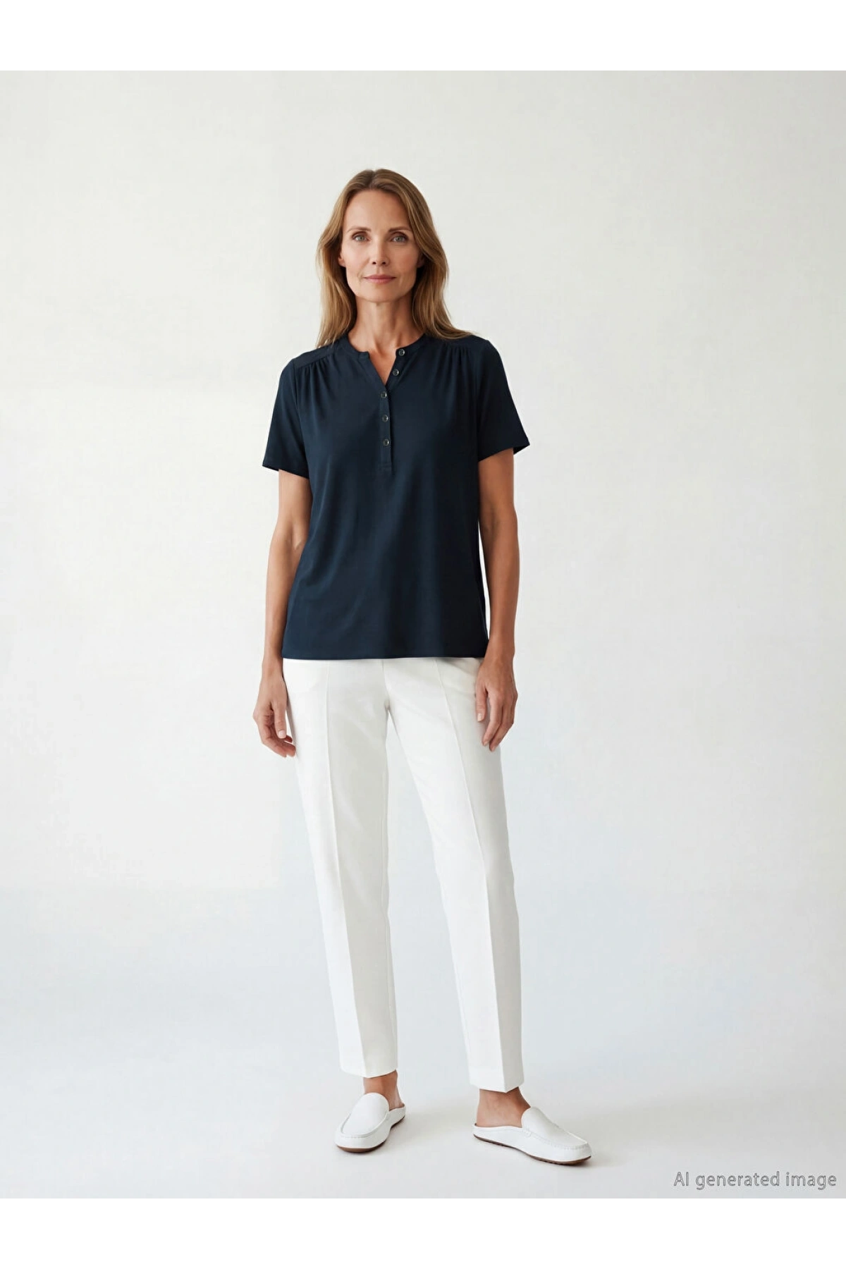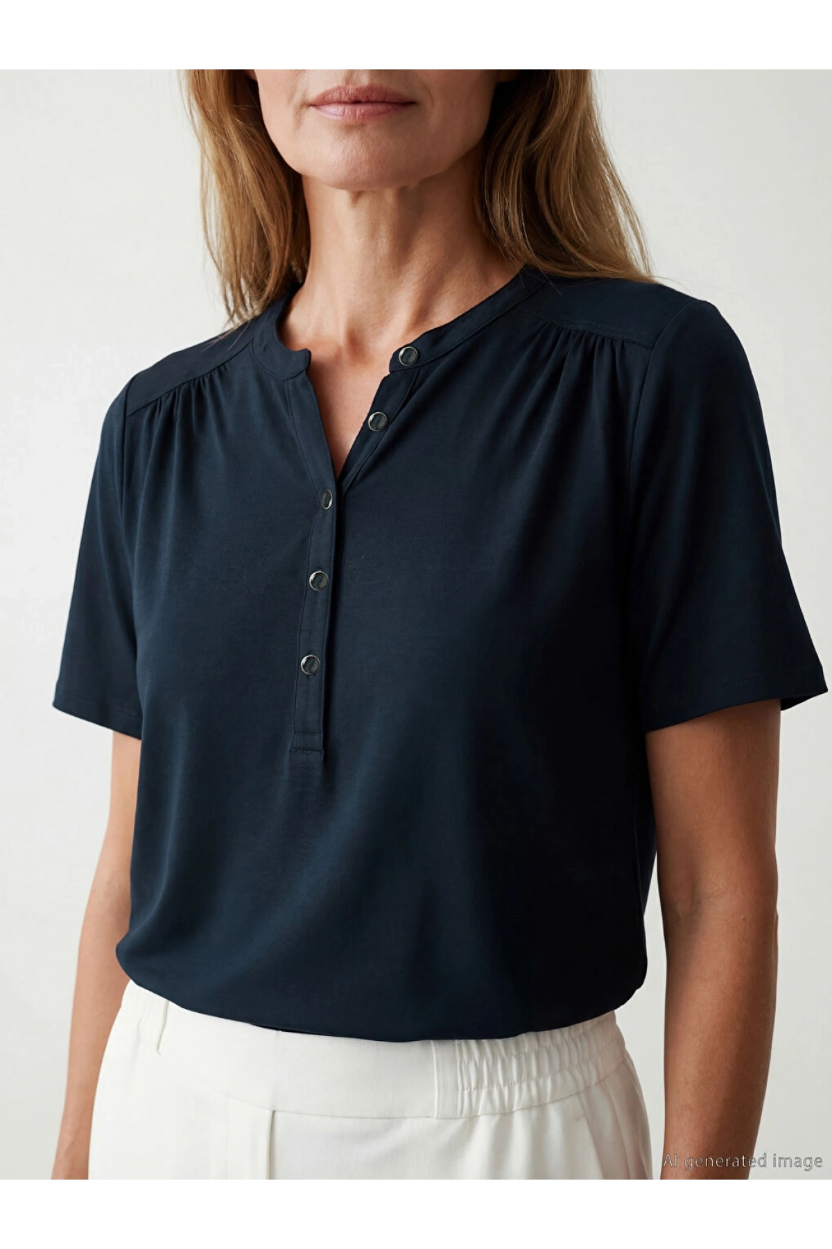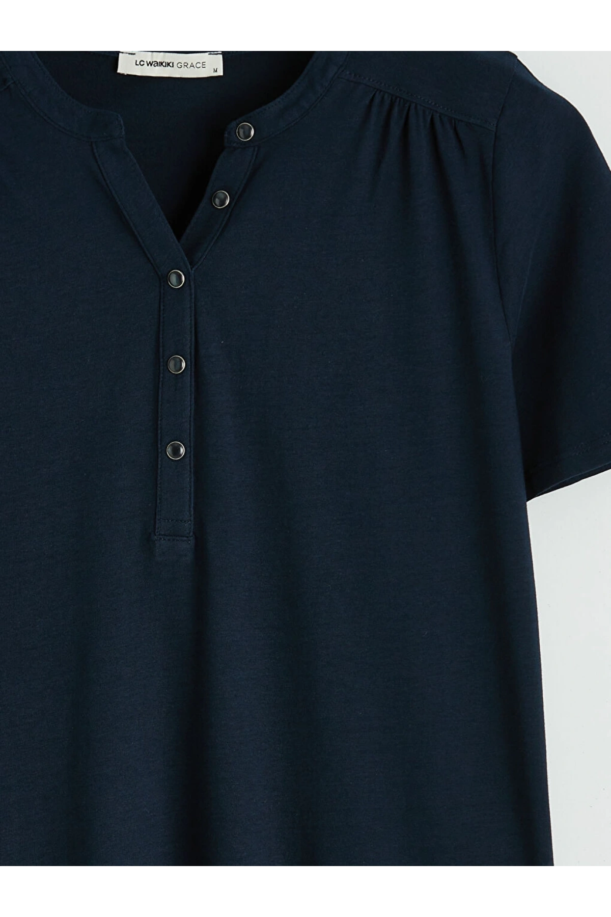 LCW Grace Lacivert Kaçık Yaka Büzgülü Kadın Tişört