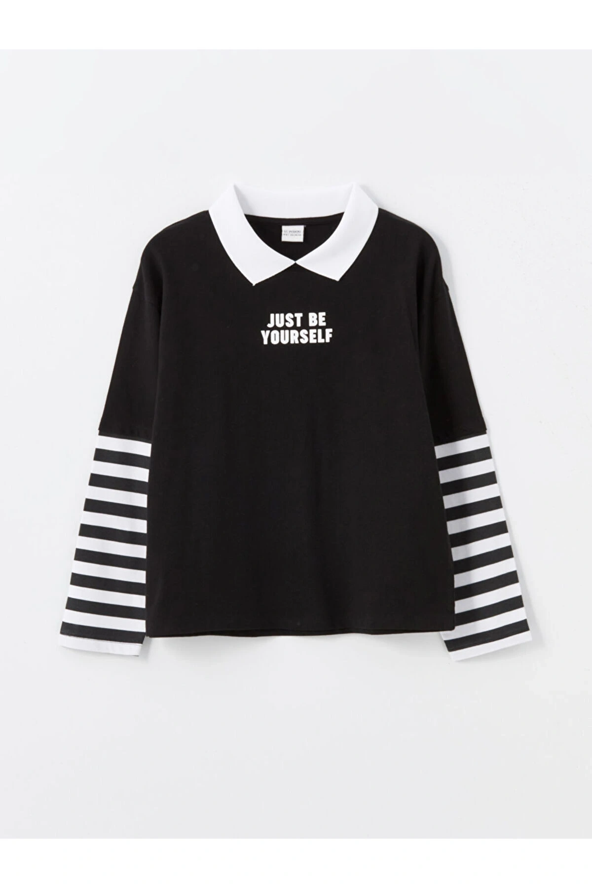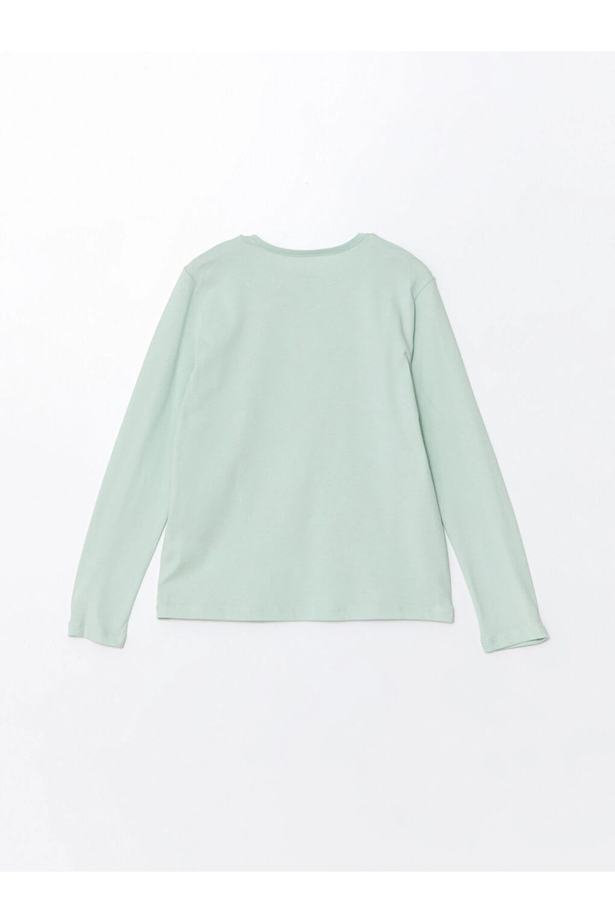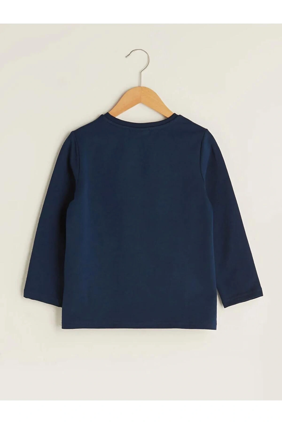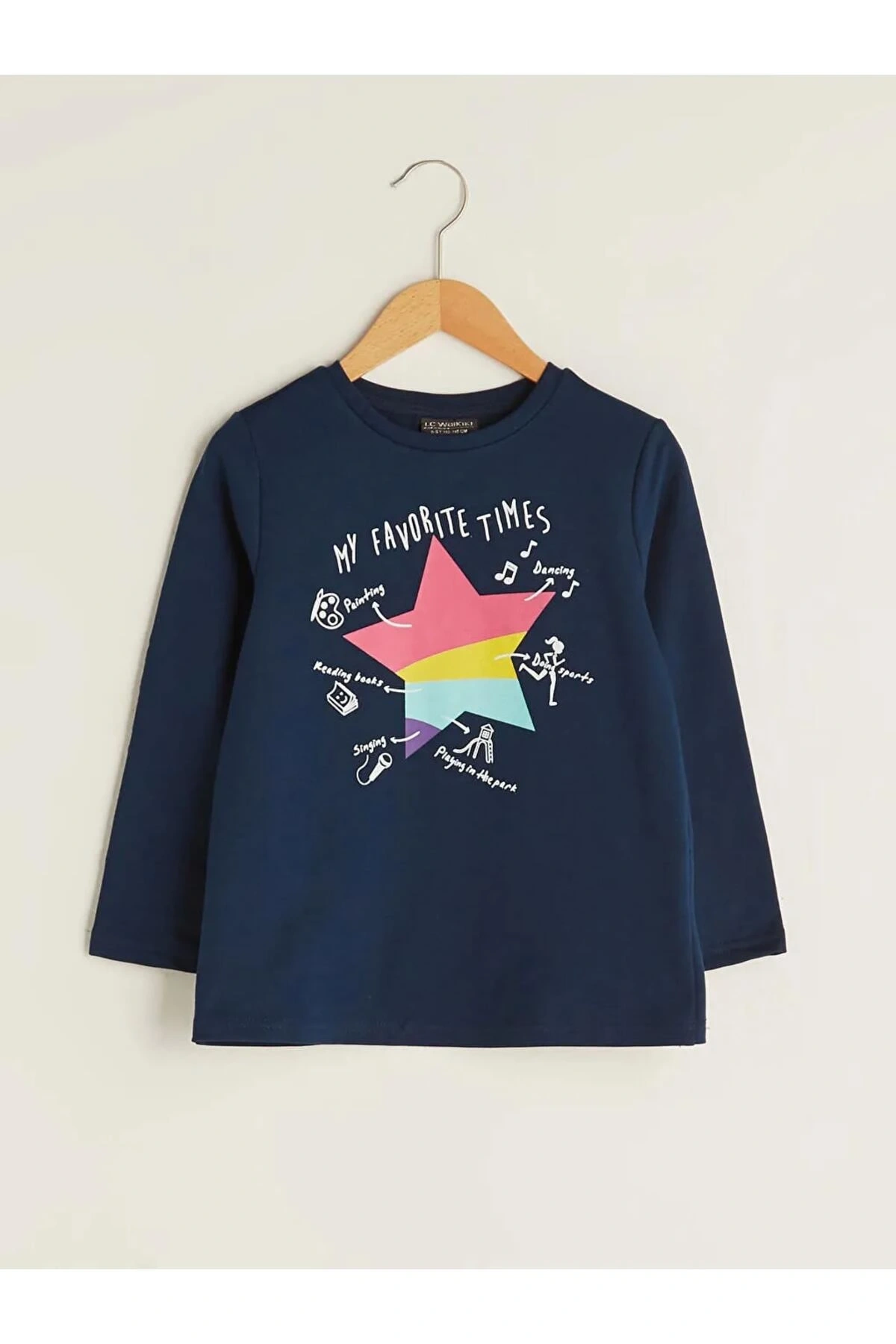 LCW ECO Lacivert Bisiklet Yaka Baskılı Uzun Kollu Kız Çocuk Tişört