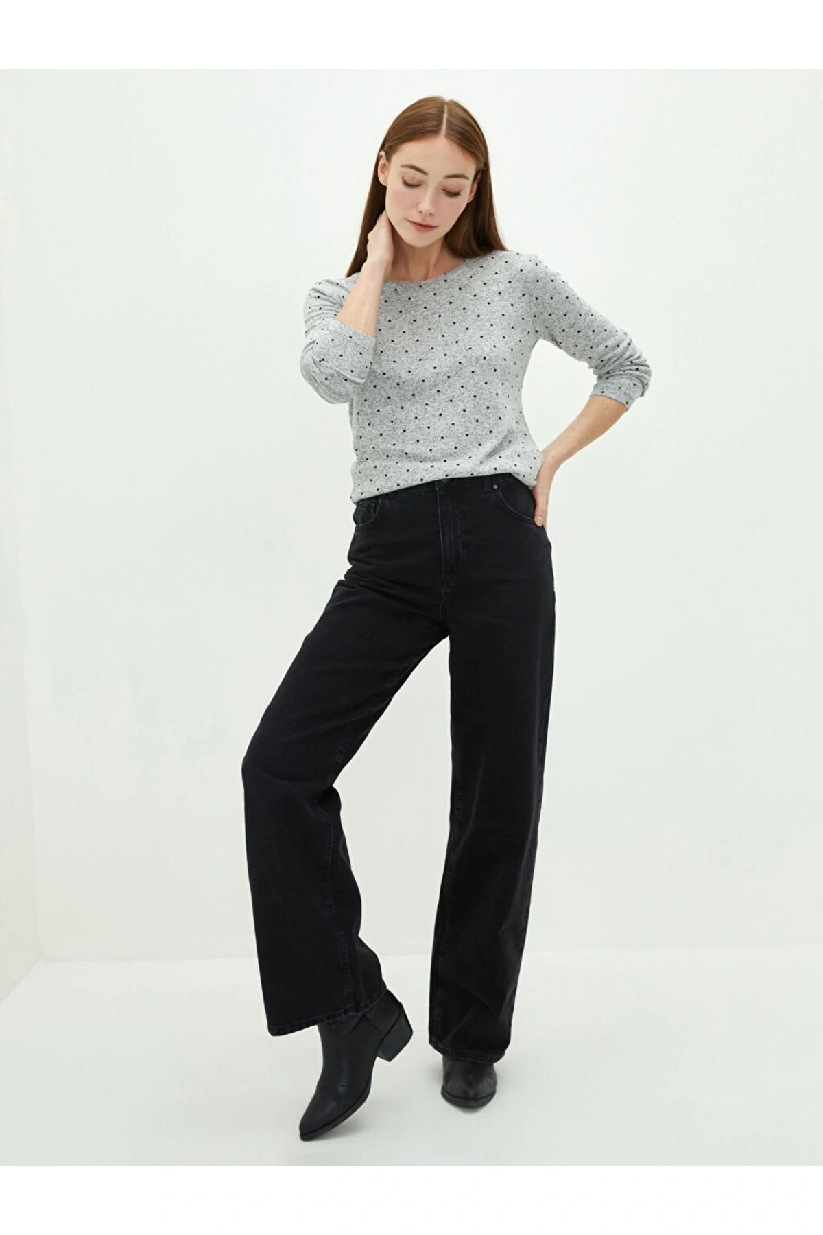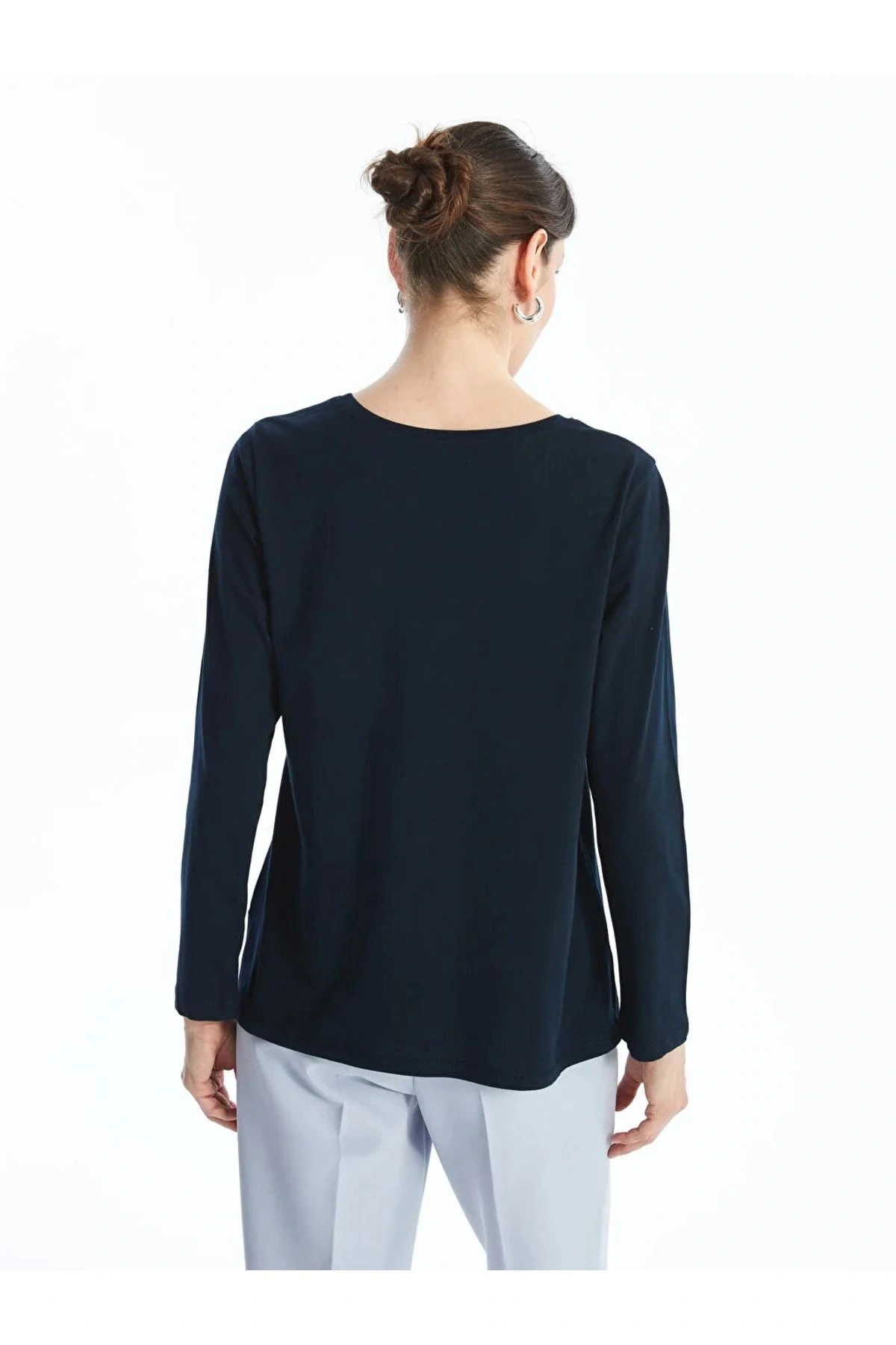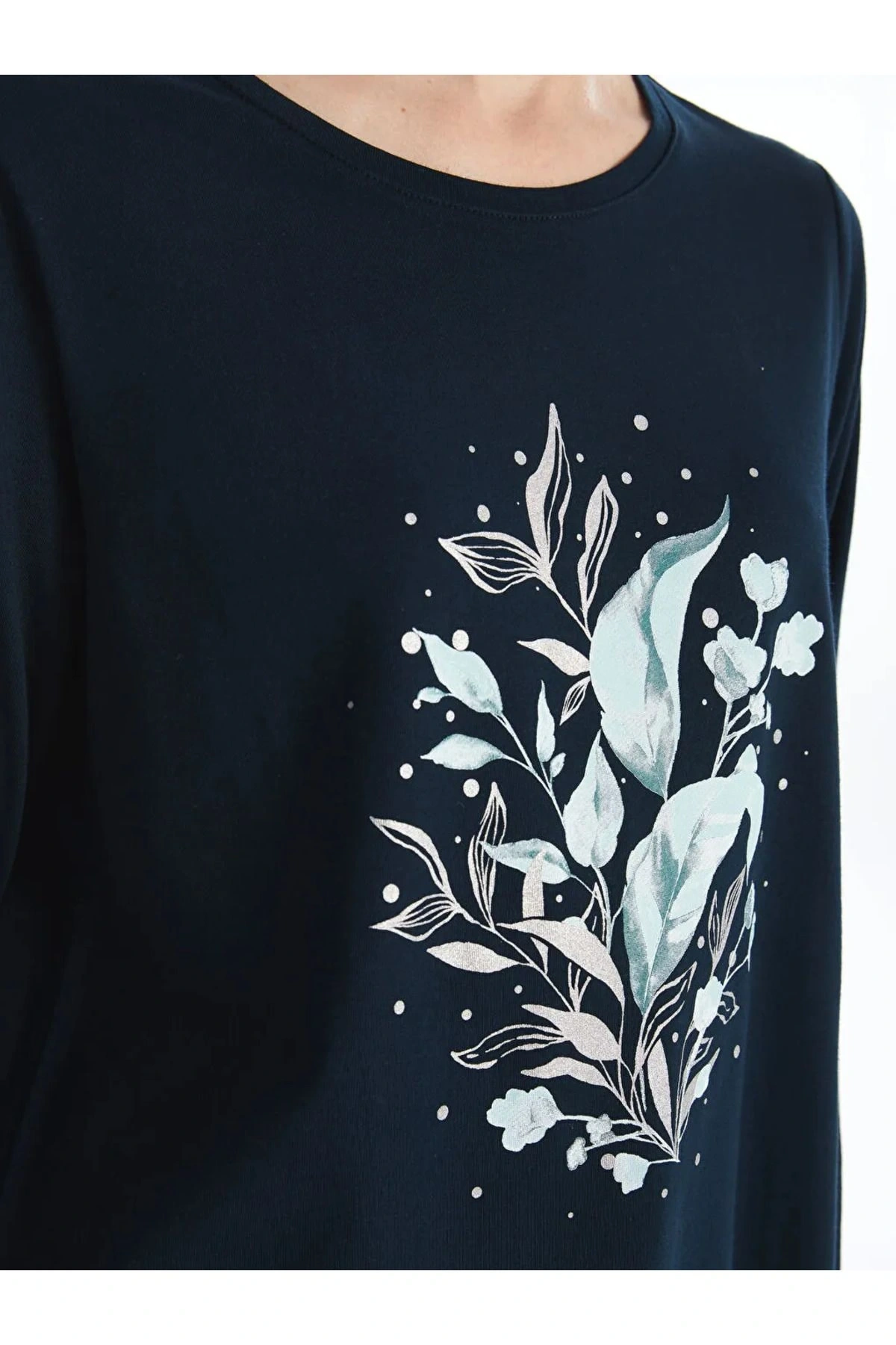 LCW Grace Lacivert Bisiklet Yaka Baskılı Uzun Kollu Kadın Tişört