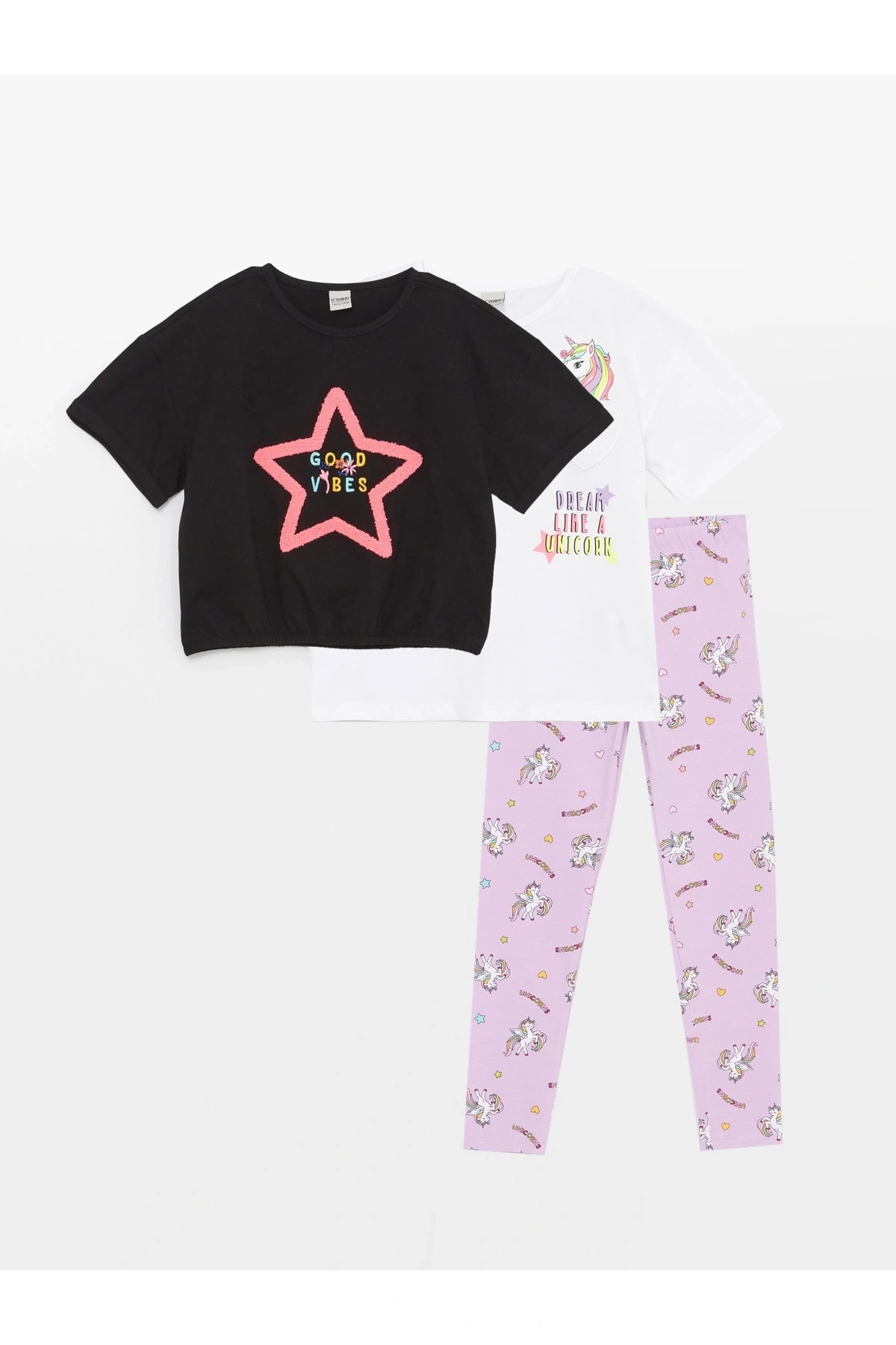Bisiklet Yaka Baskılı Kısa Kollu Kız Çocuk Tişört Ve Tayt 3'lü Takım