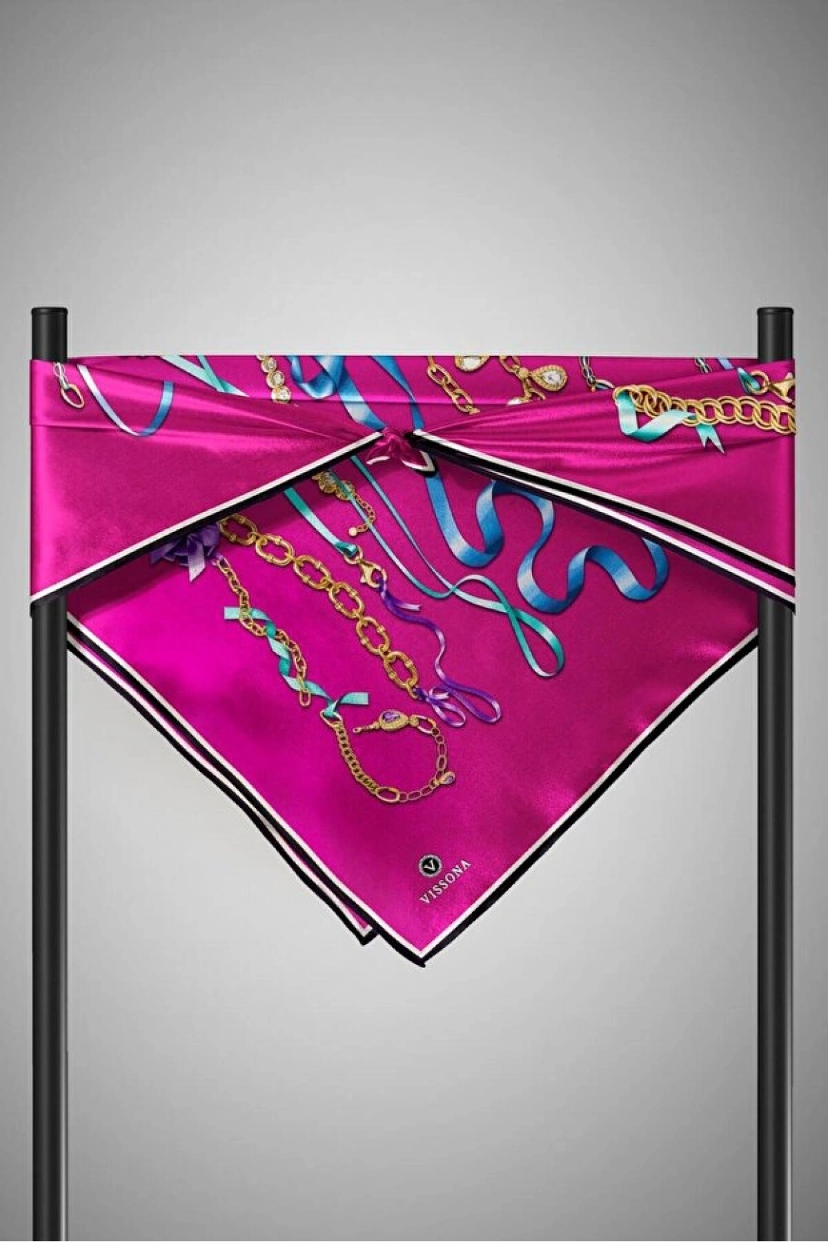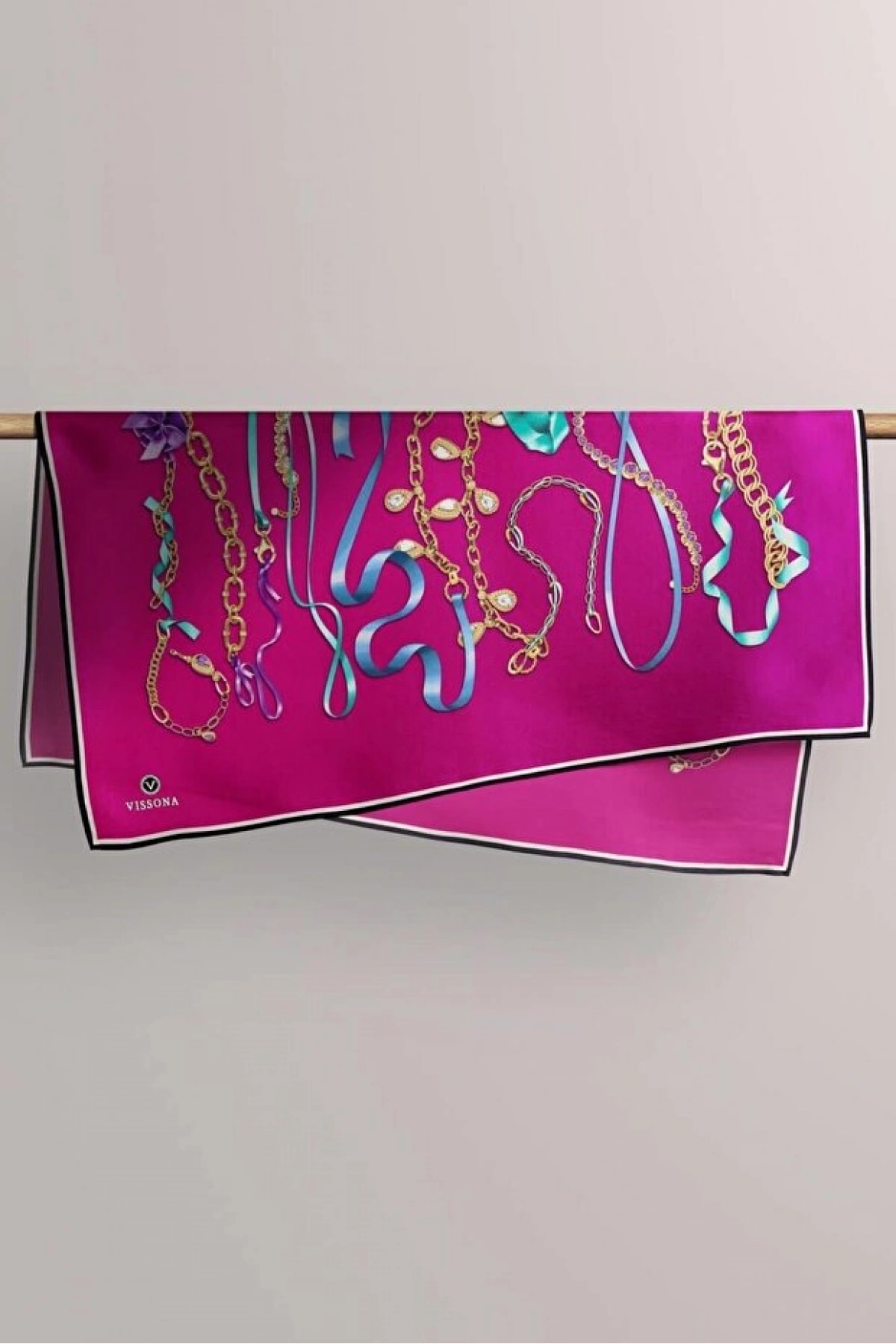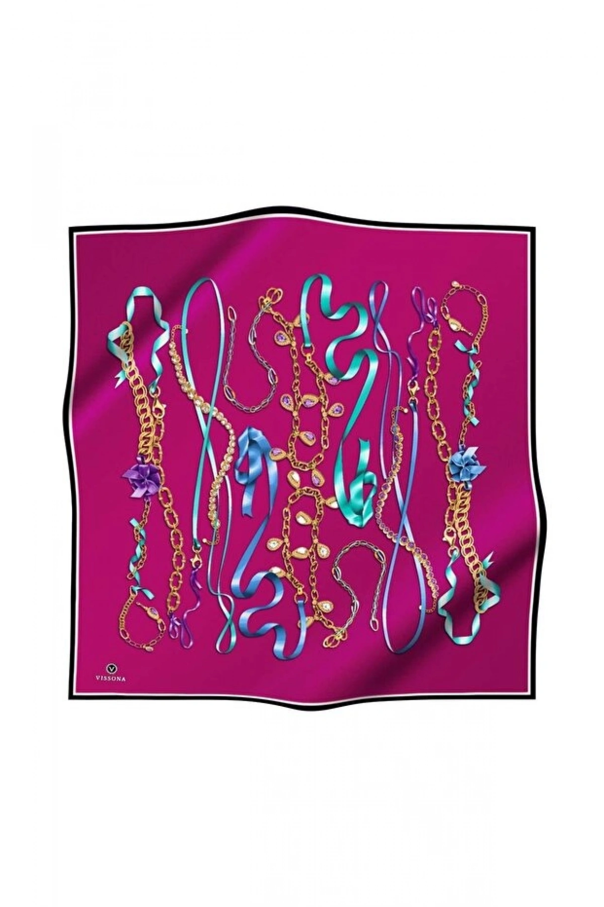 Vissona %100 Twill İpek Kurdele Ve Zincir Desenli Fuşya Renkli 90x90 Eşarp Dikim Şekli : El Dikişi