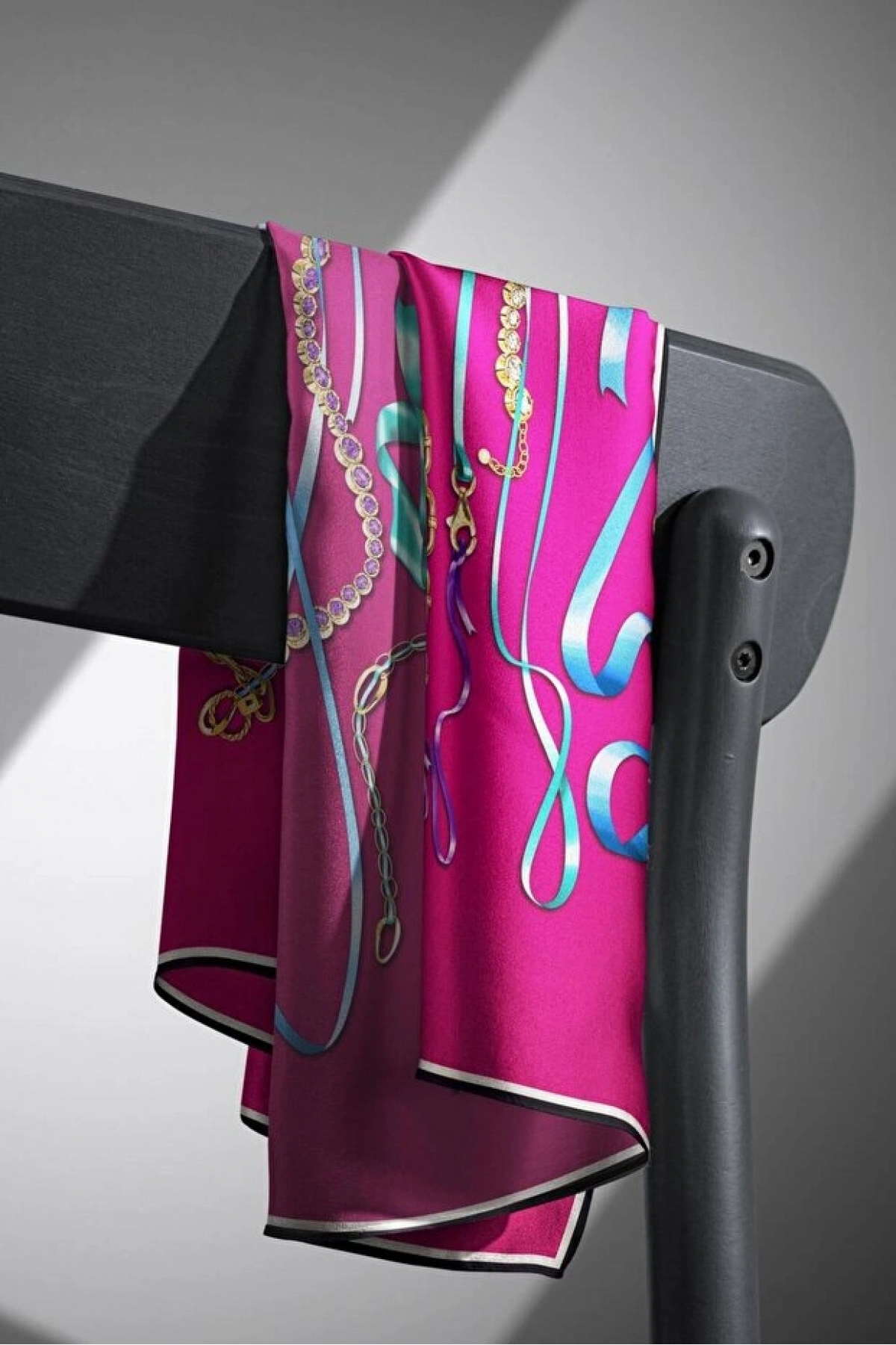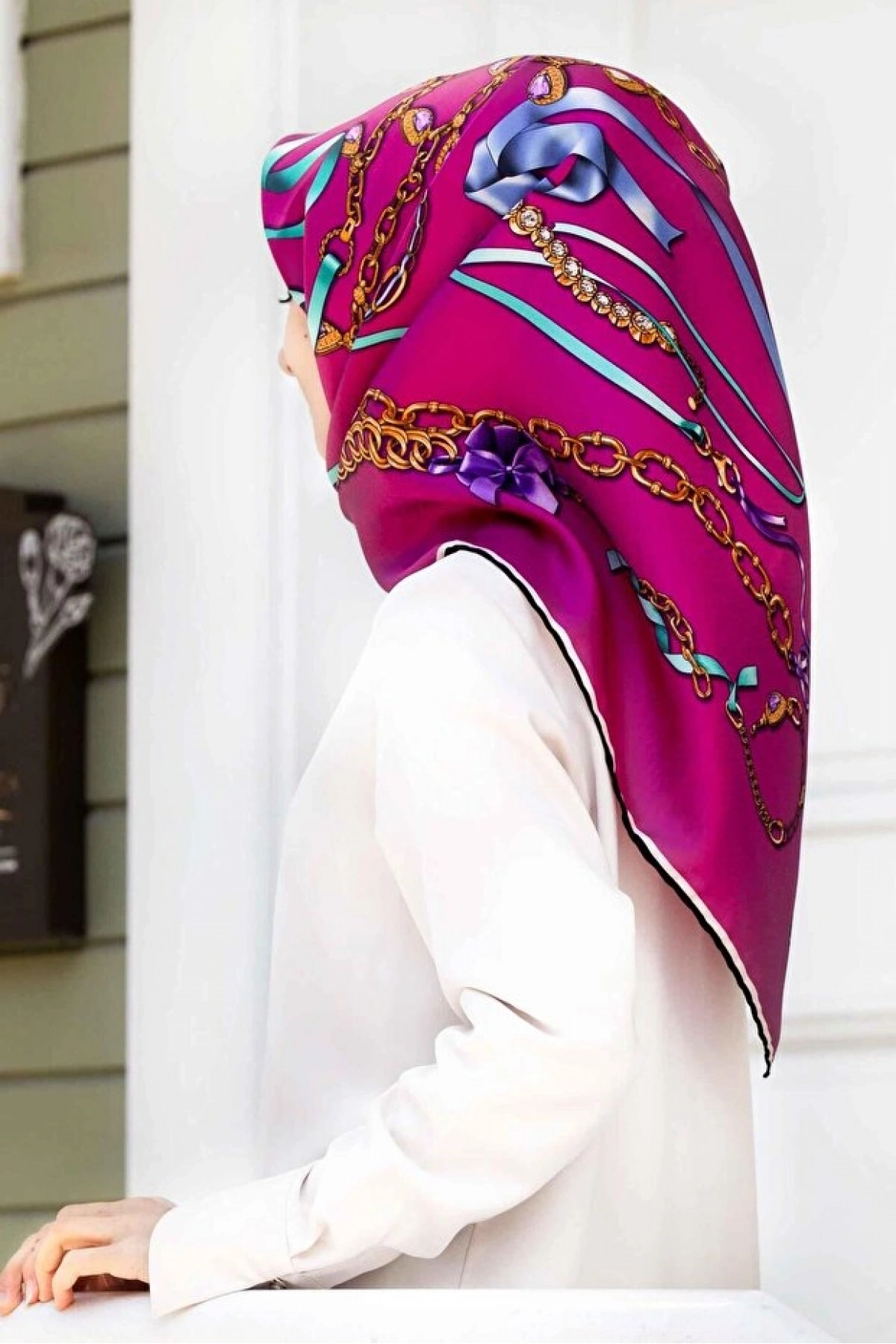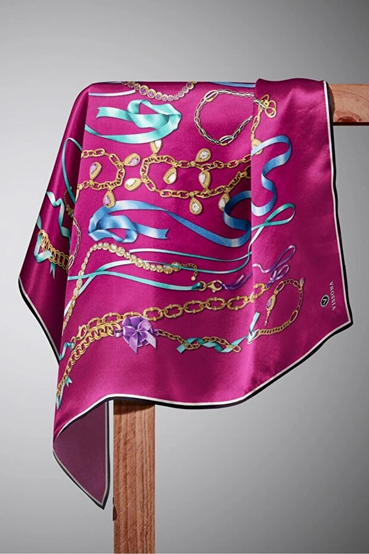 Vissona %100 Twill İpek Kurdele Ve Zincir Desenli Fuşya Renkli 90x90 Eşarp Dikim Şekli : El Dikişi