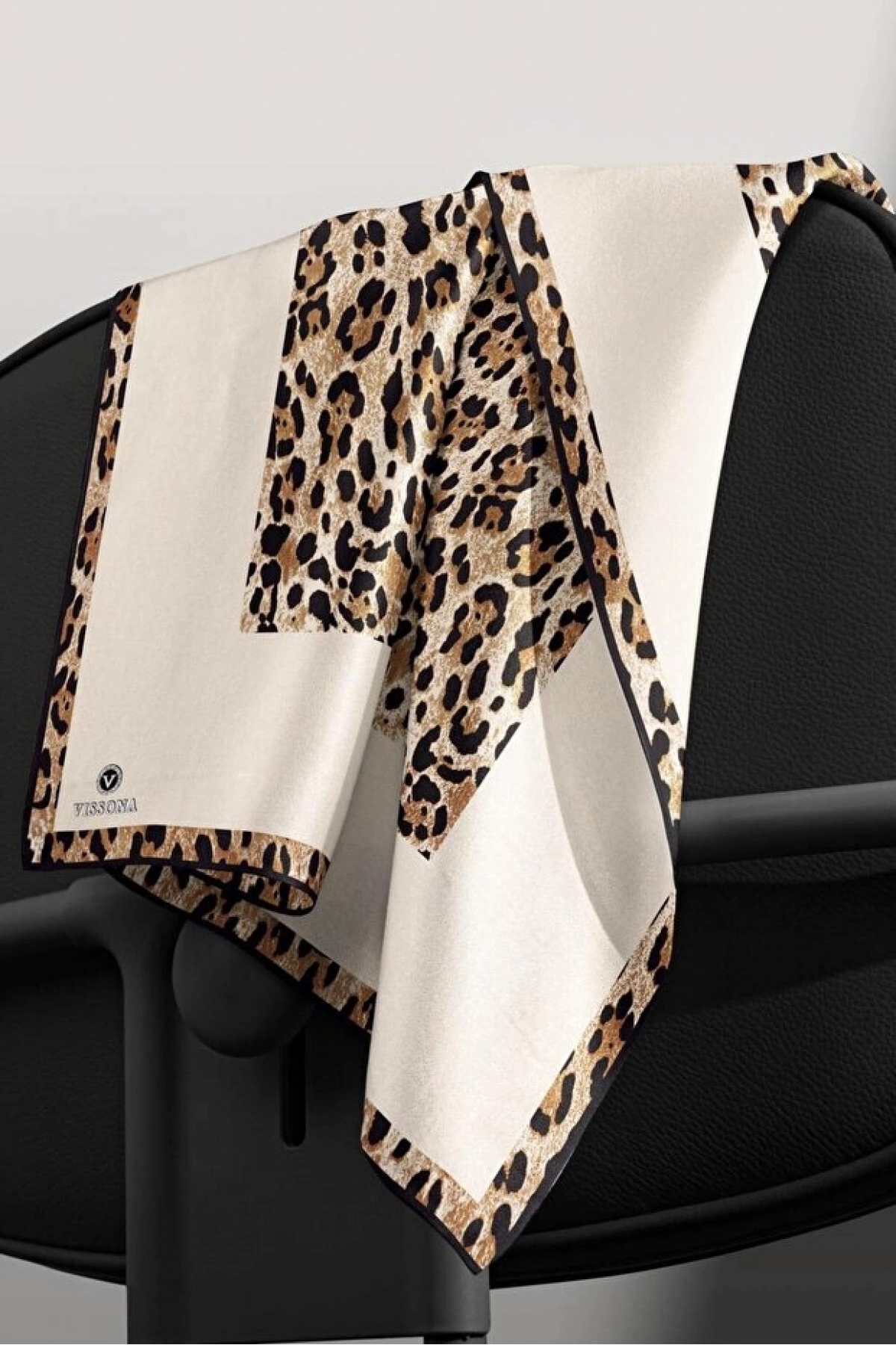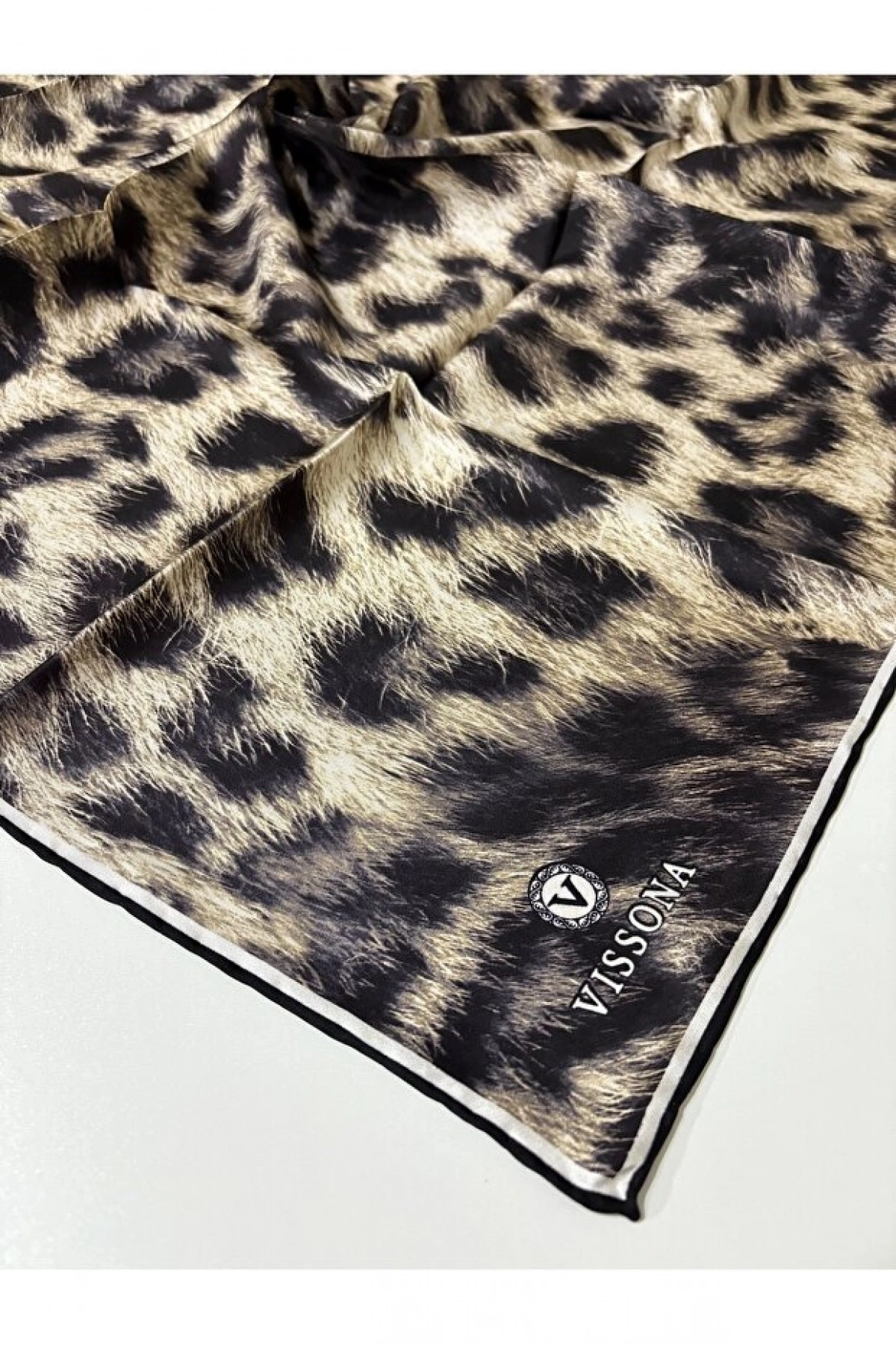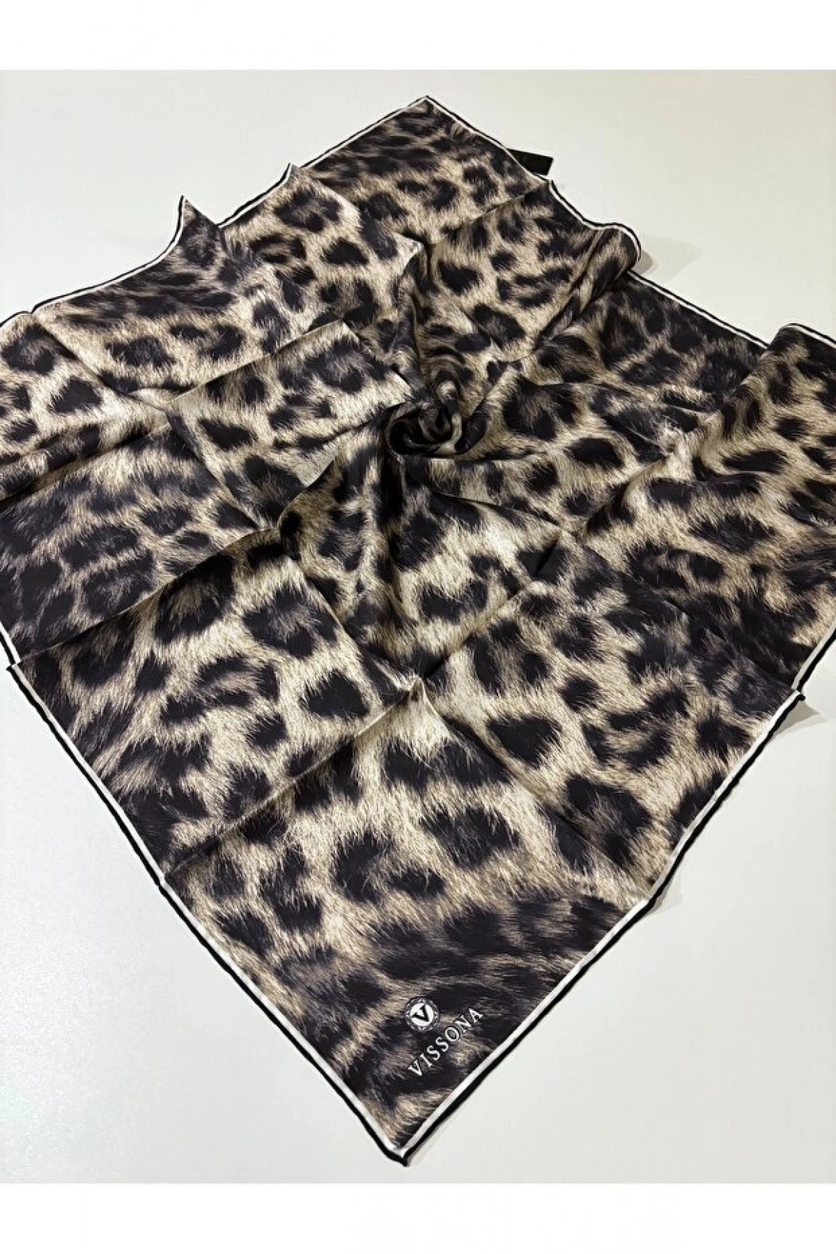 Vissona %100 Twill İpek Leopar Desenli Bej - Siyah Renkli 90x90 Eşarp Dikim Şekli : El Dikişi