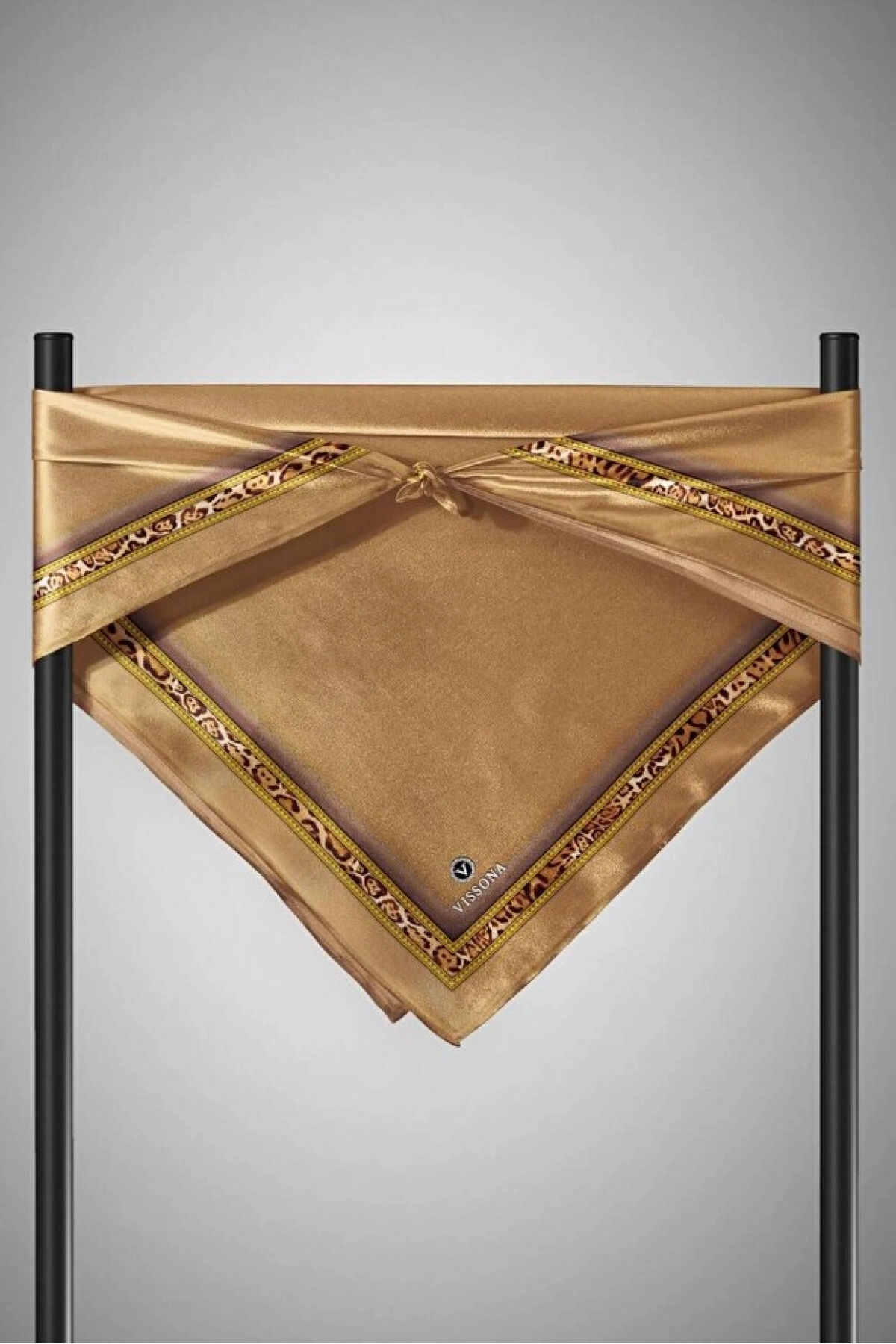Vissona %100 Twill İpek Bordürü Leoparlı Düz Desenli Gold - Gold Renkli 90x90 Eşarp Dikim Şekli : El Dikişi