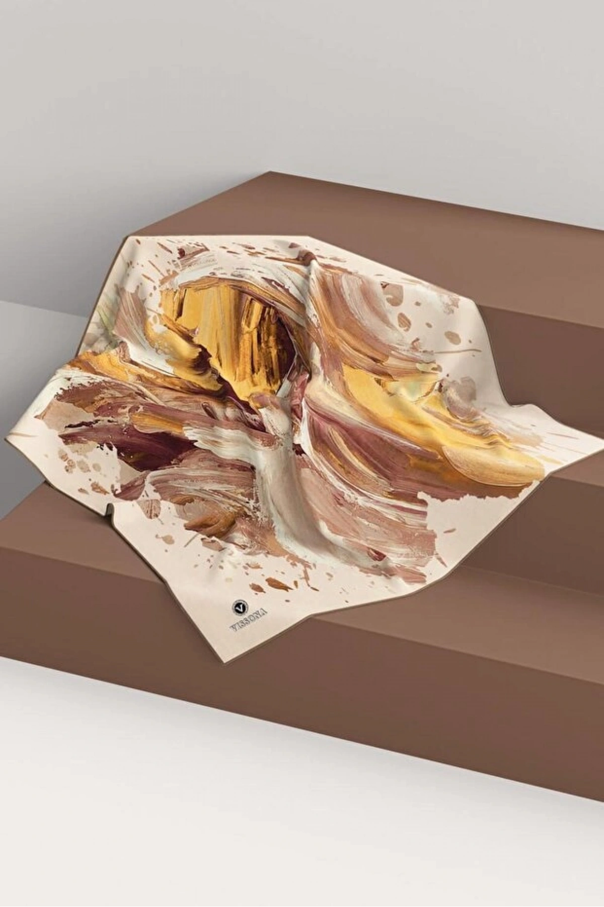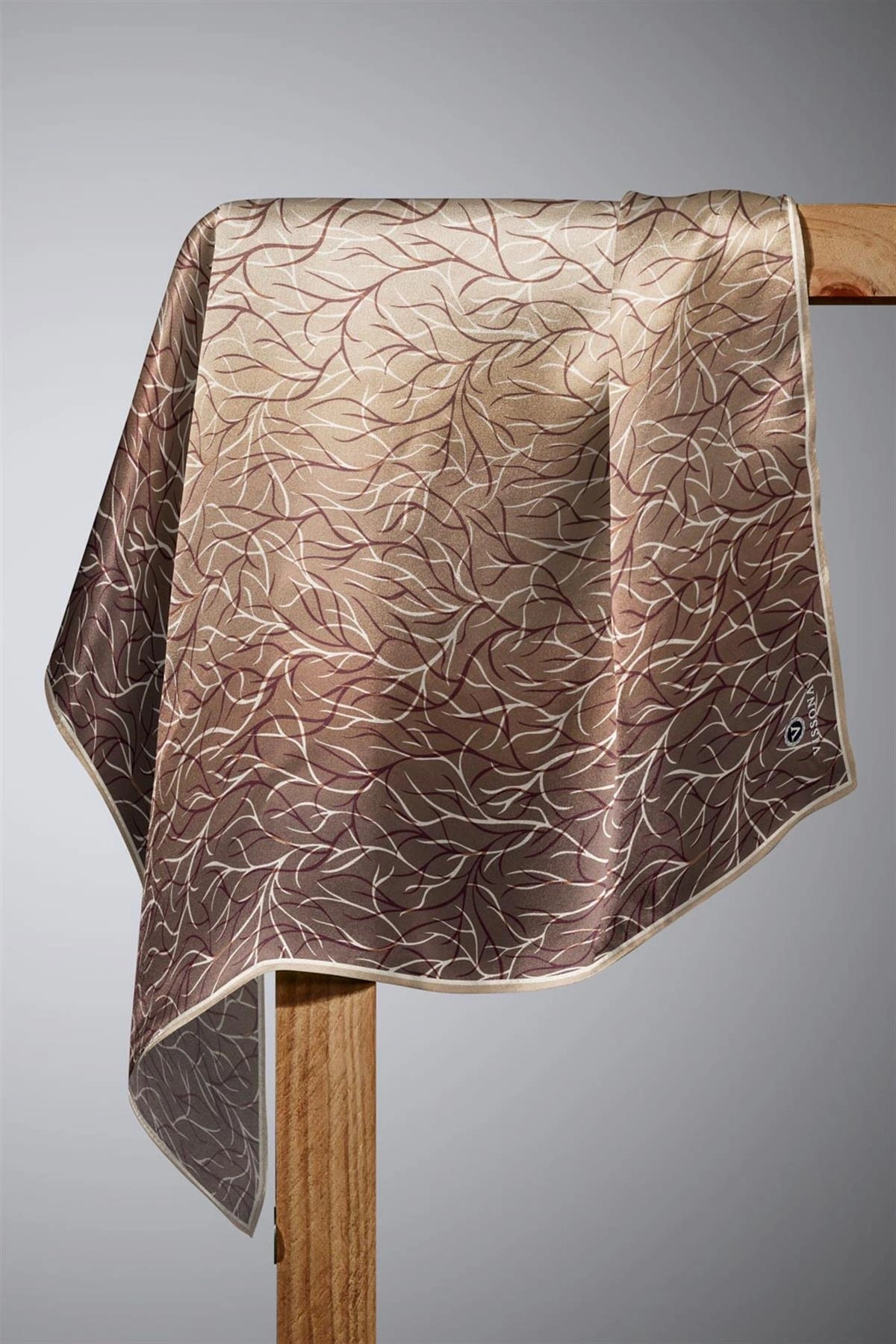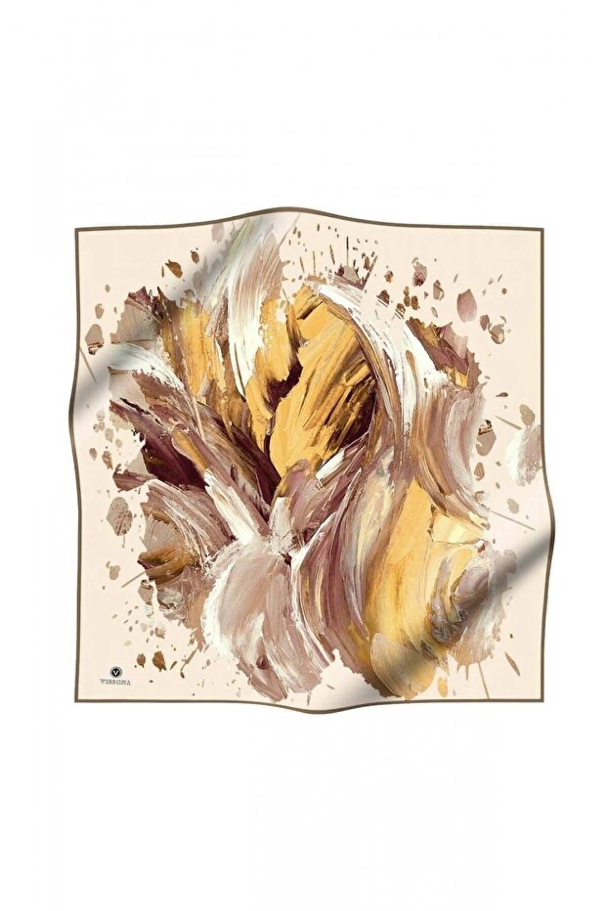 Vissona %100 Twill İpek Fırça Darbesi Desenli Hardal - Vizon Renkli 90x90 Eşarp Dikim Şekli : El Dikişi