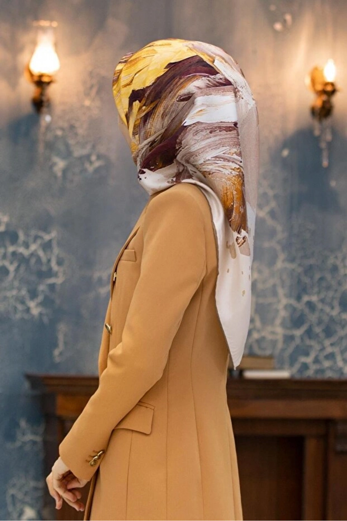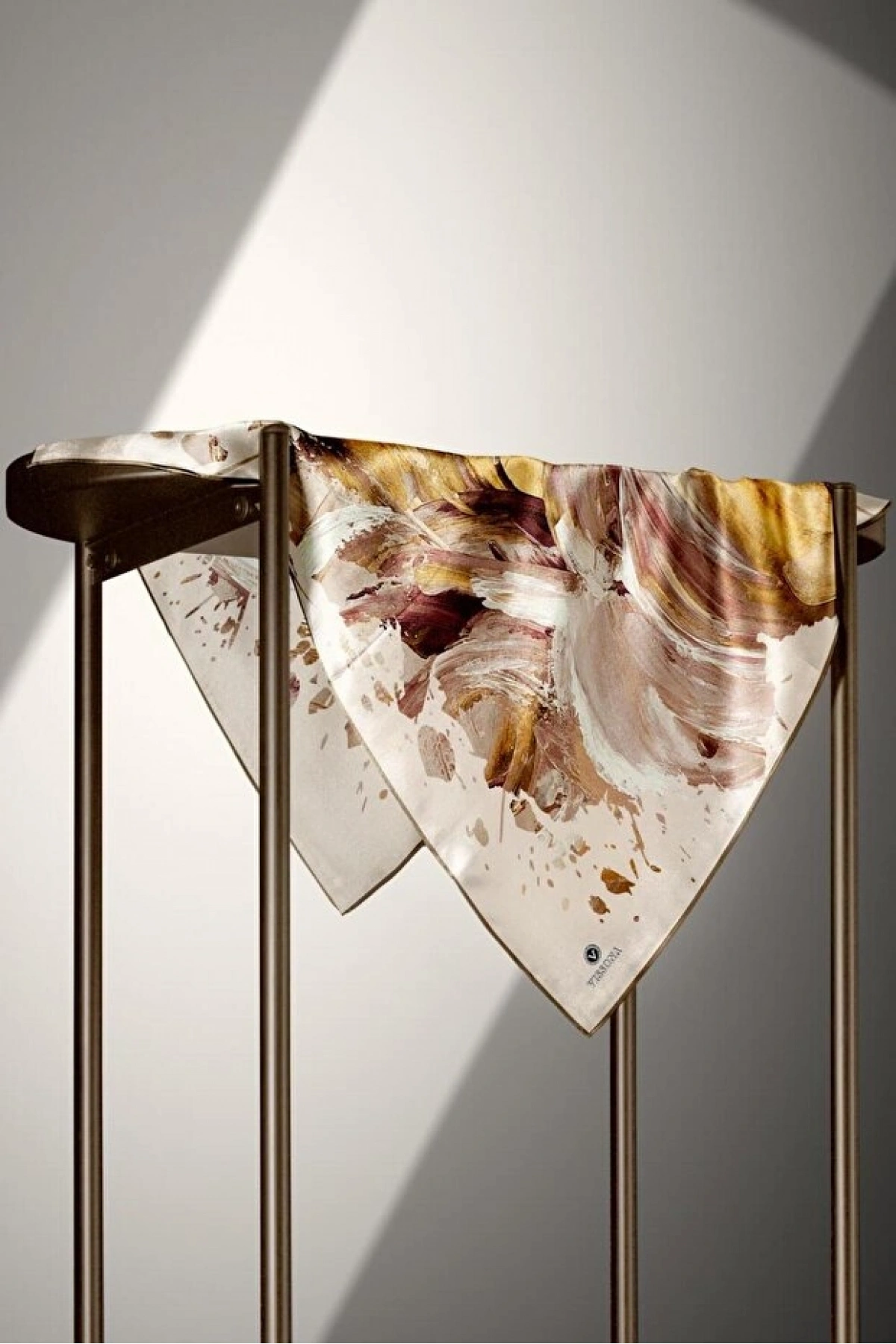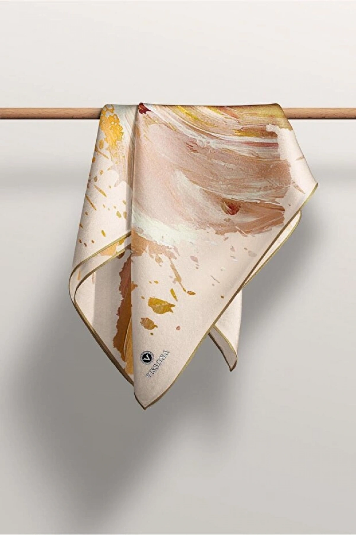 Vissona %100 Twill İpek Fırça Darbesi Desenli Hardal - Vizon Renkli 90x90 Eşarp Dikim Şekli : El Dikişi