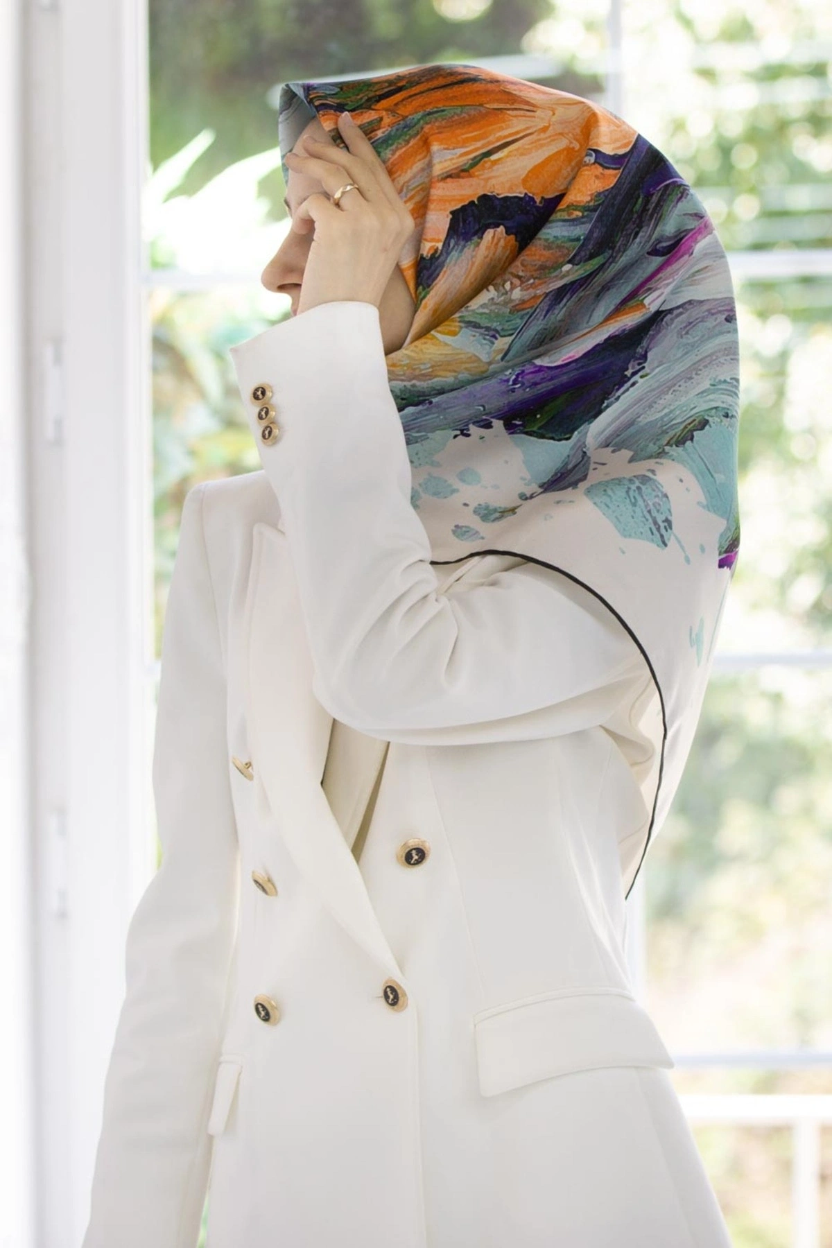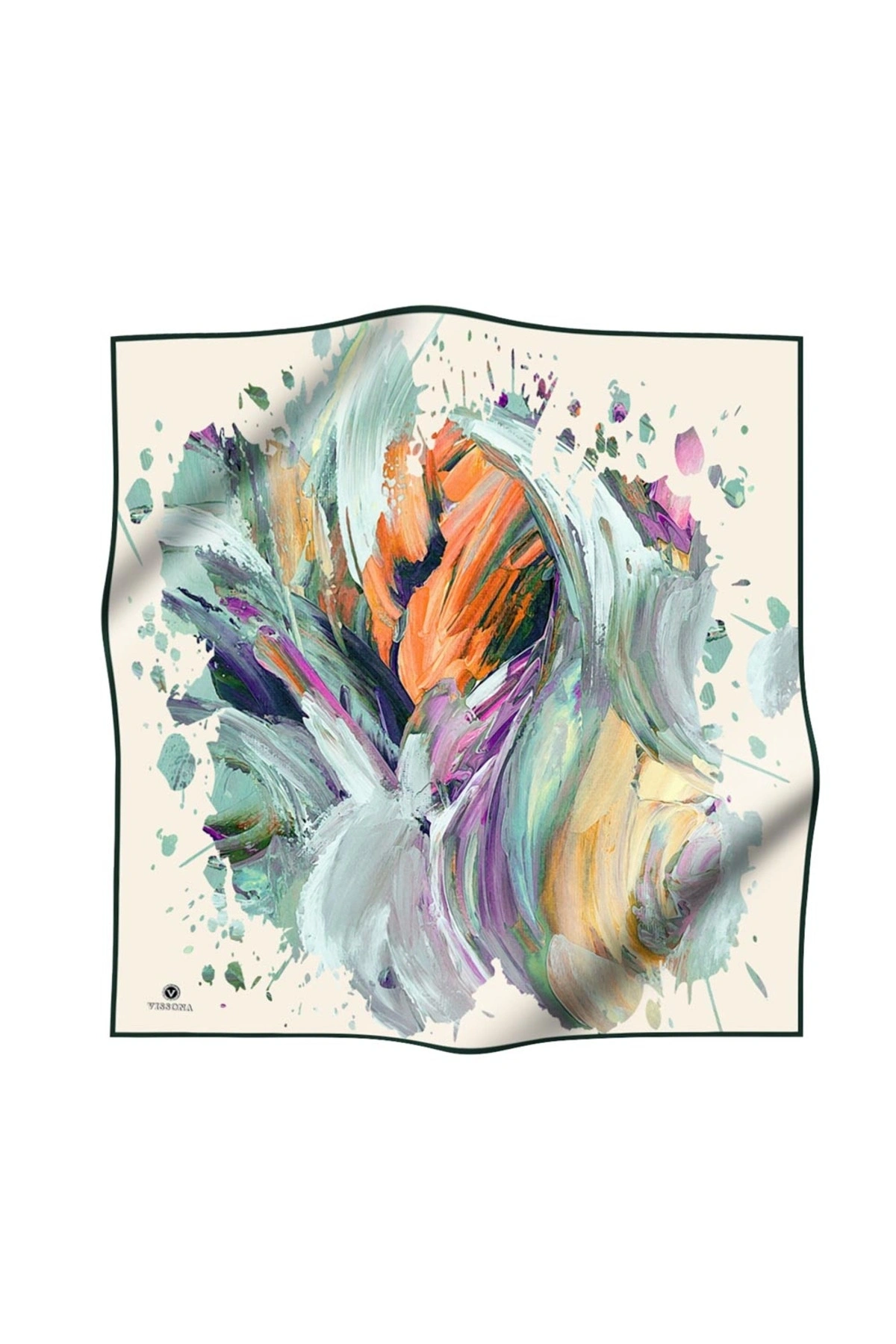 %100 Twill İpek Fırça Darbesi Desenli Su Yeşili - Turuncu Renkli 90x90 Eşarp Dikim Şekli : El Dikişi