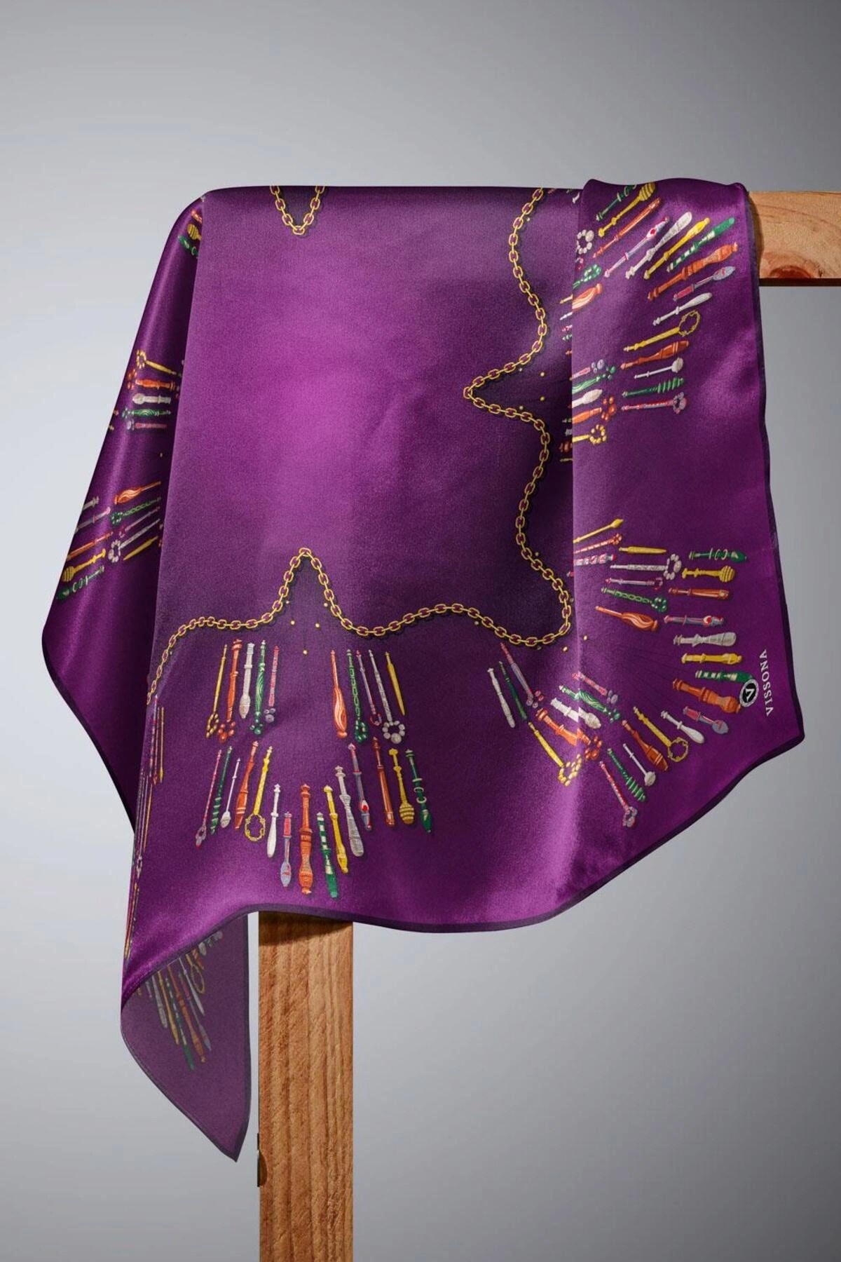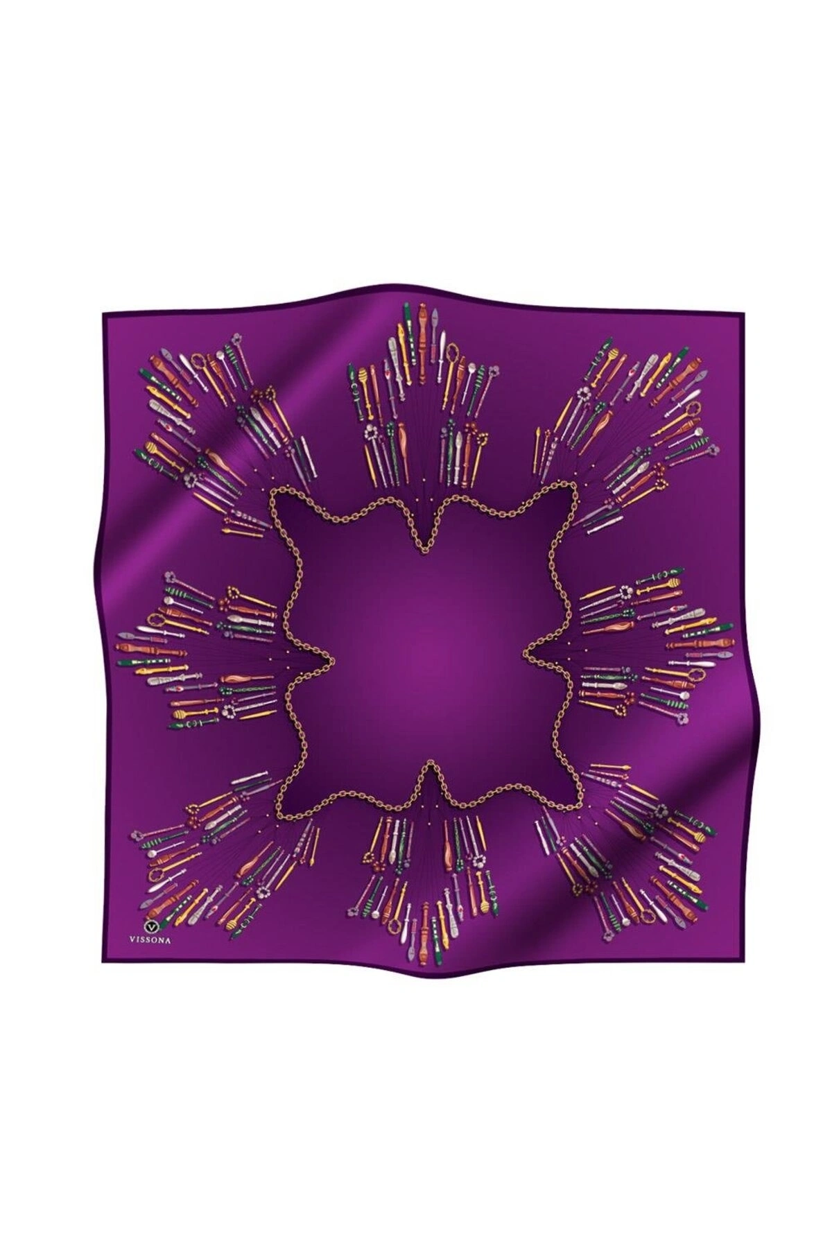 Vissona %100 Twill İpek Zincir Desenli Mürdüm Renkli 90x90 Eşarp Dikim Şekli : El Dikişi