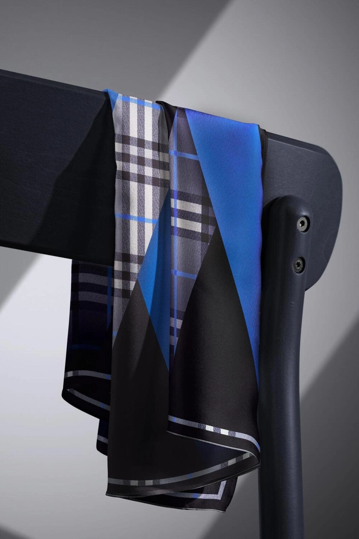 %100 Twill İpek Geometrik Çizgi Desenli Lacivert - Saks Renkli 90x90 Eşarp Kenar Dikiş Şekli El Diki