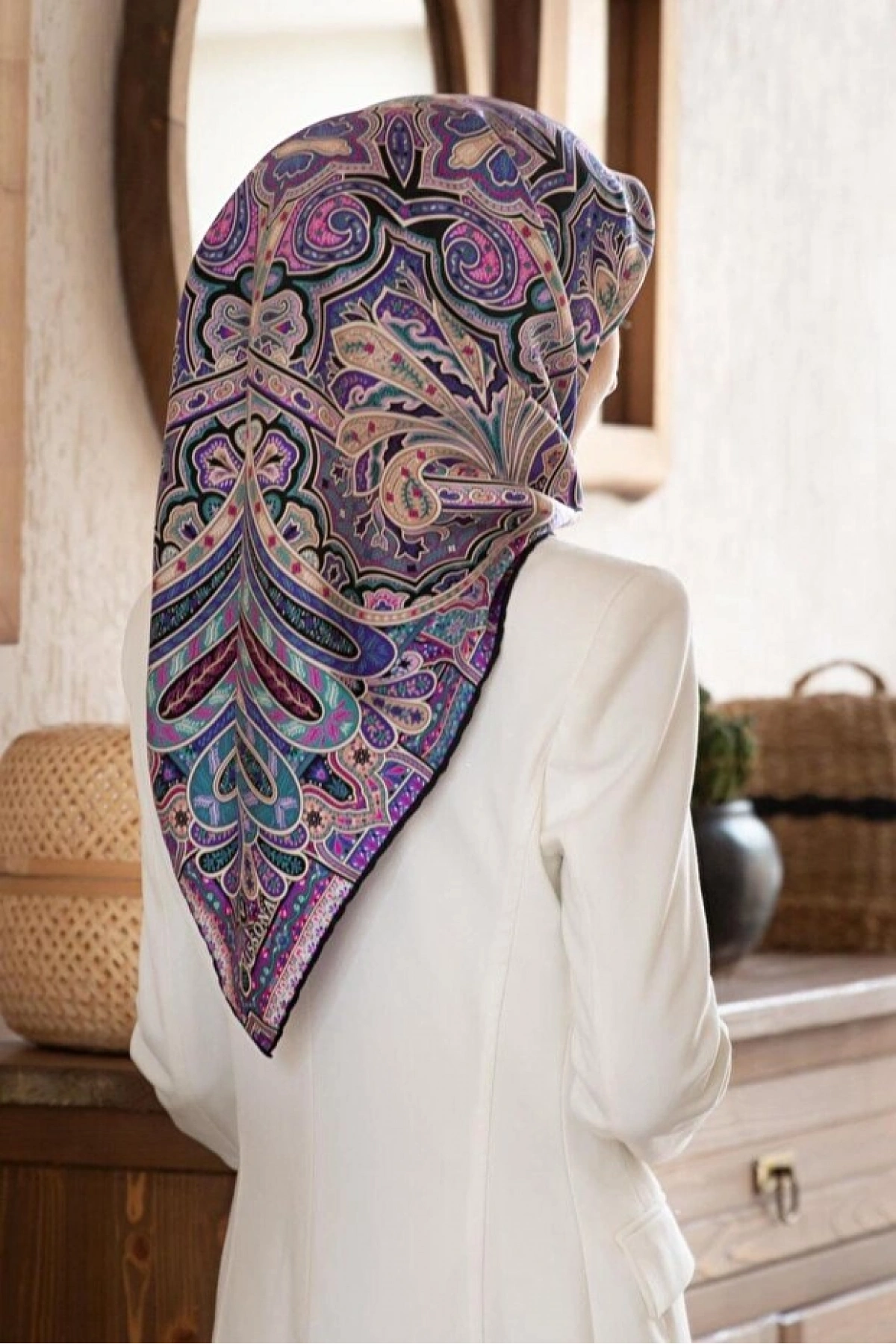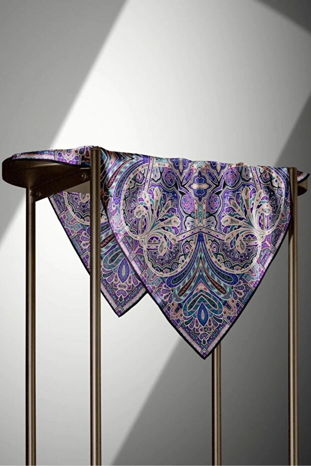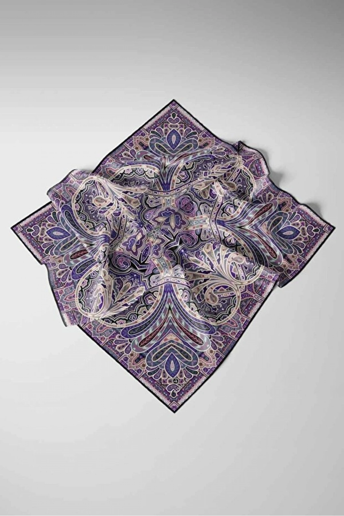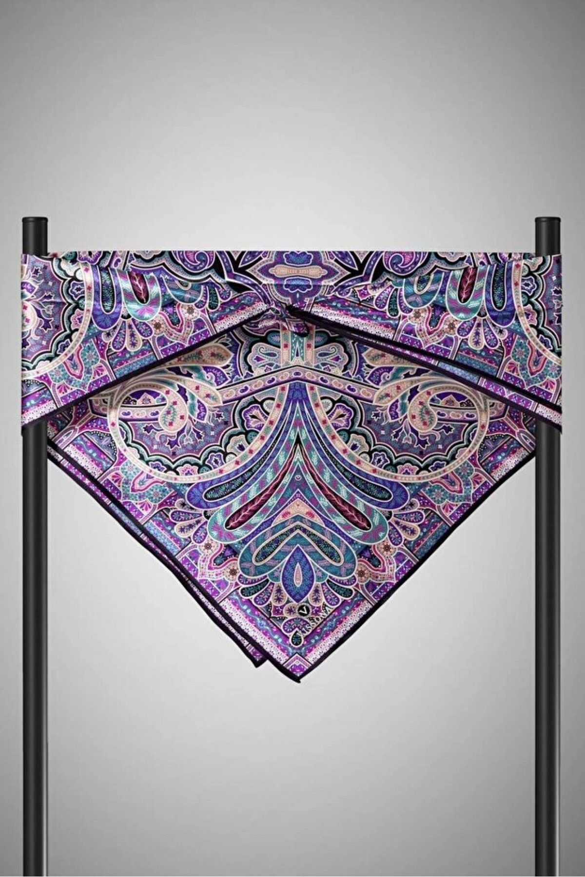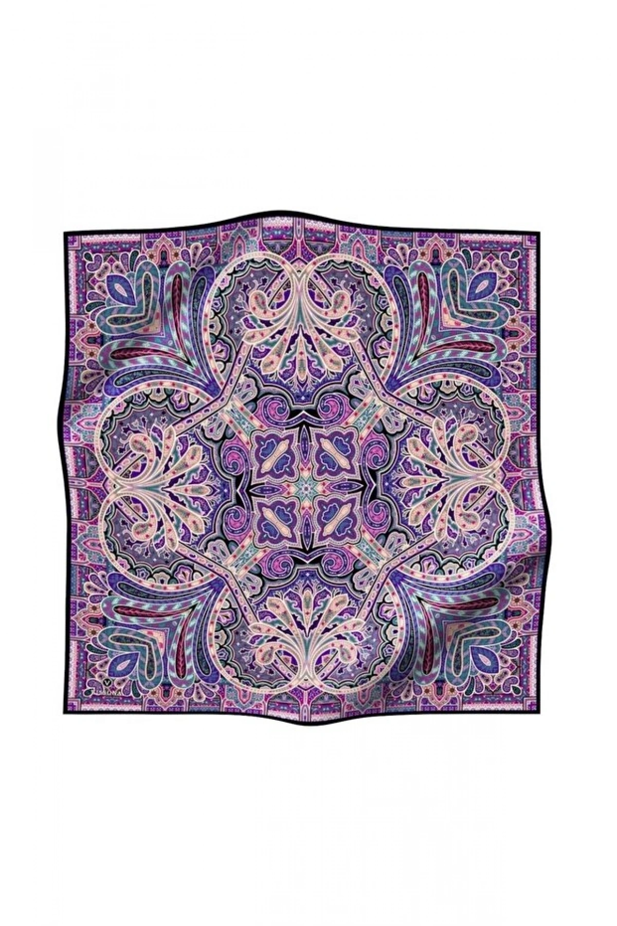 Vissona 100% Twill İpek Etnik Desenli Mor - Petrol Yeşili Renkli 90x90 Dikim Şekli : El Dikişi Eşarp