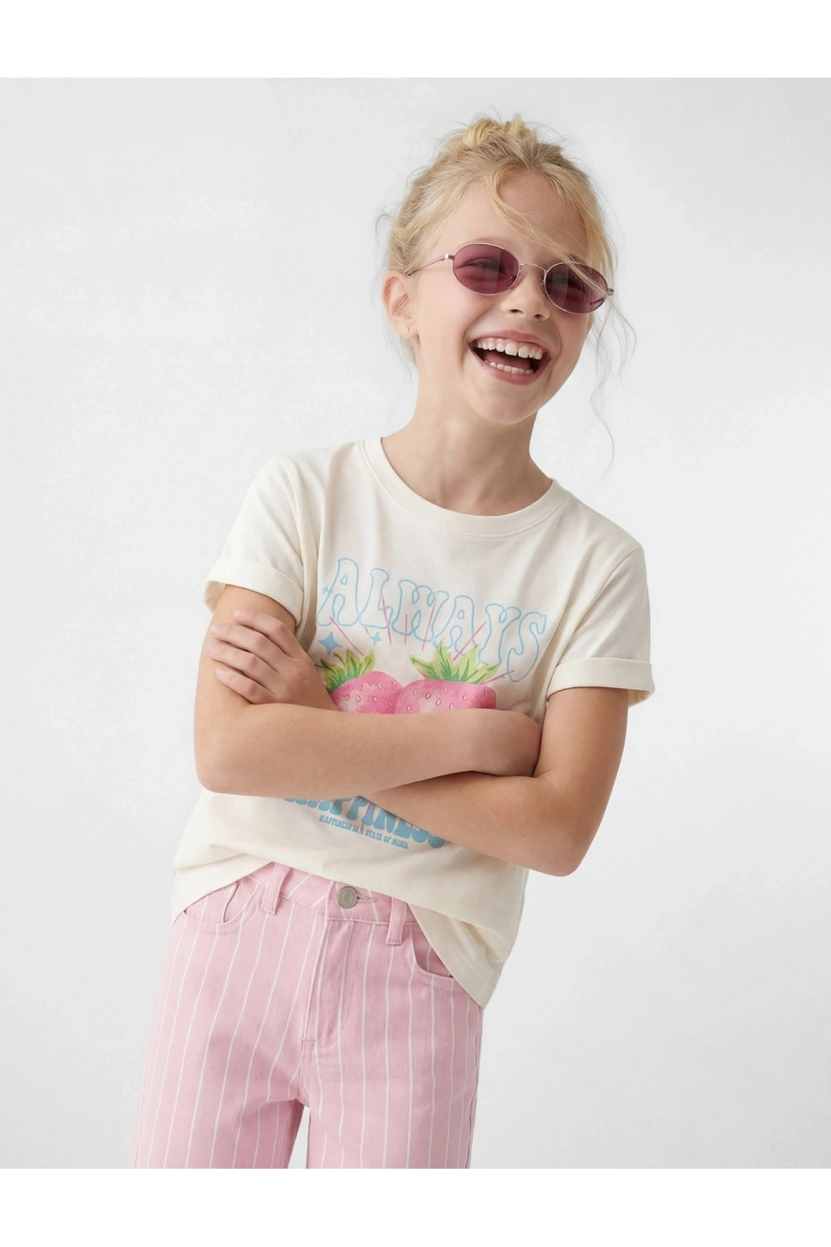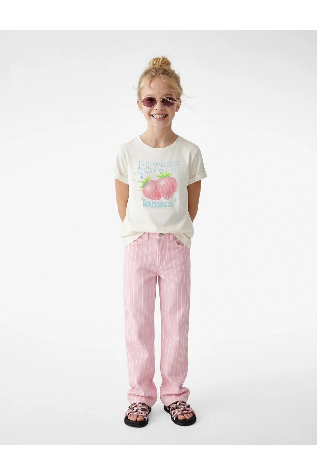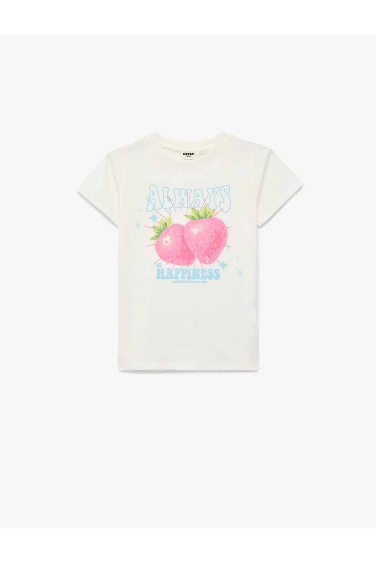 Kız Çocuk Pamuklu Kısa Kollu Bisiklet Yaka Çilek Baskılı Tişört