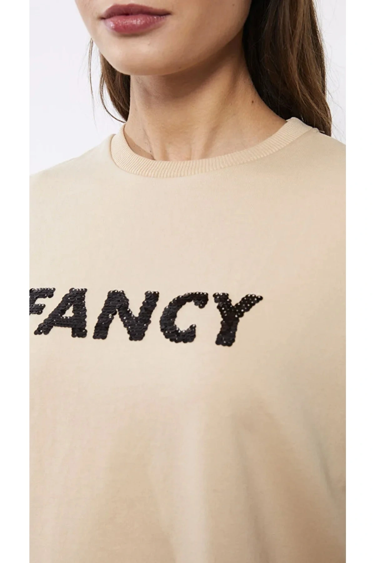 LCWAIKIKI Basic Siyah Bisiklet Yaka Pul İşlemeli Oversize Kadın Sweatshirt Tunik