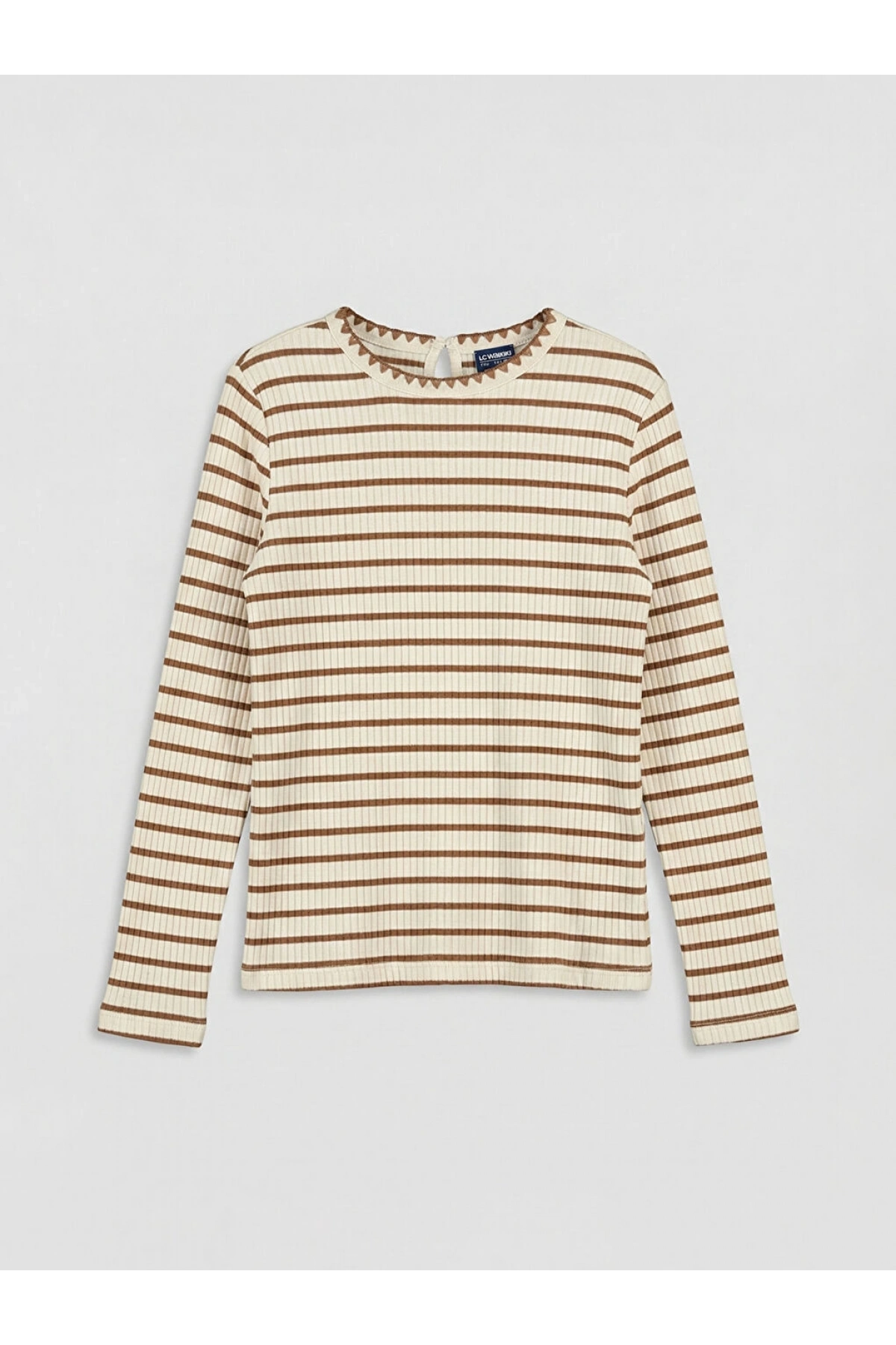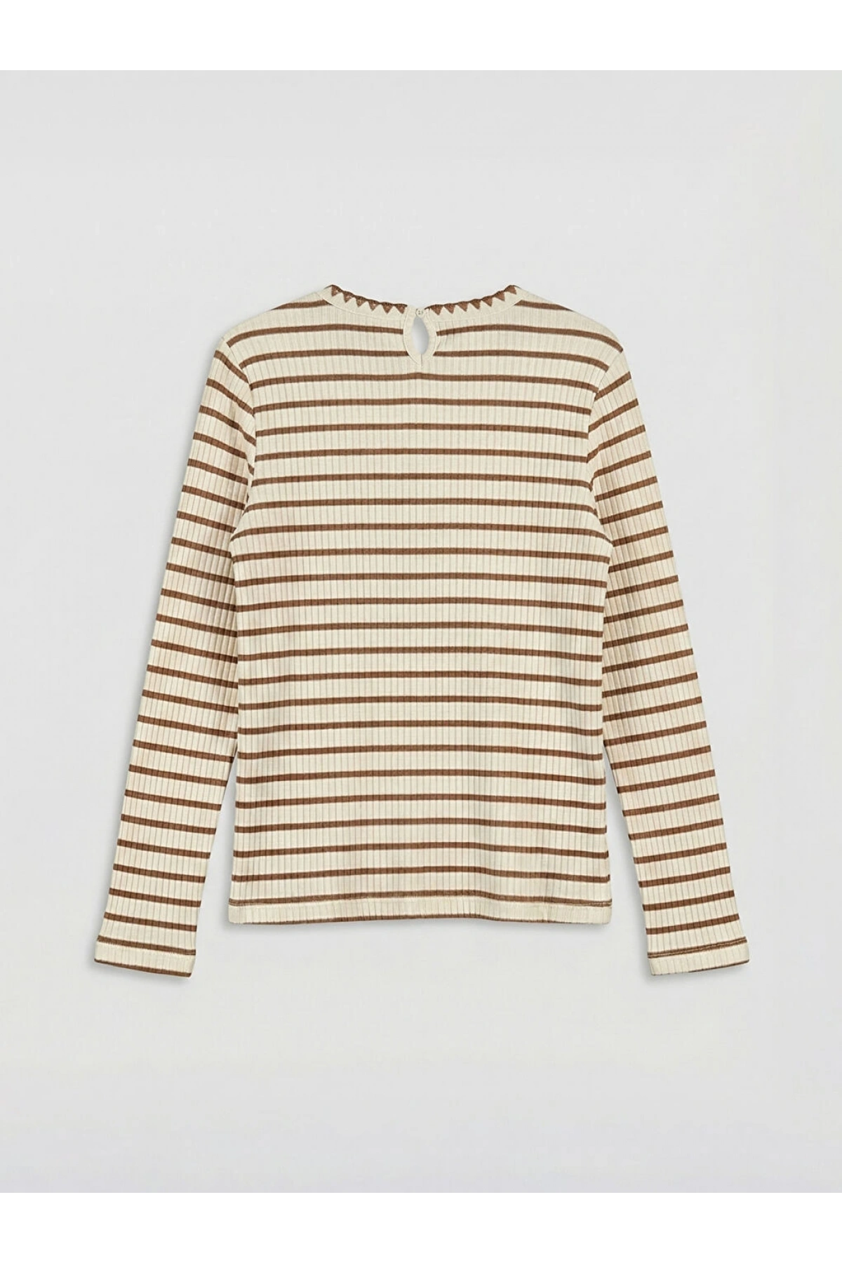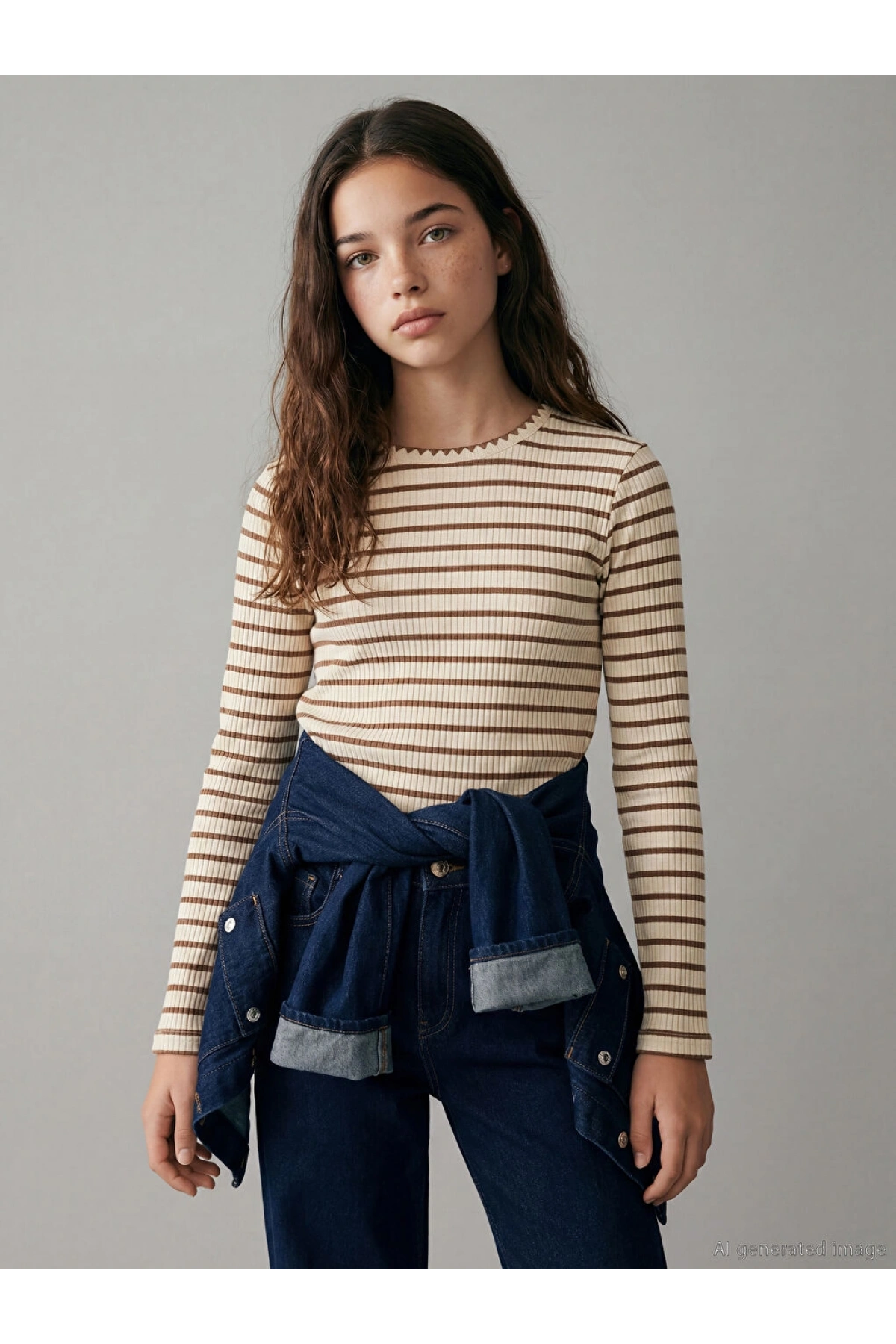 LCW Kids Bej Bisiklet Yaka Çizgili Kız Çocuk Tişört