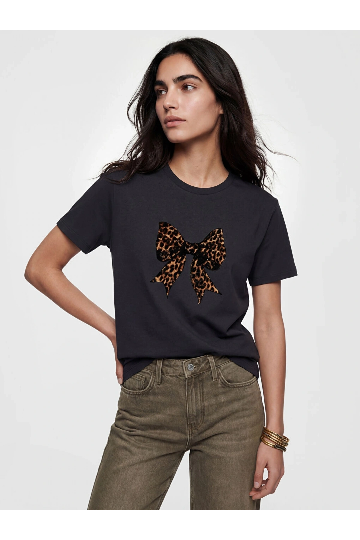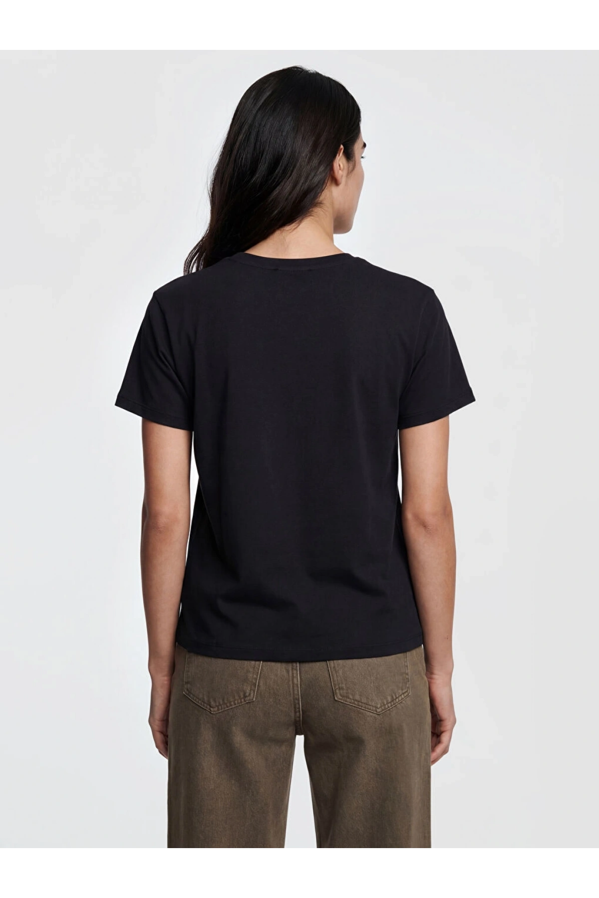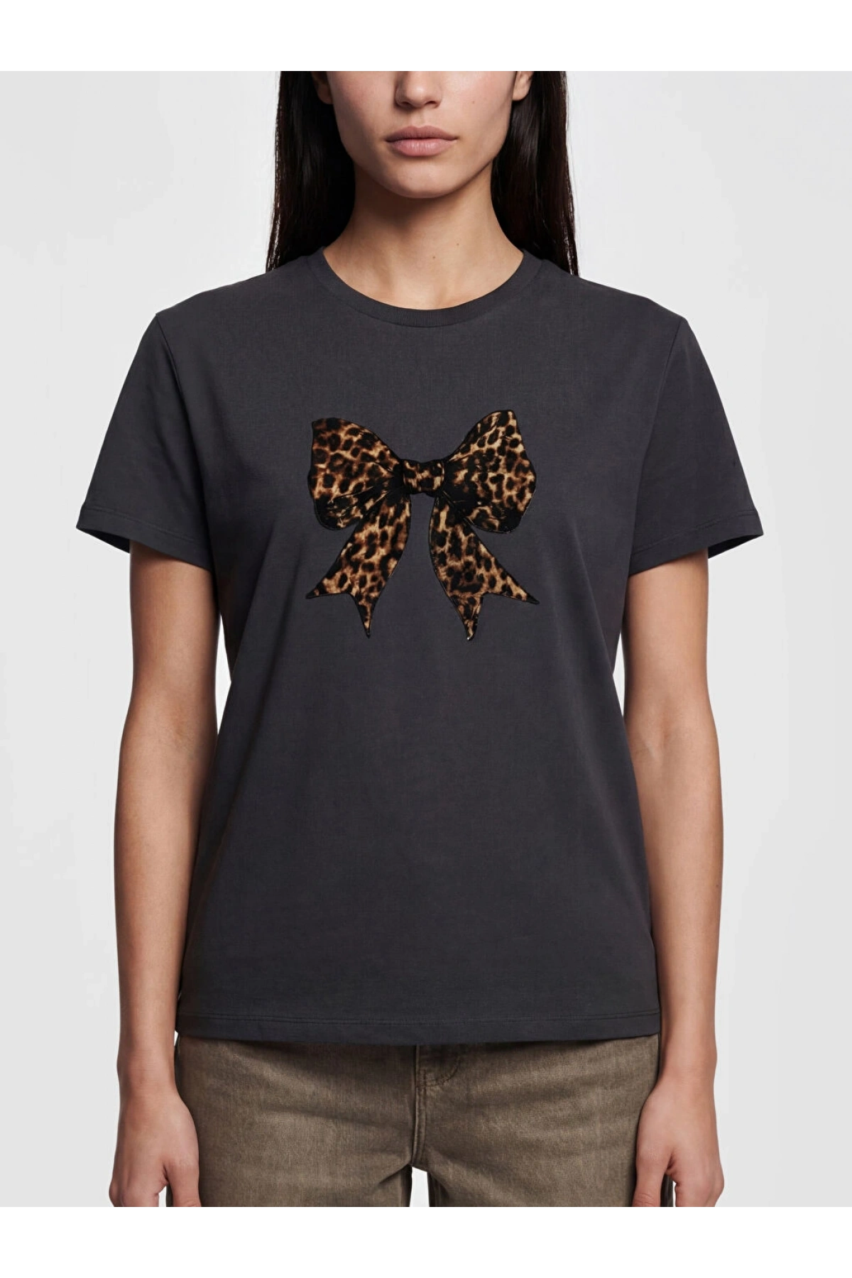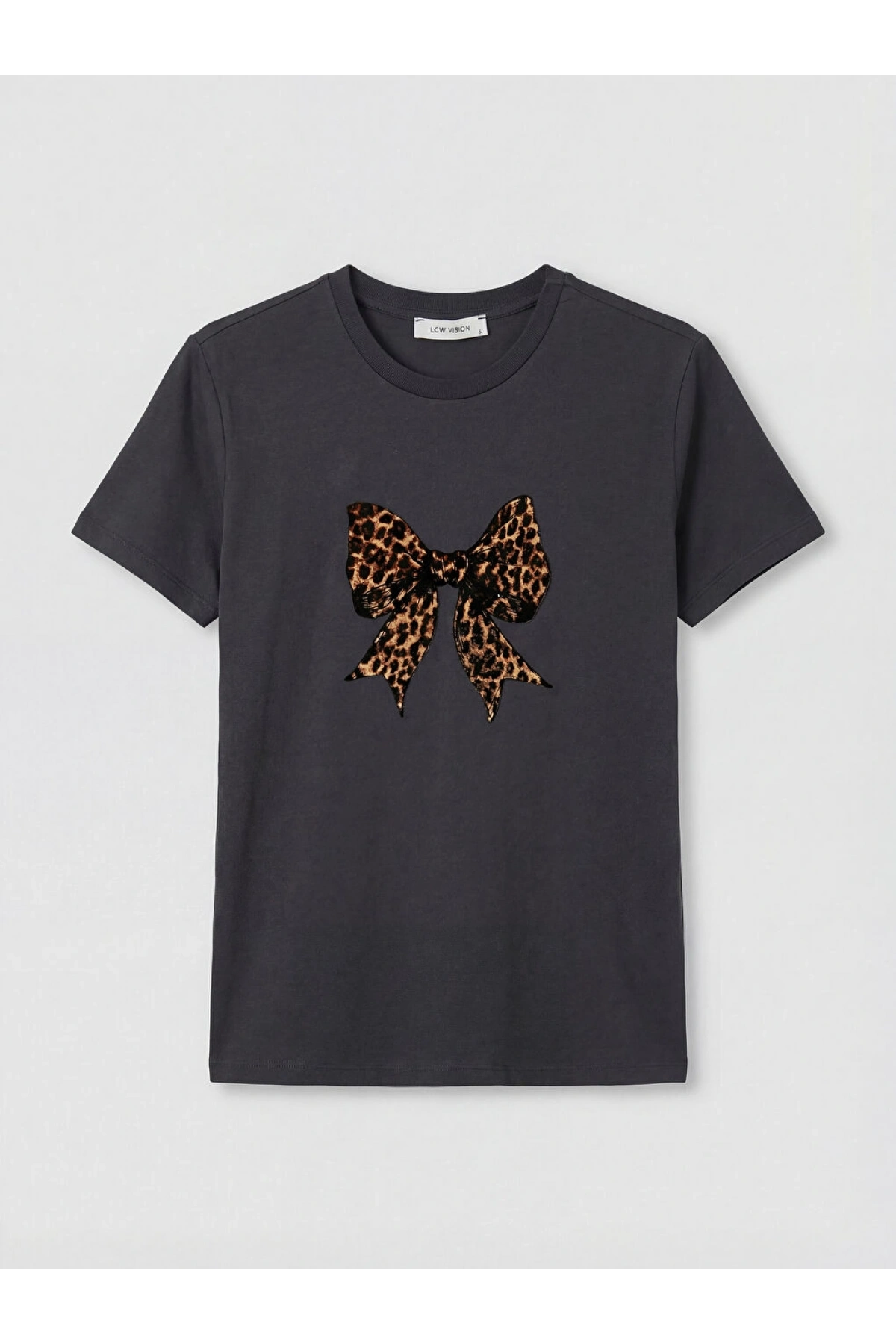 LCW Vision Siyah Bisiklet Yaka Fiyonk Baskılı Kadın Tişört