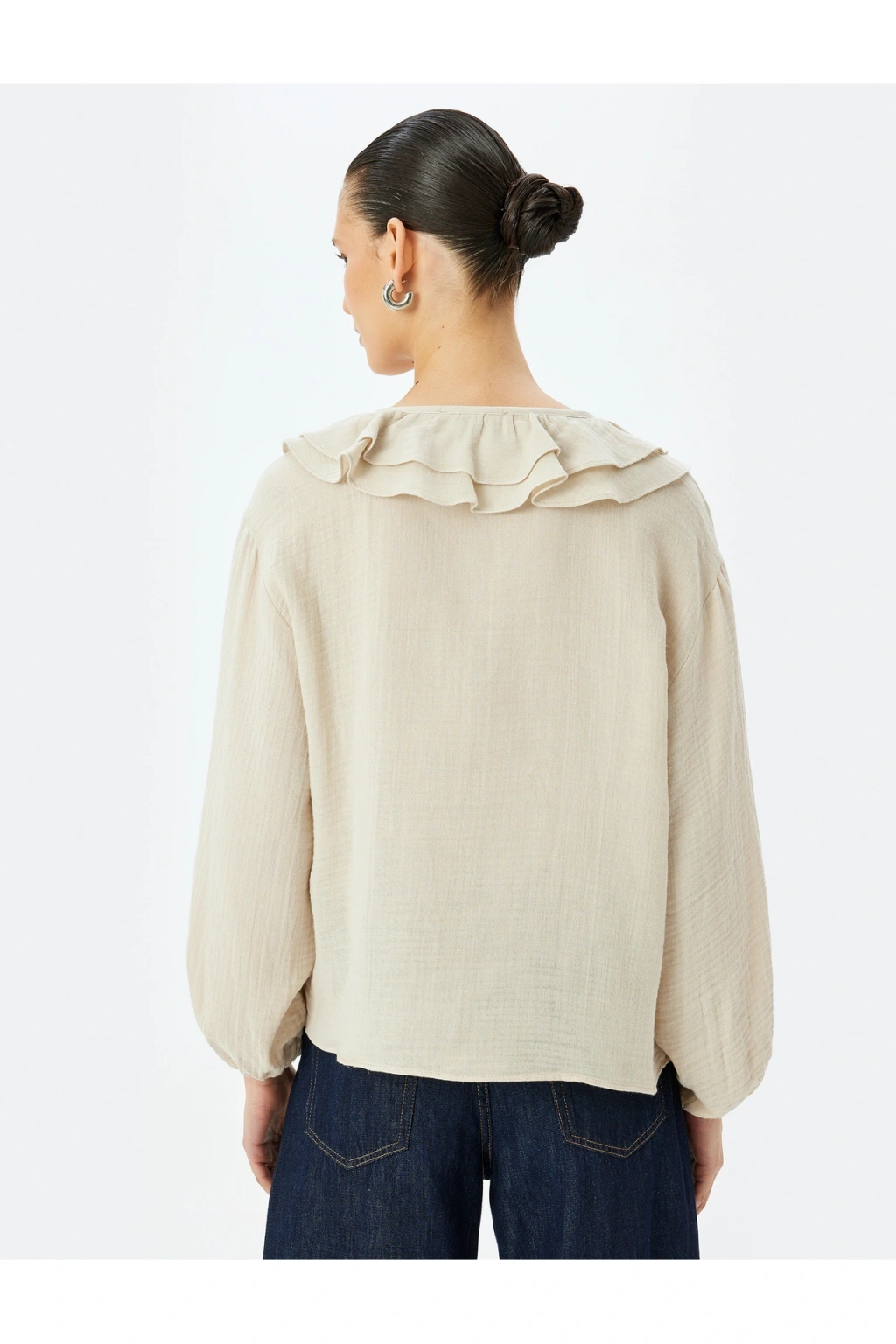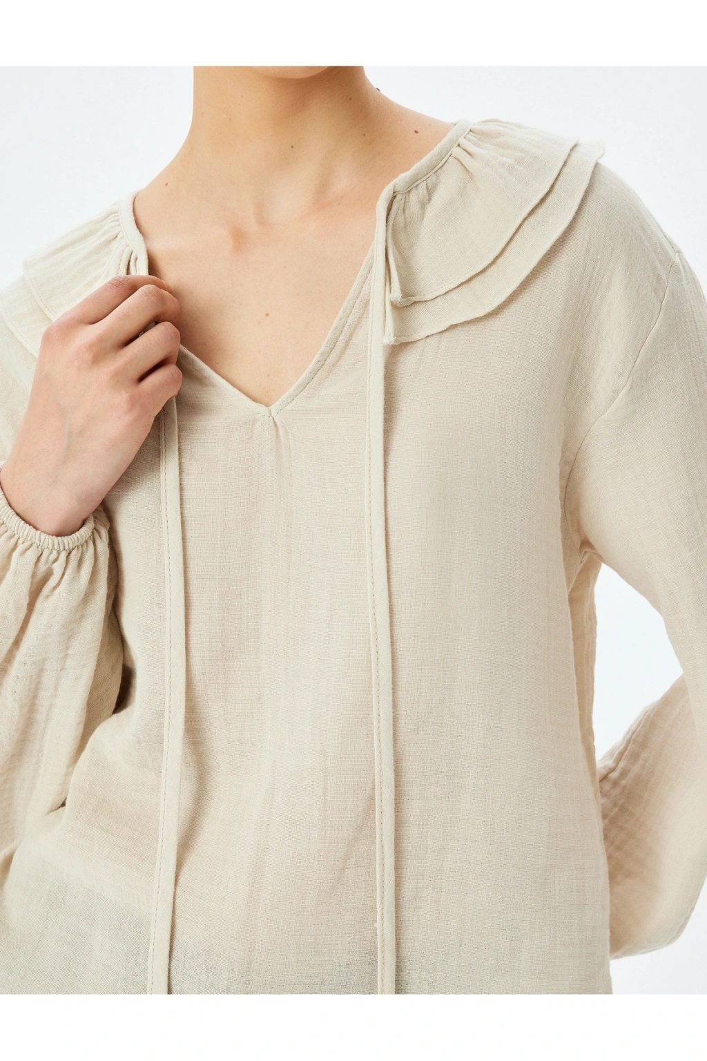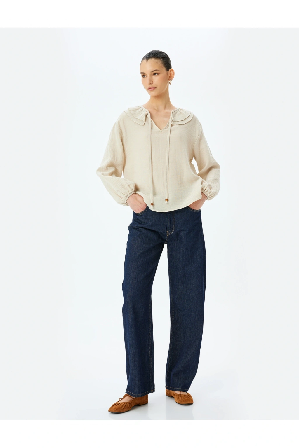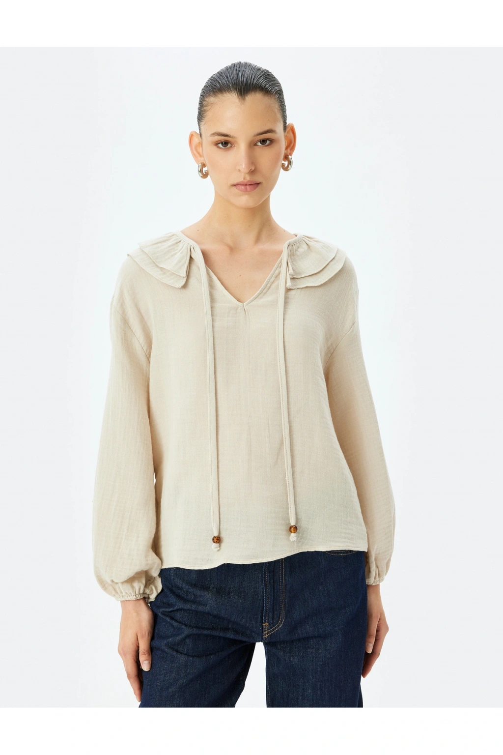 Manşetleri lastikli uzun kollu müslin bluz, şıklığı ve rahatlığı bir arada sunuyor. Bebe yaka tasarımı ve bağcık detayı ile öne çıkan model, stilinize klasik ve zarif bir hava katıyor. Uzun kolları ve düşük omuz tasarımıyla günlük kombinler için mükemmel bir seçim sağlıyor. Bluzu ister ofis stilinizde ister günlük kombinlerinizde rahatlıkla tercih edebilirsiniz.