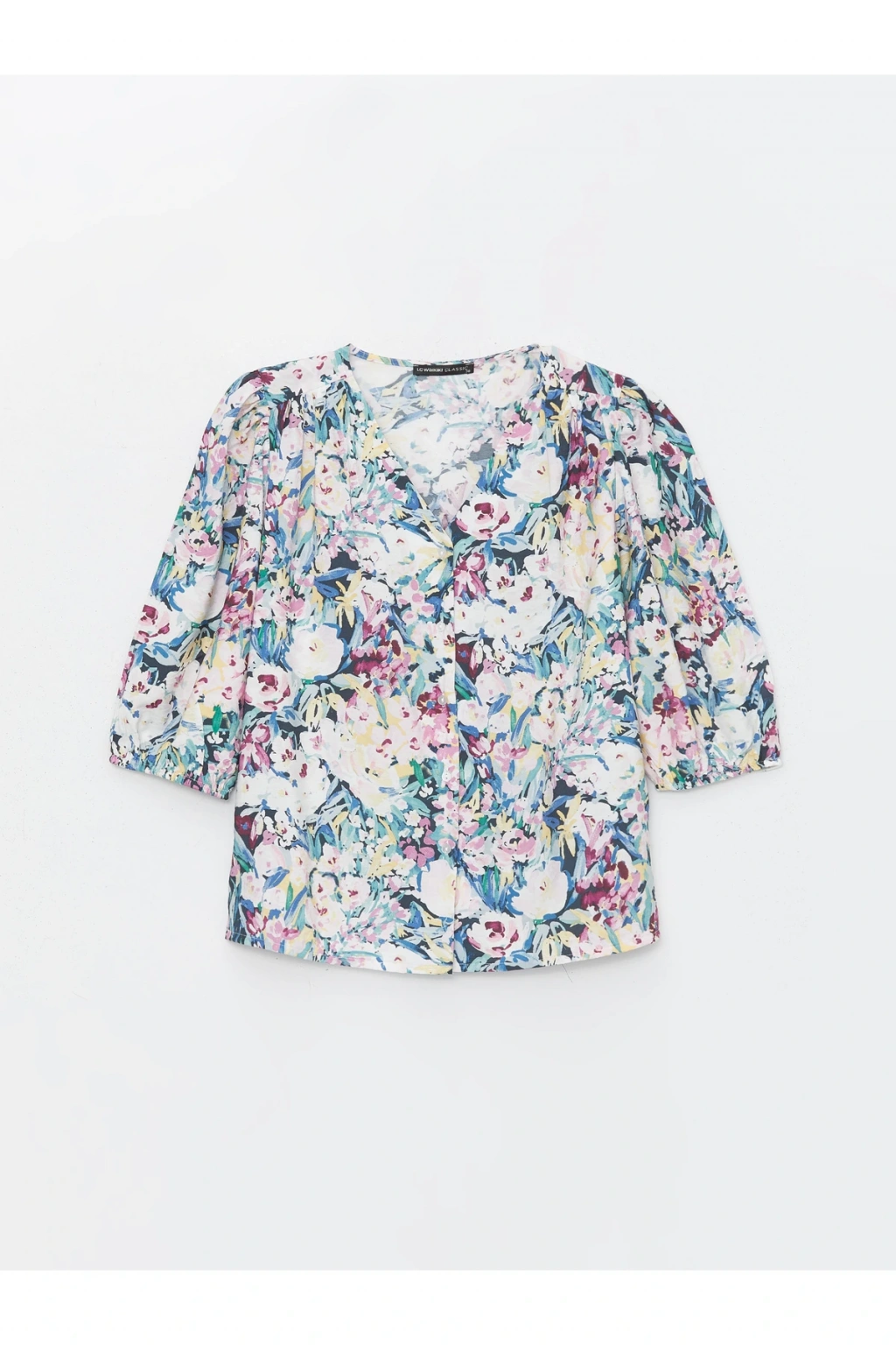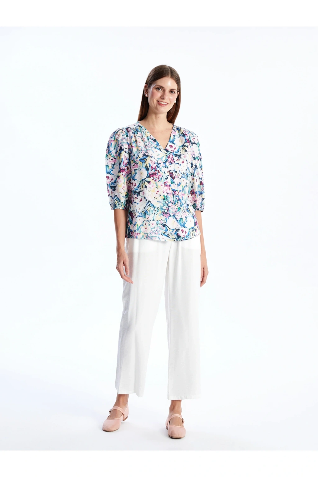 V yaka çiçekli kadın bluz, önden düğme kapamalı tasarımı ile hem şık hem de pratik bir kullanım sunar. Canlı çiçek desenleri, hem iş yerinde hem de günlük kullanımda dikkat çekici bir stil oluşturur.