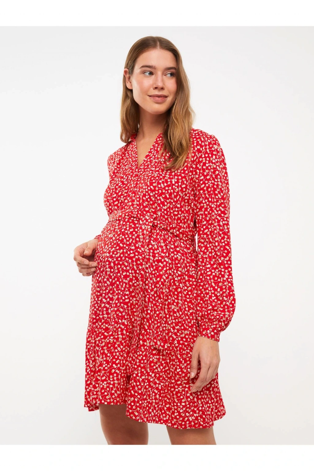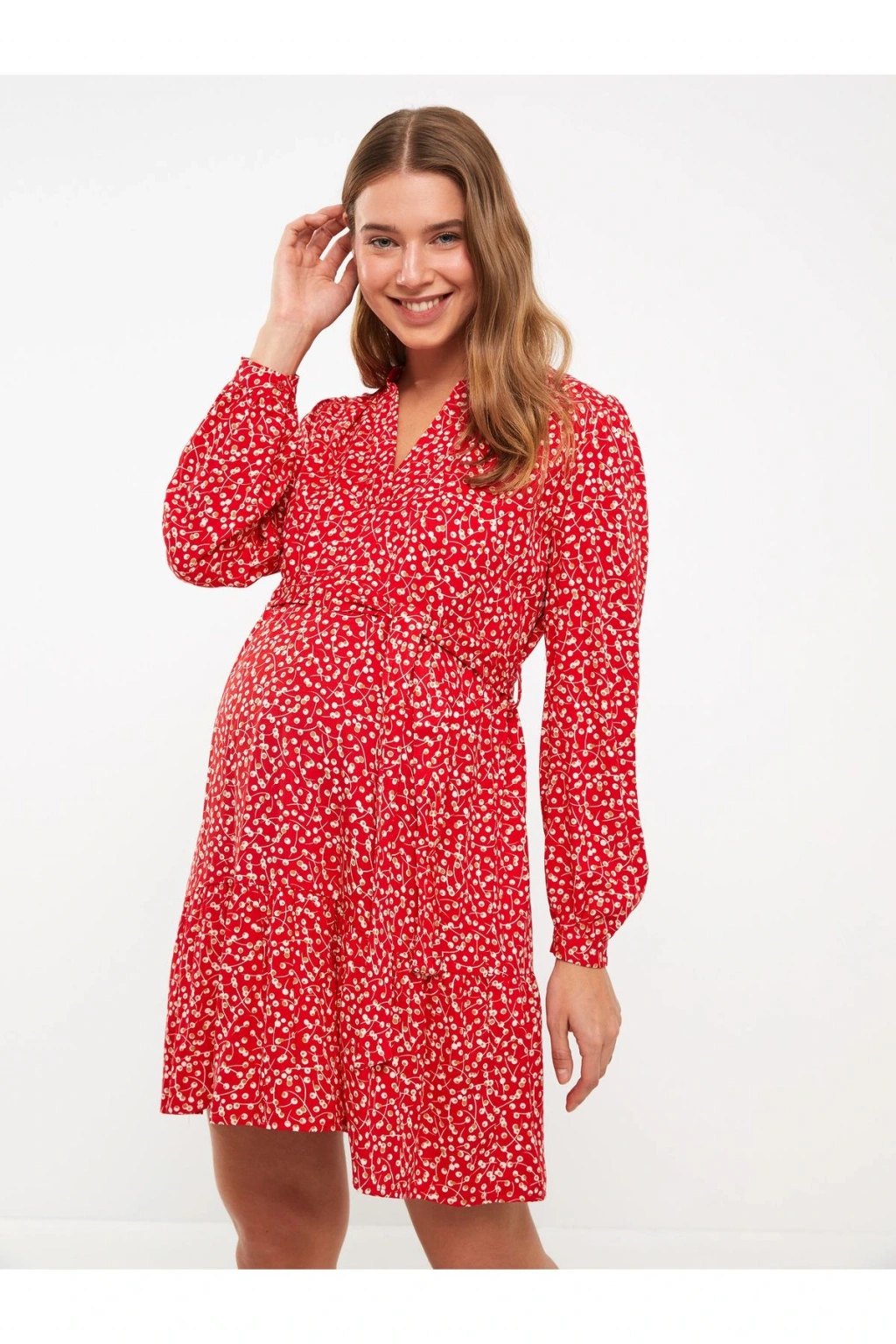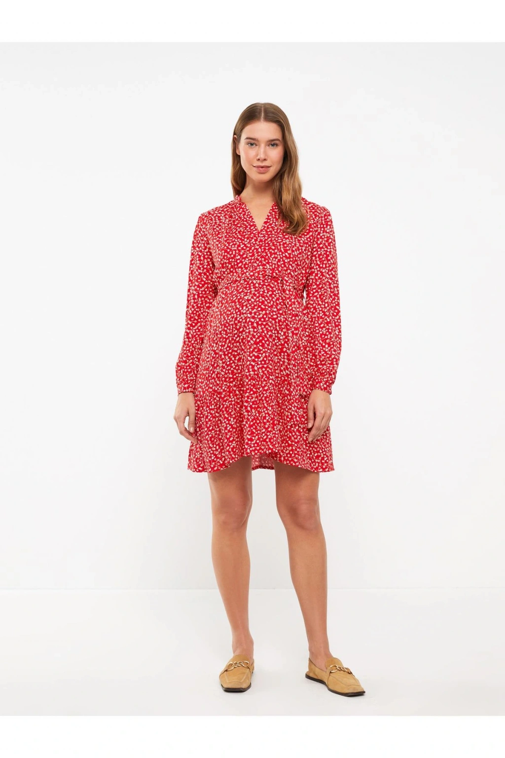 V Yaka Desenli Uzun Kollu Viskon Hamile Elbise