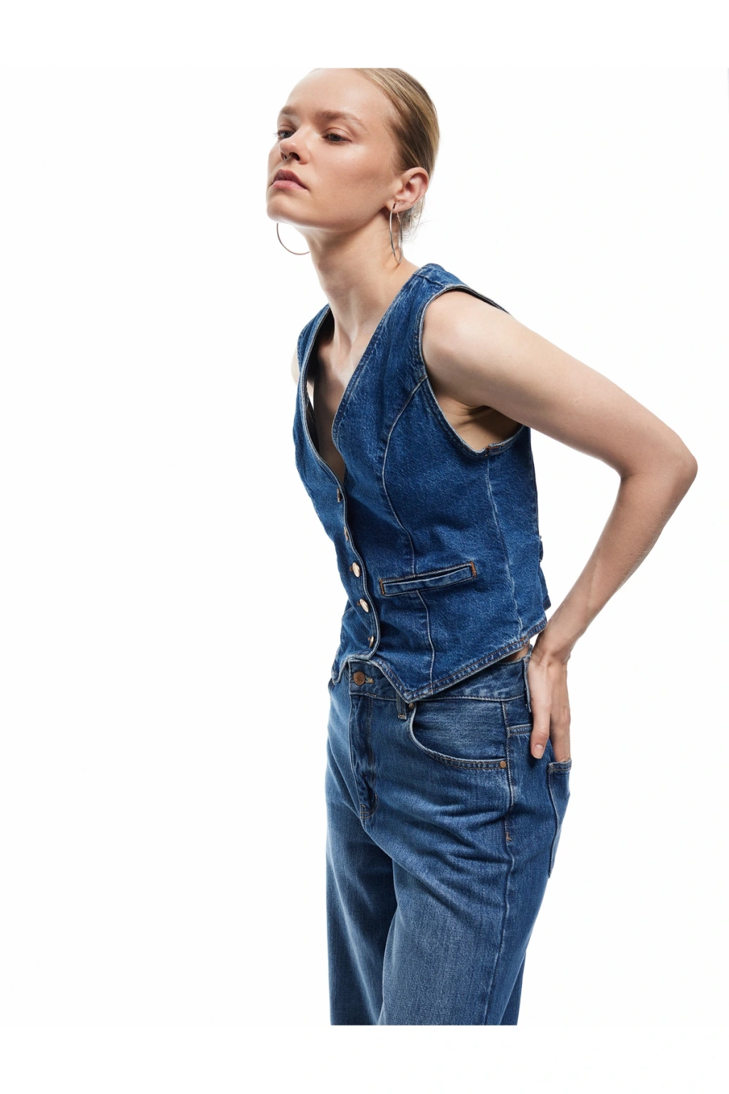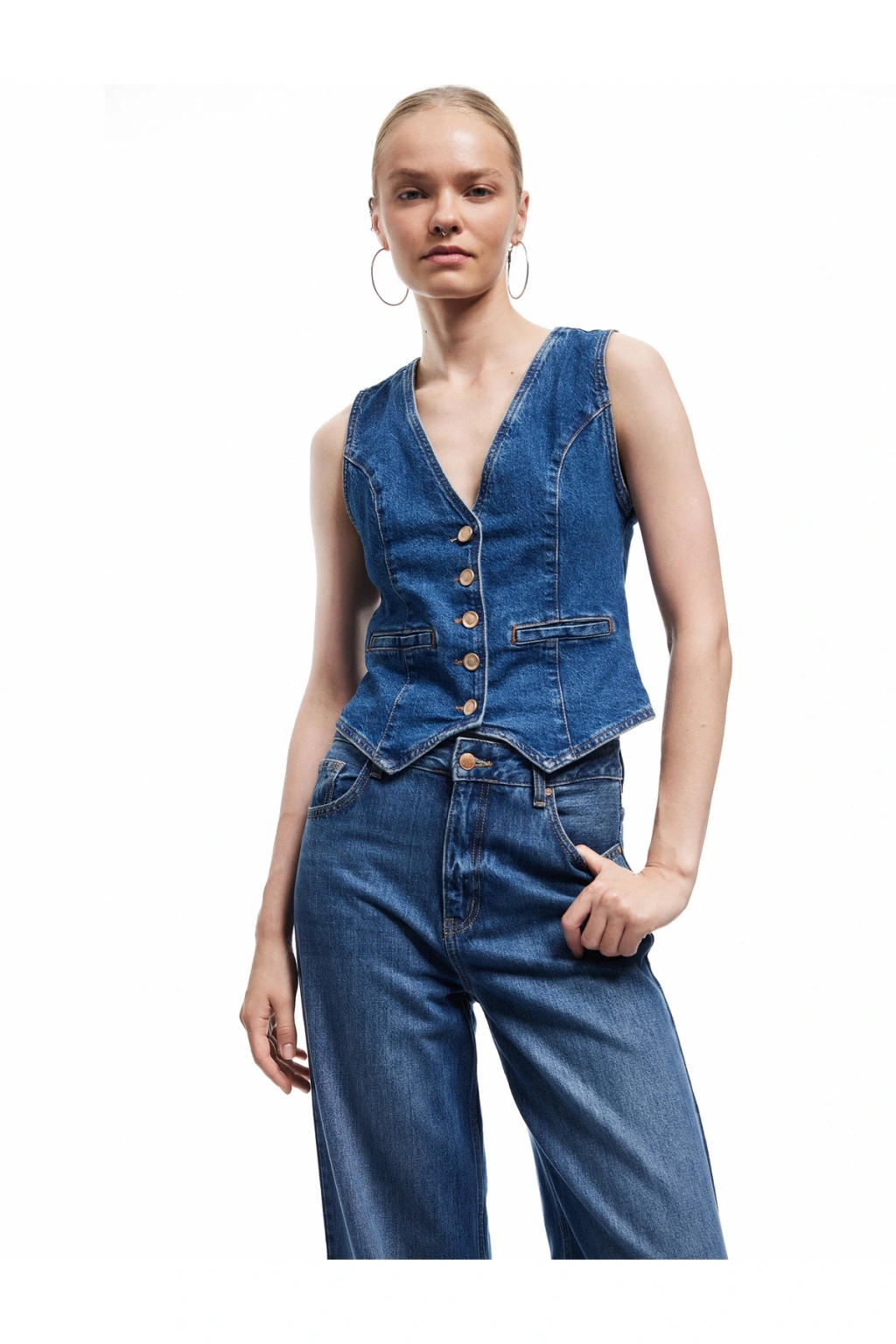 Stil ÖnerisiV yaka denim yelek, basic tişörtler ve skinny jean pantolonlarla mükemmel bir uyum sağlıyor. Günlük stilinizi sneakers ile tamamlayarak rahat bir görünüm elde edebilirsiniz. Şık bir akşam yemeği için ise topuklu ayakkabılar ve zarif bir aksesuarla kombinleyerek iddialı bir duruş elde edebilirsiniz.