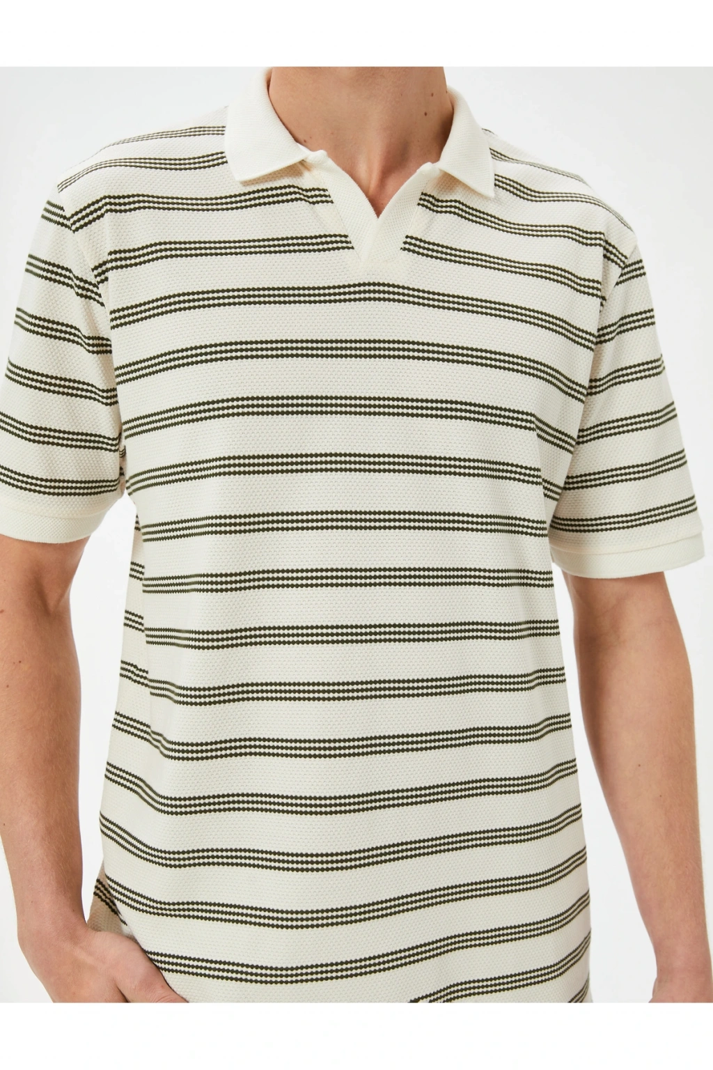 V Yaka Polo Tişört Dokulu Kısa Kollu Pamuklu