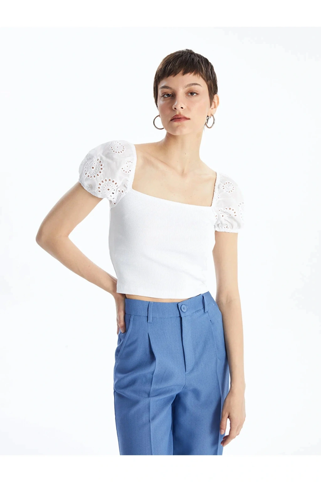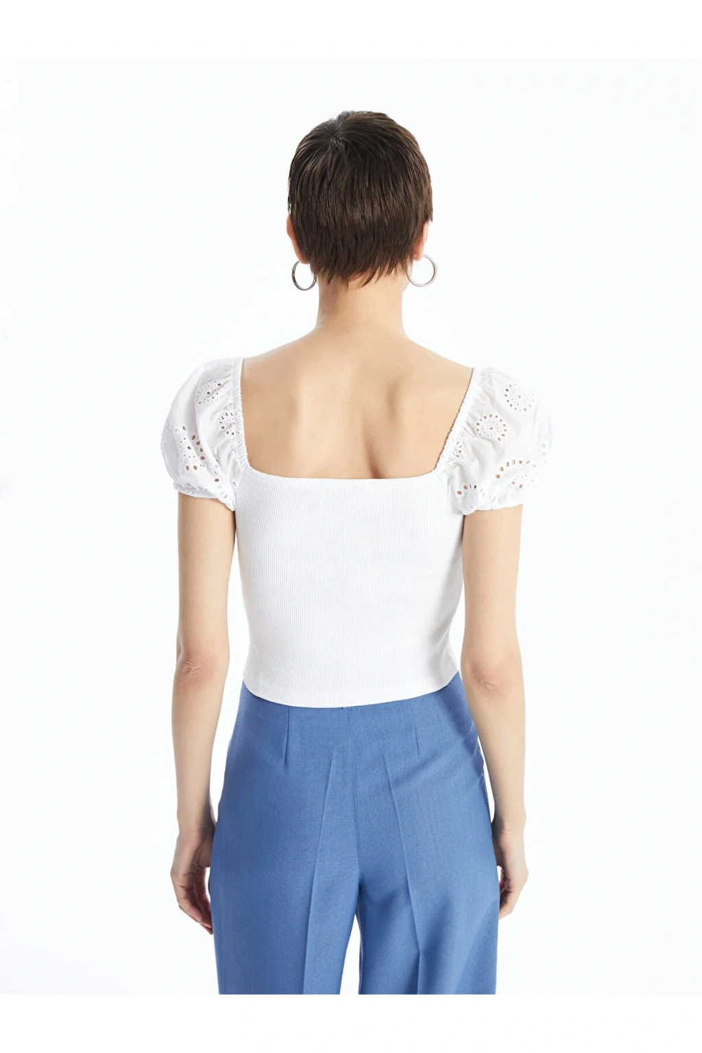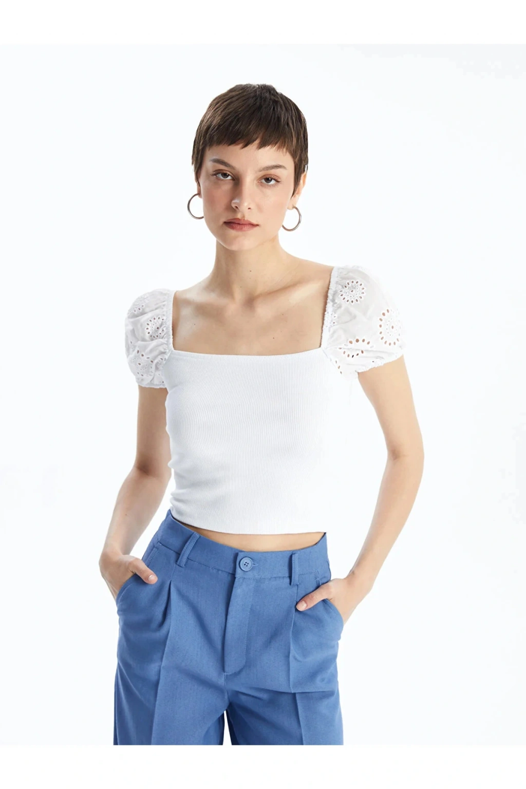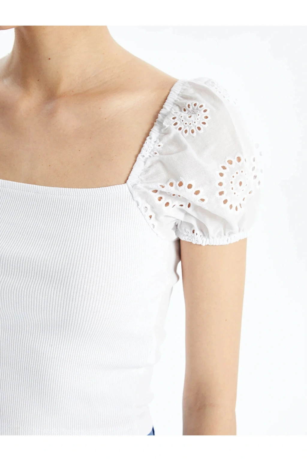Ürün Açıklaması Kare yaka düz kısa kollu crop, kaşkorse kumaştan üretilmiştir. Bu sayede vücudu saran sıkı ve esnek bir yapısı bulunur. Brode kumaştan üretilen kolları crop üste hareket katar. ; Manken Bilgisi Göğüs: 85 cm Bel: 61 cm Basen: 90 cm Boy: 179 cm Manken S beden ürün giyiyor. Ürün İçeriği ve Özellikleri Ürün İçeriği: Ana Kumaş: %98 Pamuk %2 ELASTAN Ürün Özellikleri: Marka: LC Waikiki Kalıp: Ekstra Dar Yaka: Kare Yaka Ürün Tip: Crop Kol Boyu: Kısa Kollu Malzeme: Yüksek Pamuk İçerir Cinsiyet: Kadın Desen: Düz Kumaş: Kaşkorse