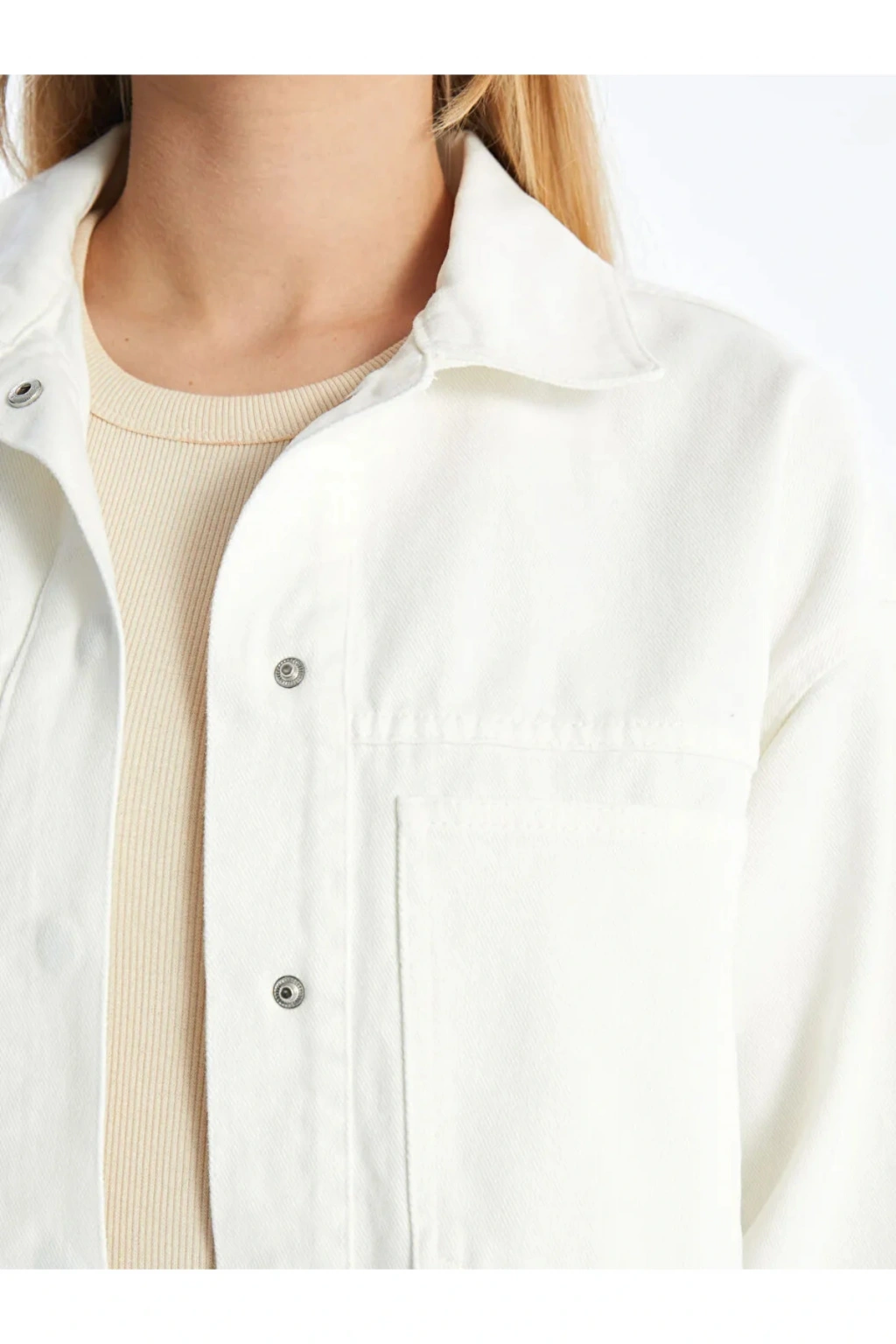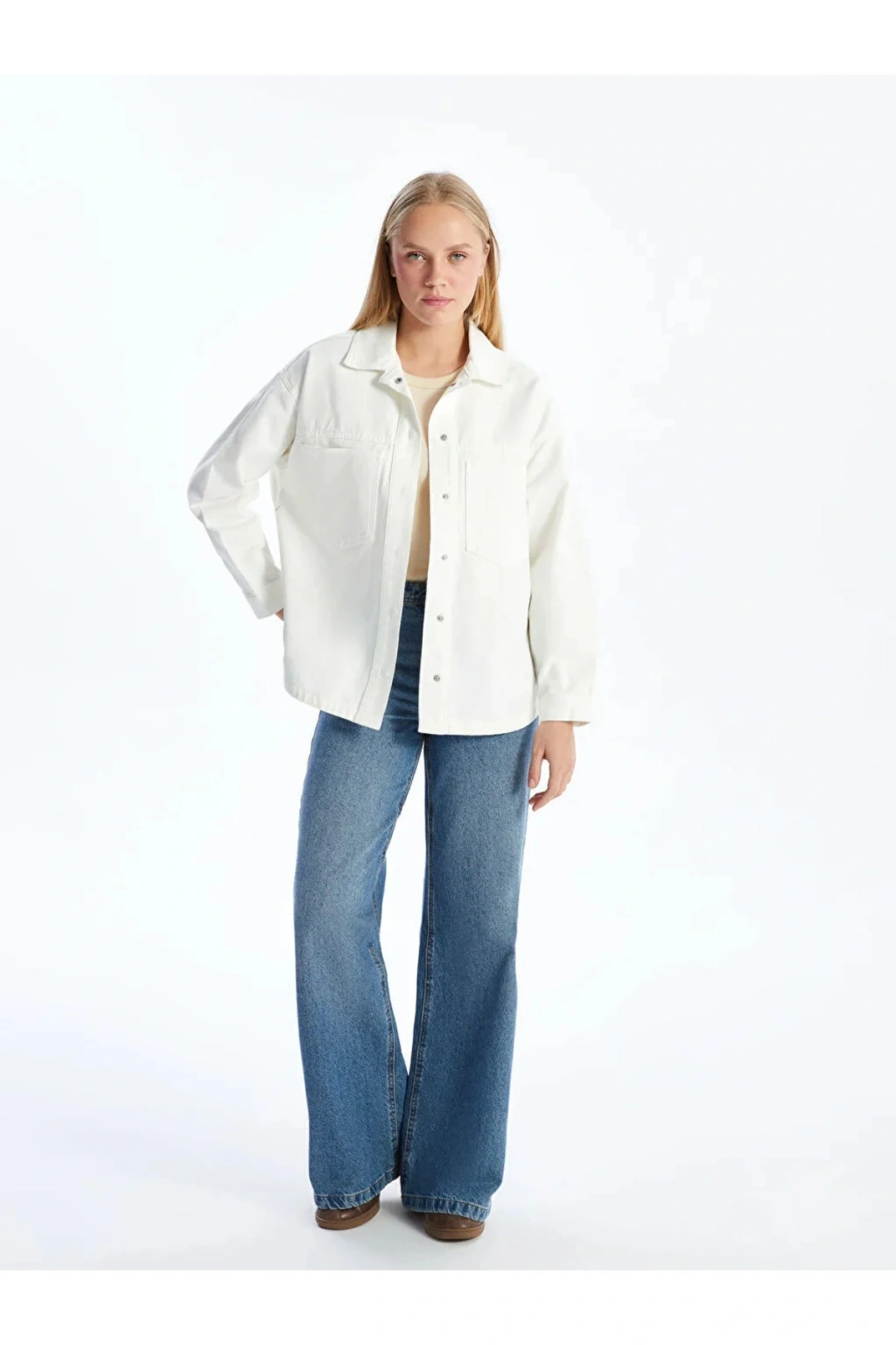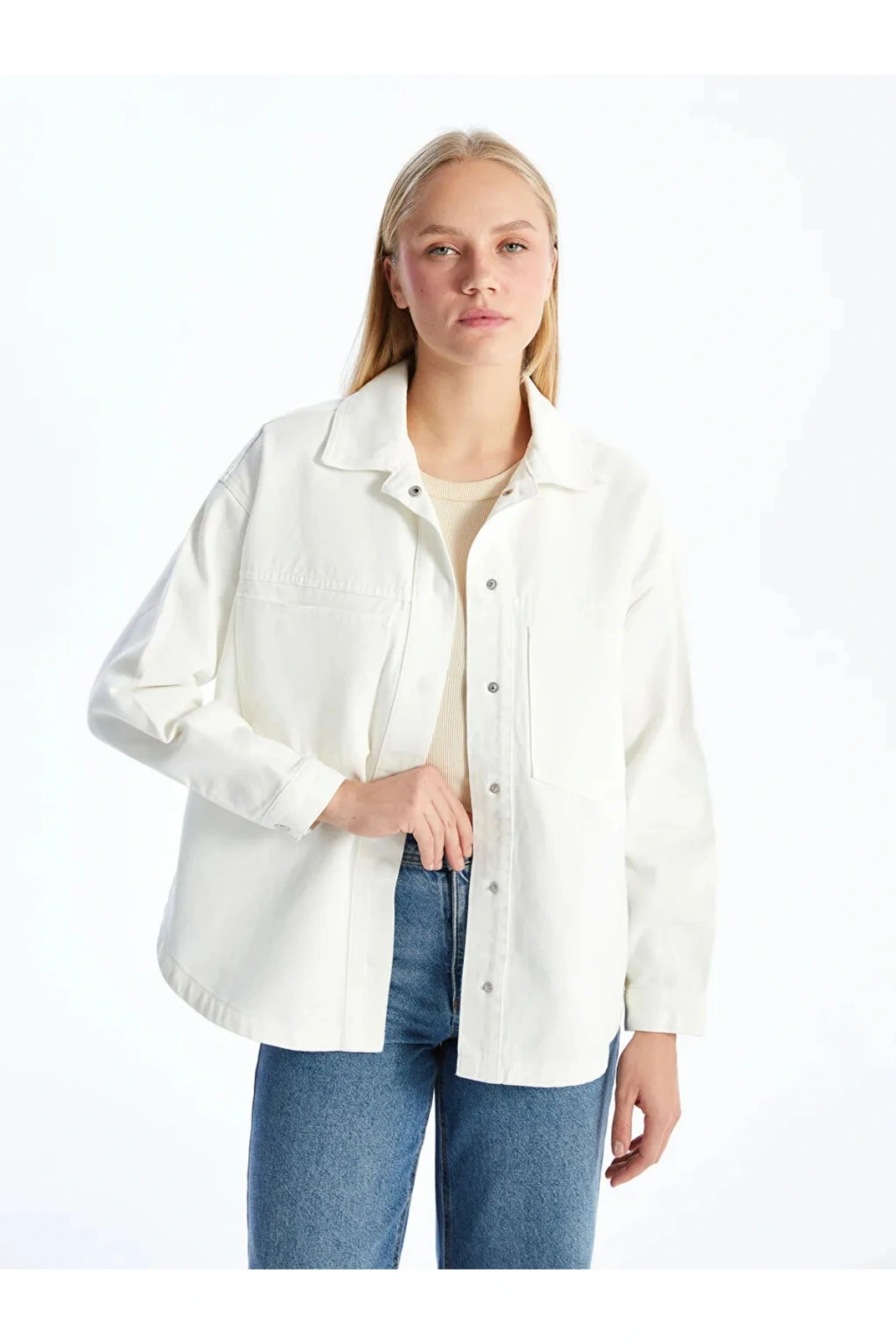 Gömlek yaka düz uzun kollu kadın jean ceket, önden düğme kapamalı ve dört cepli tasarımı ile pratik ve şık bir kullanım sunar. Dayanıklı denim kumaşı sayesinde uzun ömürlü ve rahat bir giyim deneyimi sağlar.